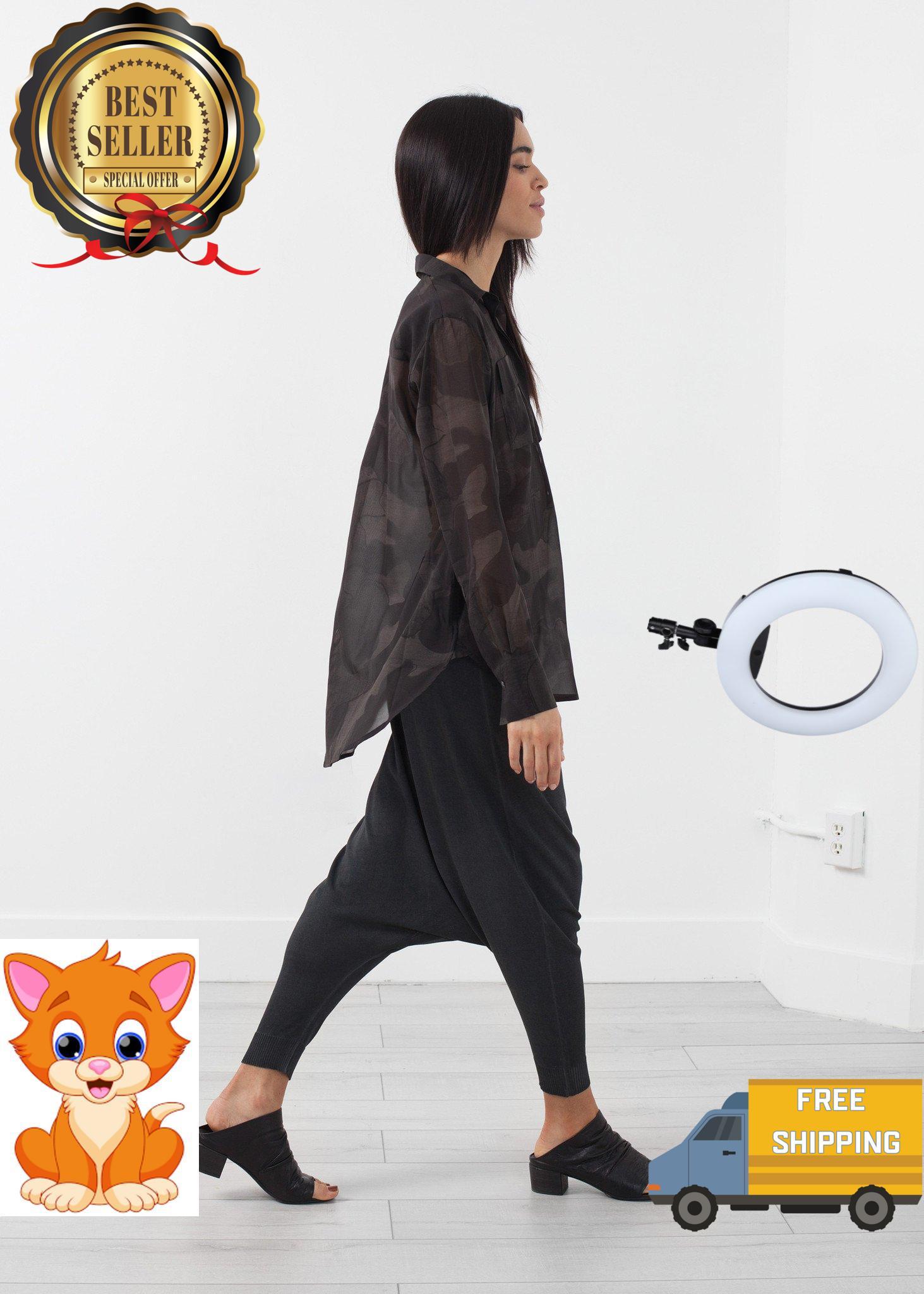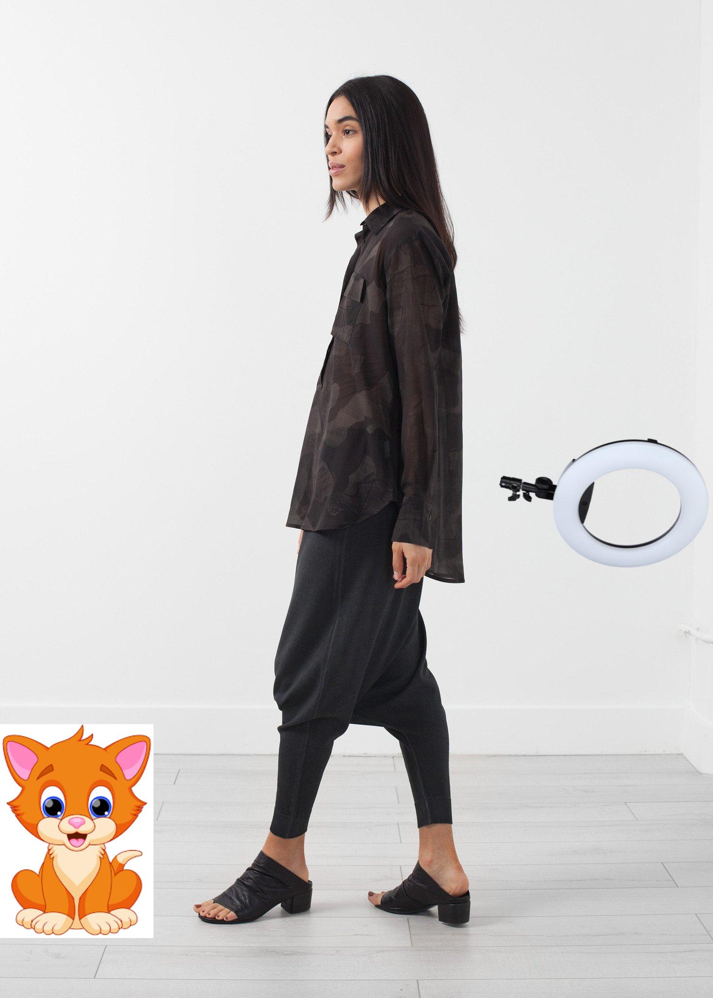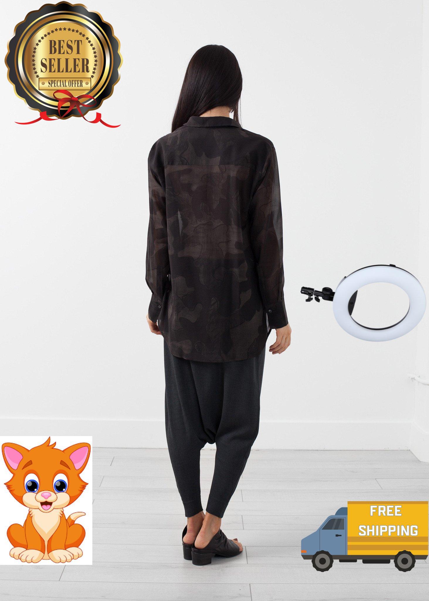 Barely sheer with hints of camo inspiration, the Corazon from Lareida presents spunk to a polished look. Covered button placket at front. Double breasted pockets at front. Lareida. Color Camo. 92% Silk, 8% Elastane. Made in Italy. Ashley is wearing a 36.