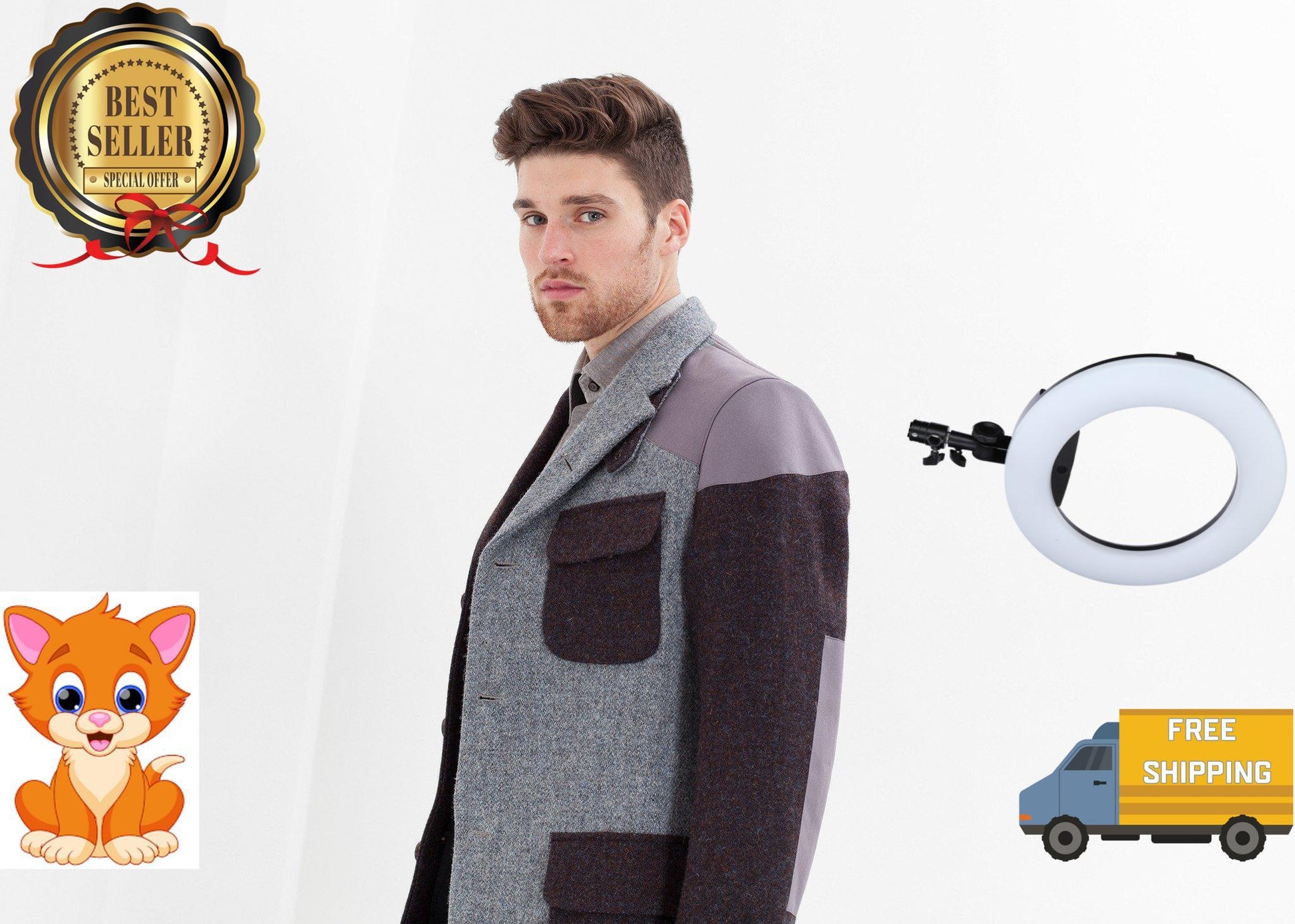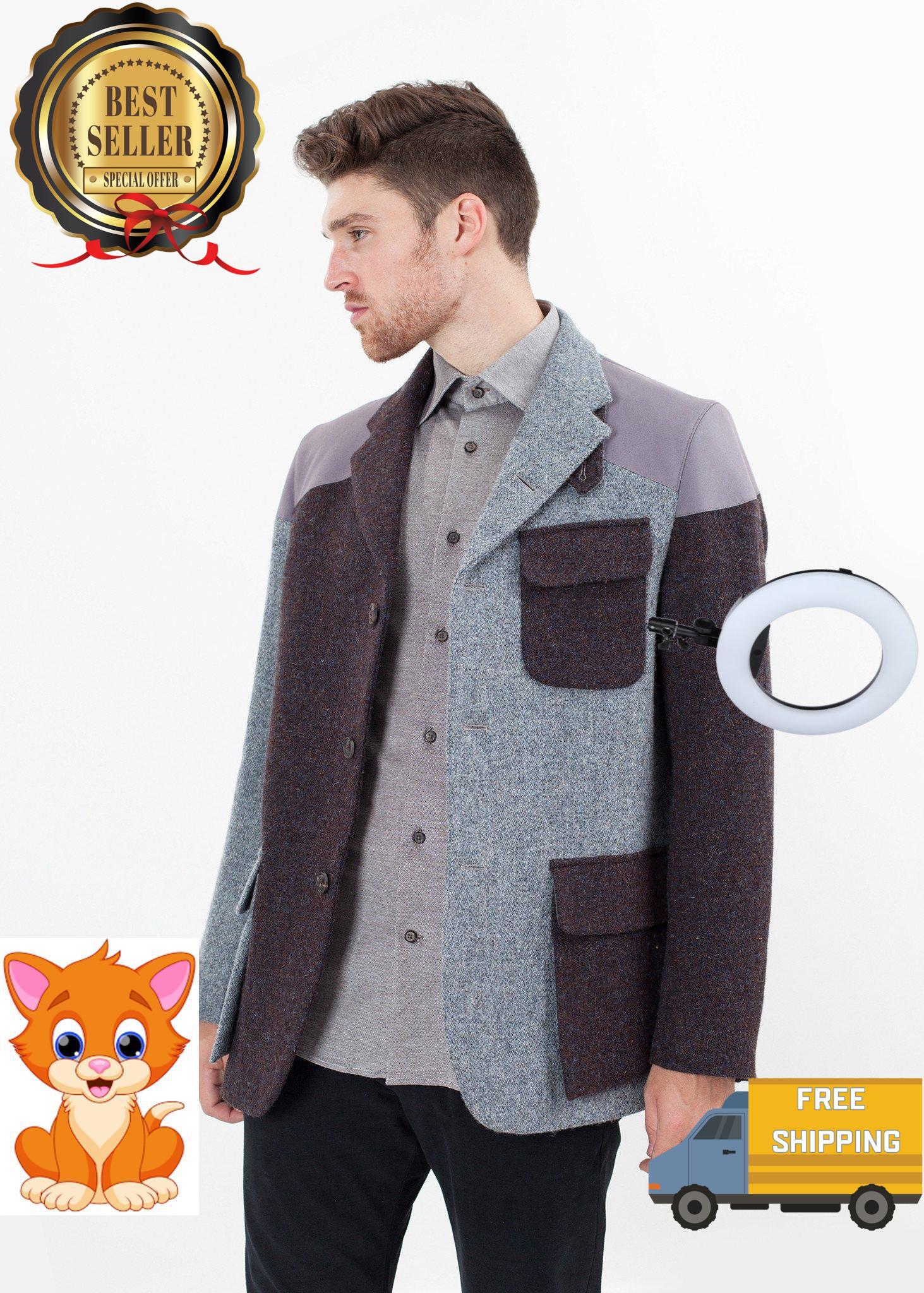 A patchwork of contrasting Harris Tweed signatures this jacket by Nigel Cabourn. Featuring a notched lapel, four button front opening with two large front patch pockets and a smaller chest pocket. Shoulder and elbow patches are water and wind resistant. Back vented hem. Color Blue Mix. Outer 100% Wool & Cotton, Inner 100% Viscose & Cotton. Spencer is wearing an Italian 50.