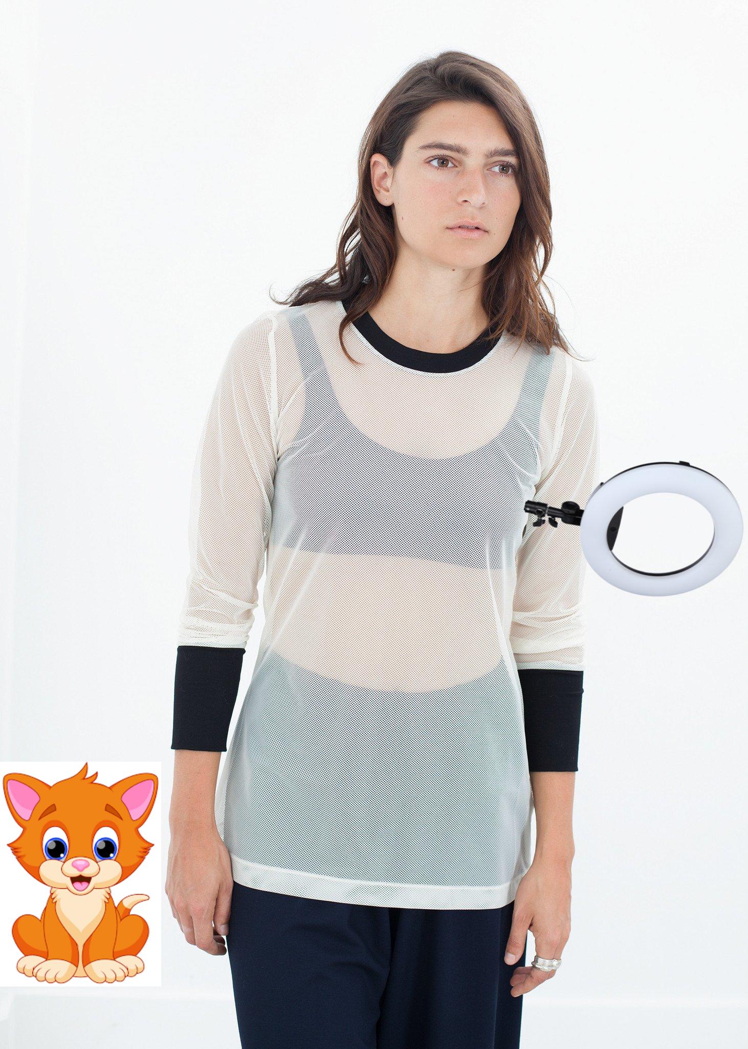 A fun take on the usual crew neck sweater, the ribbing at collar and cuff contrast the stiff mesh body, which promises never to stretch out and lose it's shape. Color Cream/Black. 100% Polyamide. Lana is wearing a size 2.