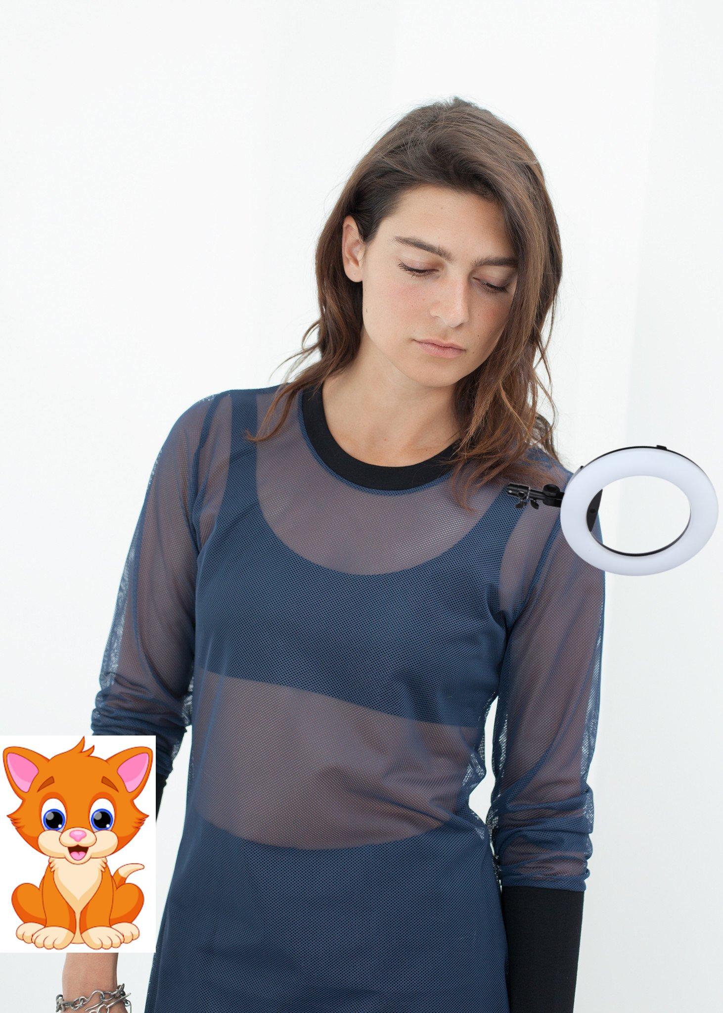 A fun take on the usual crew neck sweater, the ribbing at collar and cuff contrast the stiff mesh body, which promises never to stretch out and lose it's shape. Color Navy/Black. 100% Polyamide. Lana is wearing a size 2.