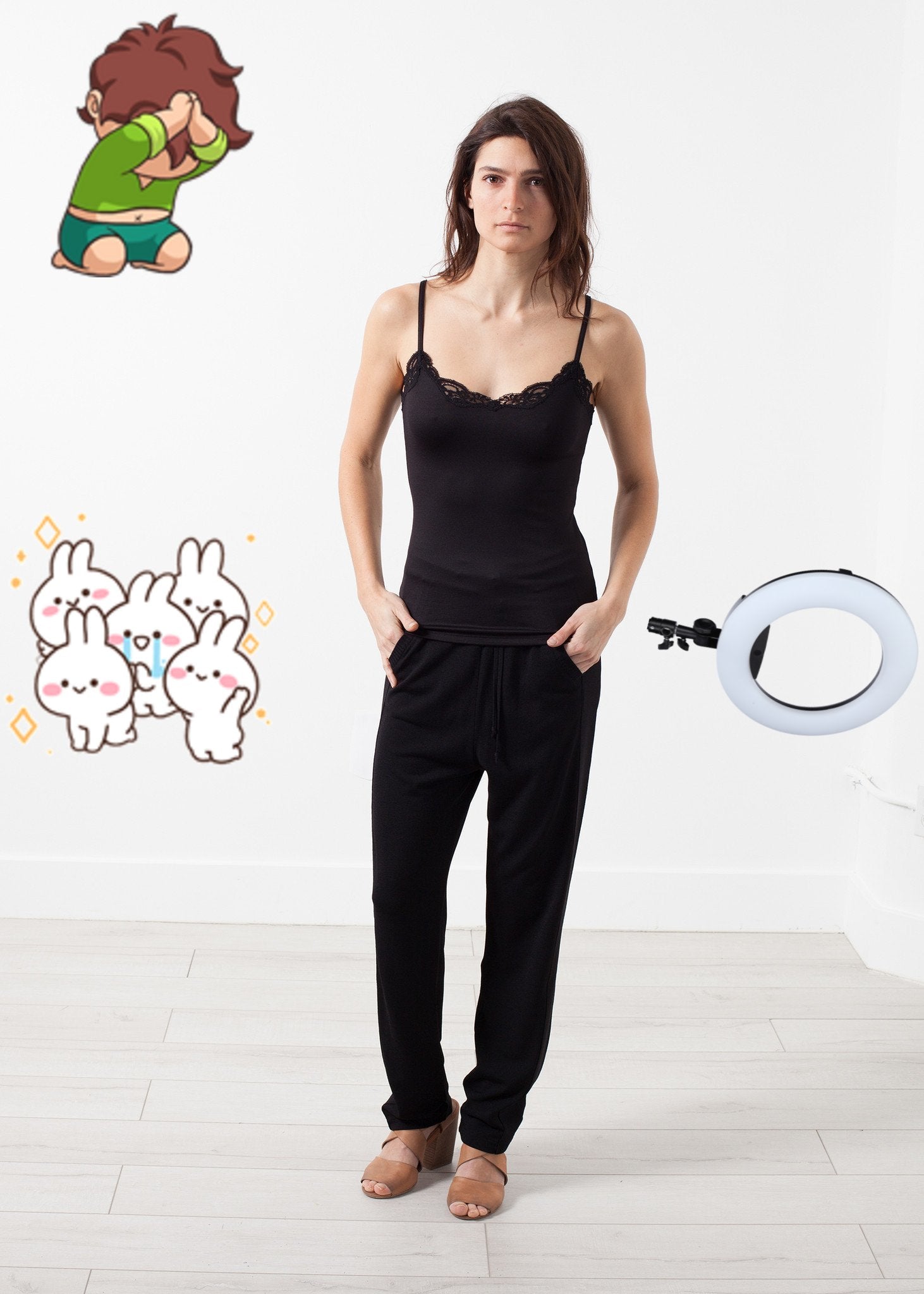 Lace trim accentuates the neckline of this lightweight Camisole by Only Hearts. Color Black. 90% Nylon, 10% Lycra. Made in U.S.A. Lana is wearing a Small.