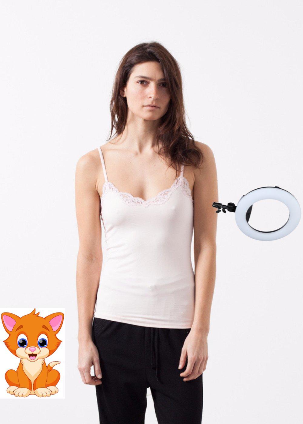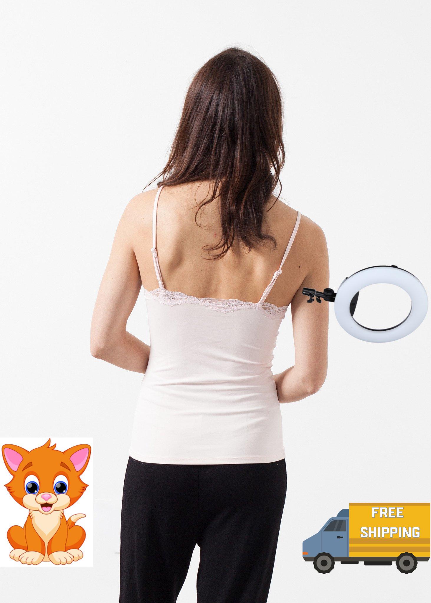 Lace trim accentuates the neckline of this lightweight Camisole by Only Hearts. Color Light Pink. 90% Nylon, 10% Lycra .Made in U.S.A. Lana is wearing a Small.