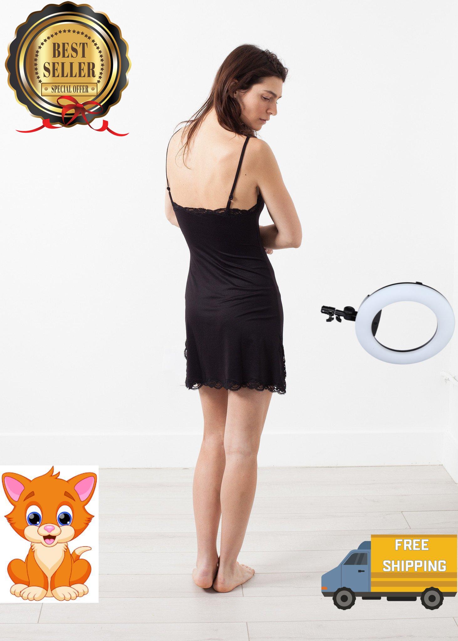 Lace trim accentuates the neckline of this lightweight Slip by Only Hearts. Color Black. 90% Nylon, 10% Lycra. Made in U.S.A. Lana is wearing a Small.
