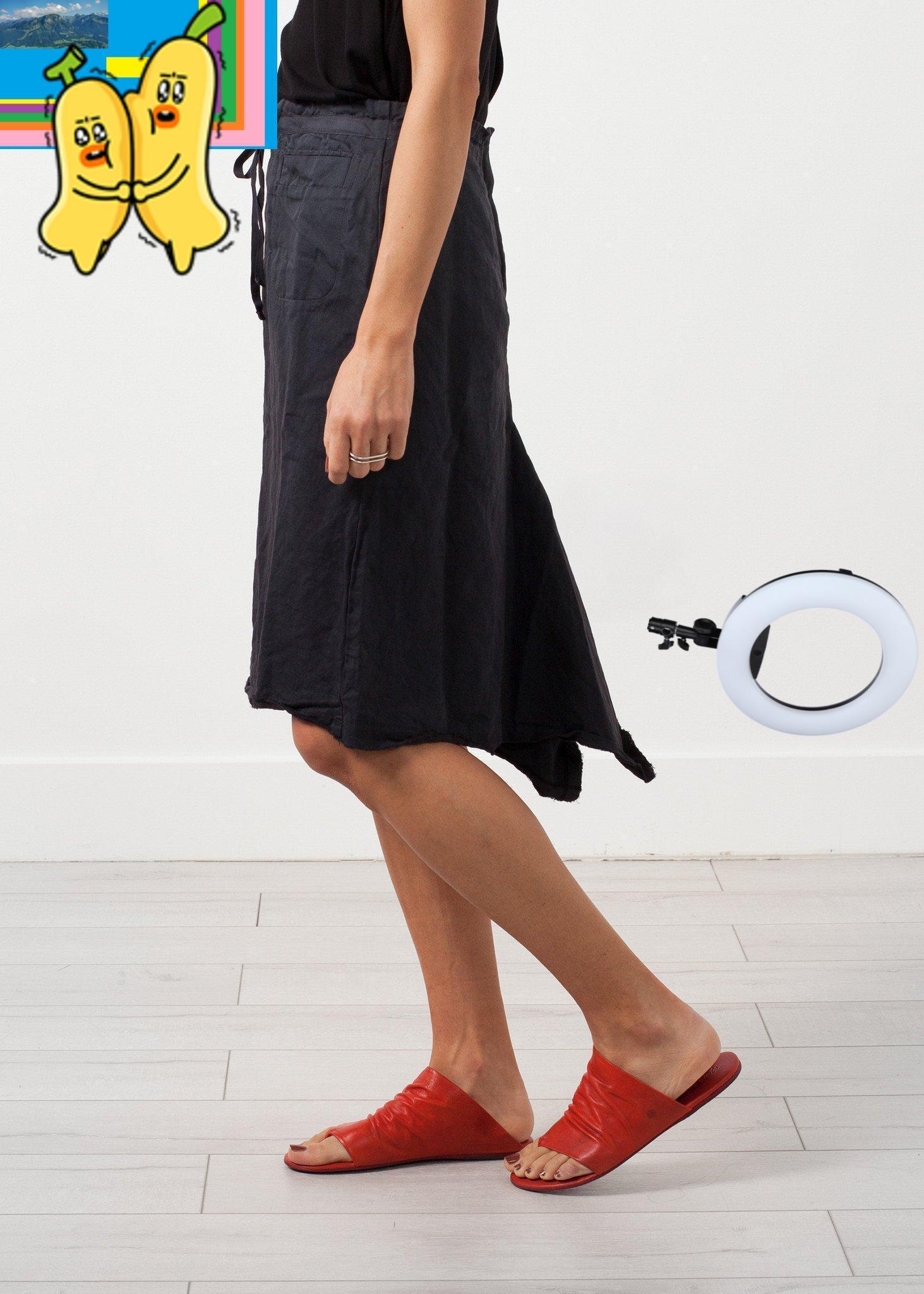 The Double Pocket Skirt is a fantastic travel staple with its linen structure and cotton comfort. Slightly flared at hem, knee length. Front bucket pockets and drawstring waistband. Single snap button closer with zip fly at center back. Kristensen du Nord. Color Rock. 53% Cotton, 47% Linen, Pockets 100% Cotton. Made in Italy. Ashley is wearing a Size 1.
