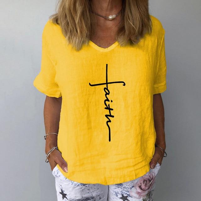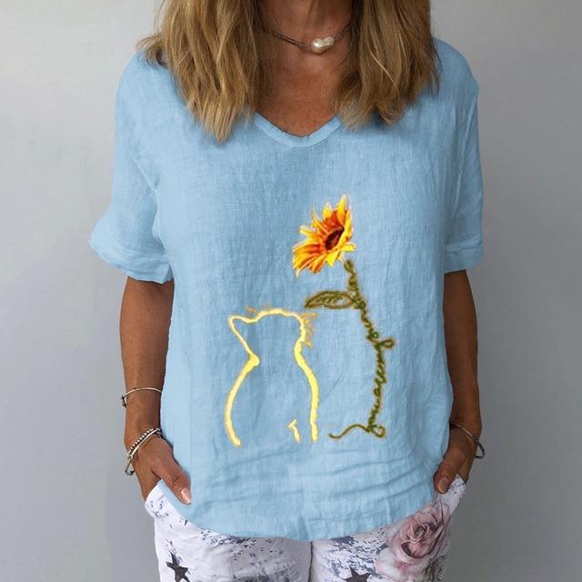 Elegant Linen Cotton Women Loose Shirt Summer V Neck Short Sleeve Blouse Shirts Casual Floral Print Ladies Tops Blusa Pullovers