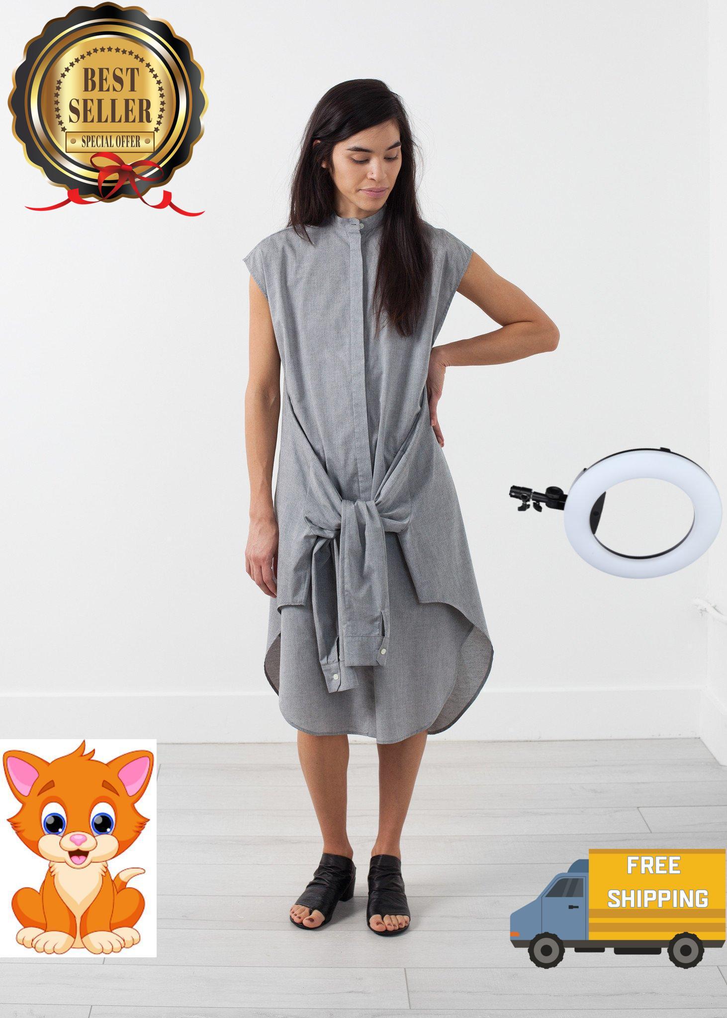 The Embrace Tunic is a one of a kind statement. Sleeve tie at waist can be worn tied or untied. Mandarin collar. Angled pockets at front. Covered placket button closure at front. Shirttail hem. Color Grey. Sayaka Davis. 100% Cotton. Made in U.S.A. Ashley is wearing a Size 2.