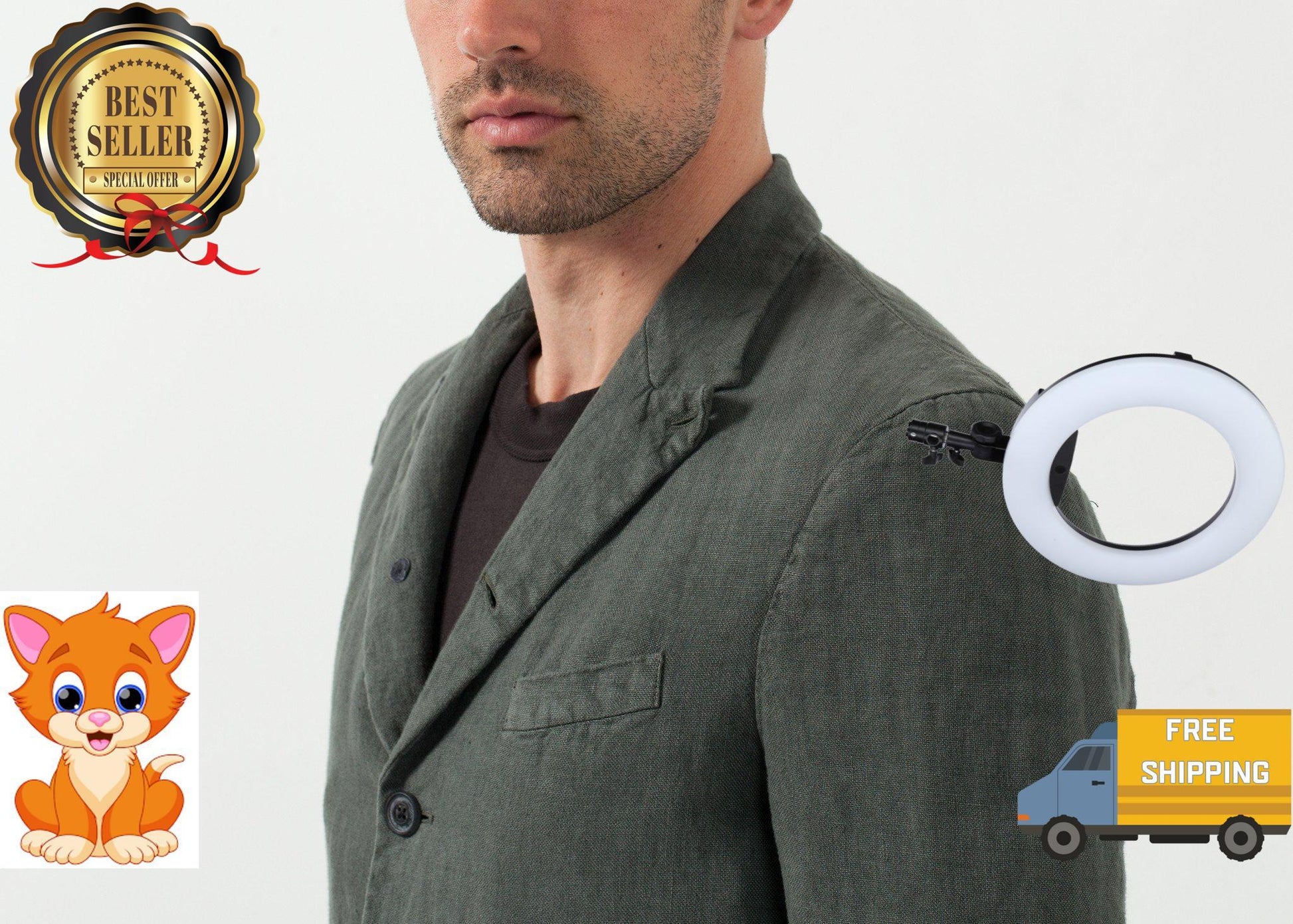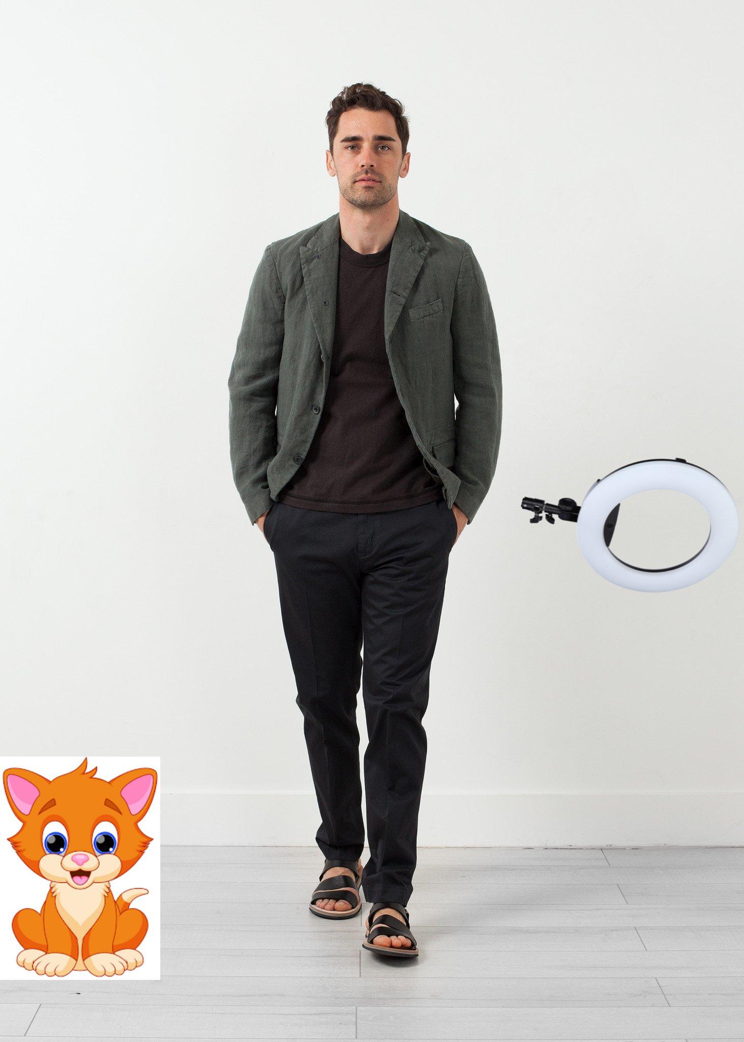 The Five Button Blazer is elegant, yet casual. Industrially strong fabrics combine in a classic silhouette makes a refined look. Button placket closure at center front. Three exterior pockets at front, two interior pockets. Lardini. Color Green. 100% Flax, Jacket Lining 100% Cotton, 60% Acetate, 40% Cotton. Made in Italy. Jacob is wearing a 50.