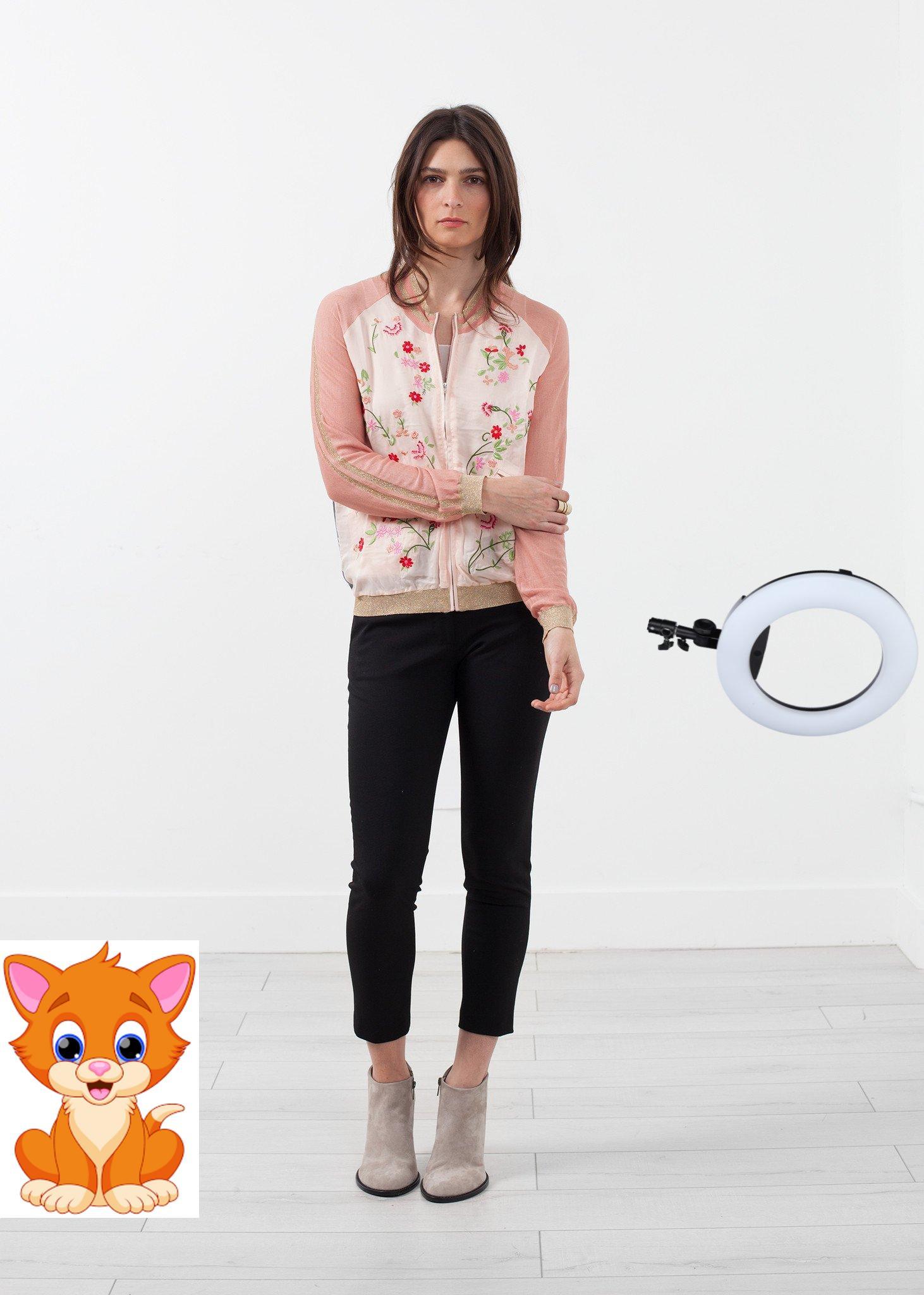 The Frech Sweater is the pretty Letterman's jacket. Zip closure at front placket. Side angled pockets at front. Just in Case. Color Nude. 33% Polyester, 30% Silk, 20% Cotton, 17% Metallic Thread, 2nd Fabric 100% Cupro. Lana is wearing a French 38.