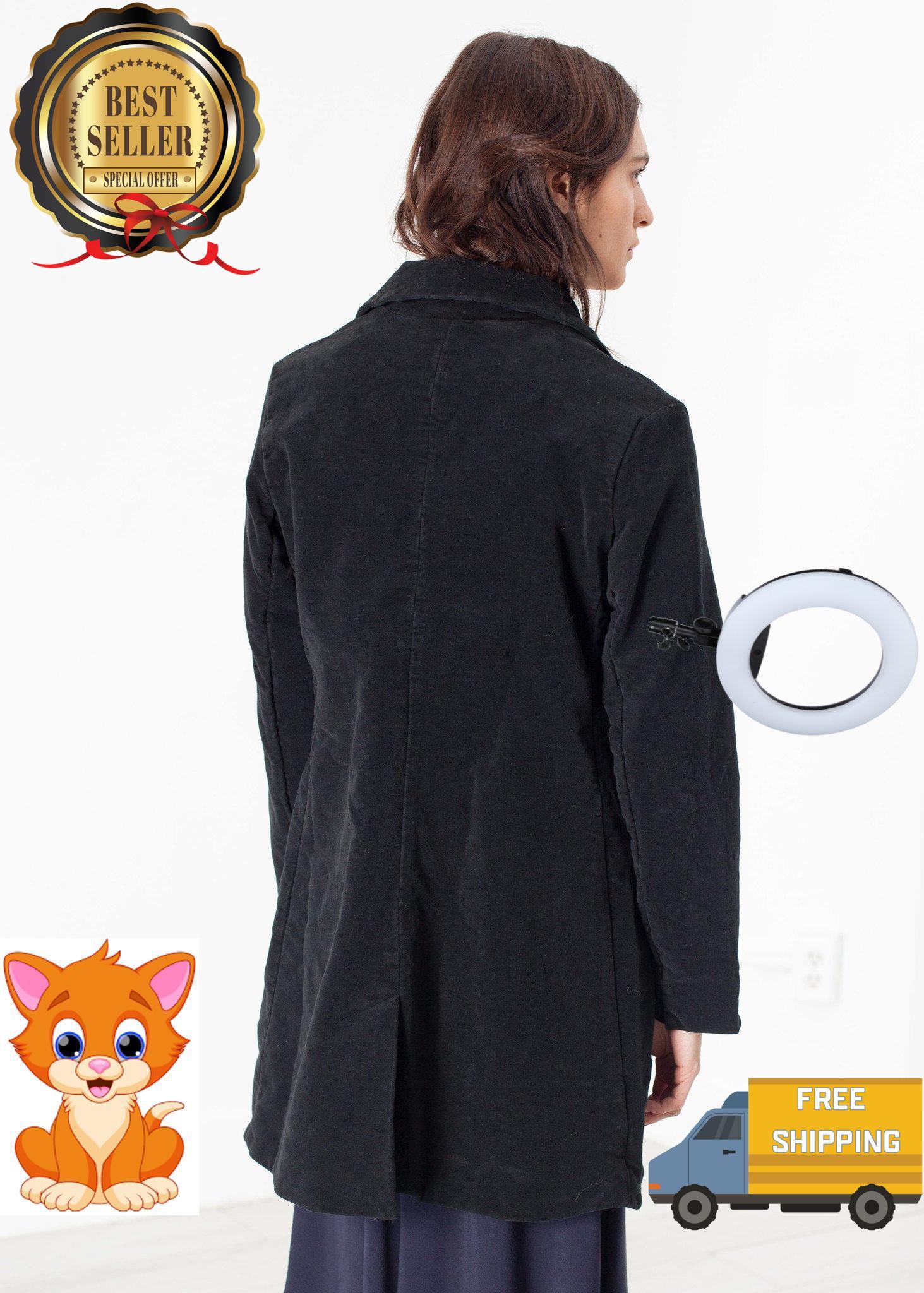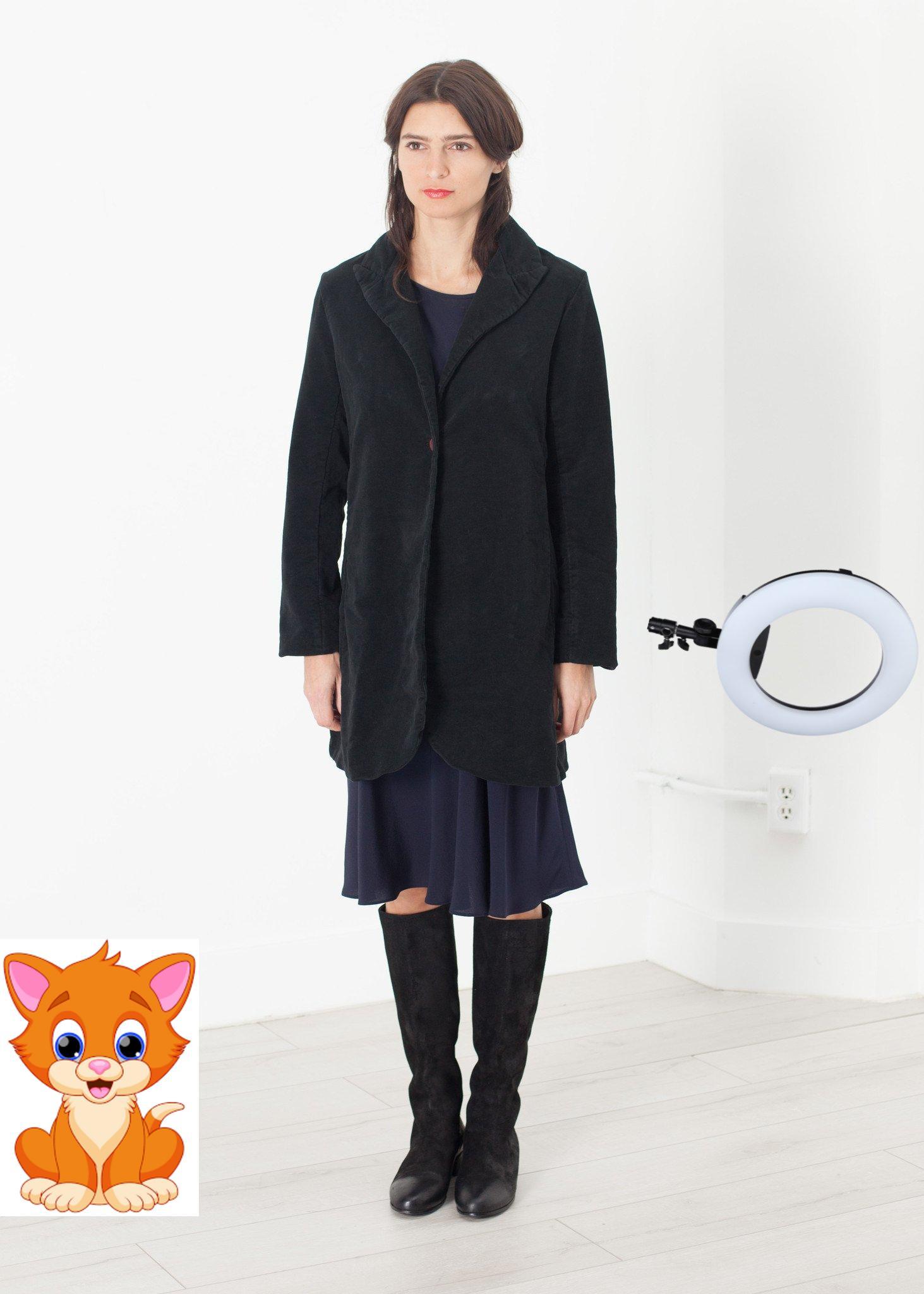 The Griffon Coat by Pip-Squeak Chapeau reinterprets the velvet coat. Single button closure at front placket, pointed lapels, and subtle cuff slits. Color Black. Made in U.S.A. Lana is wearing a Small.