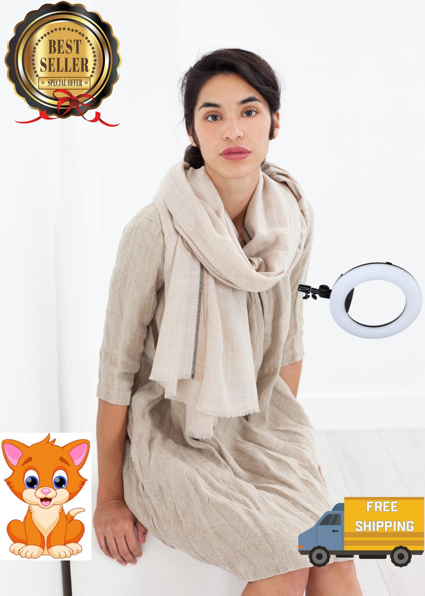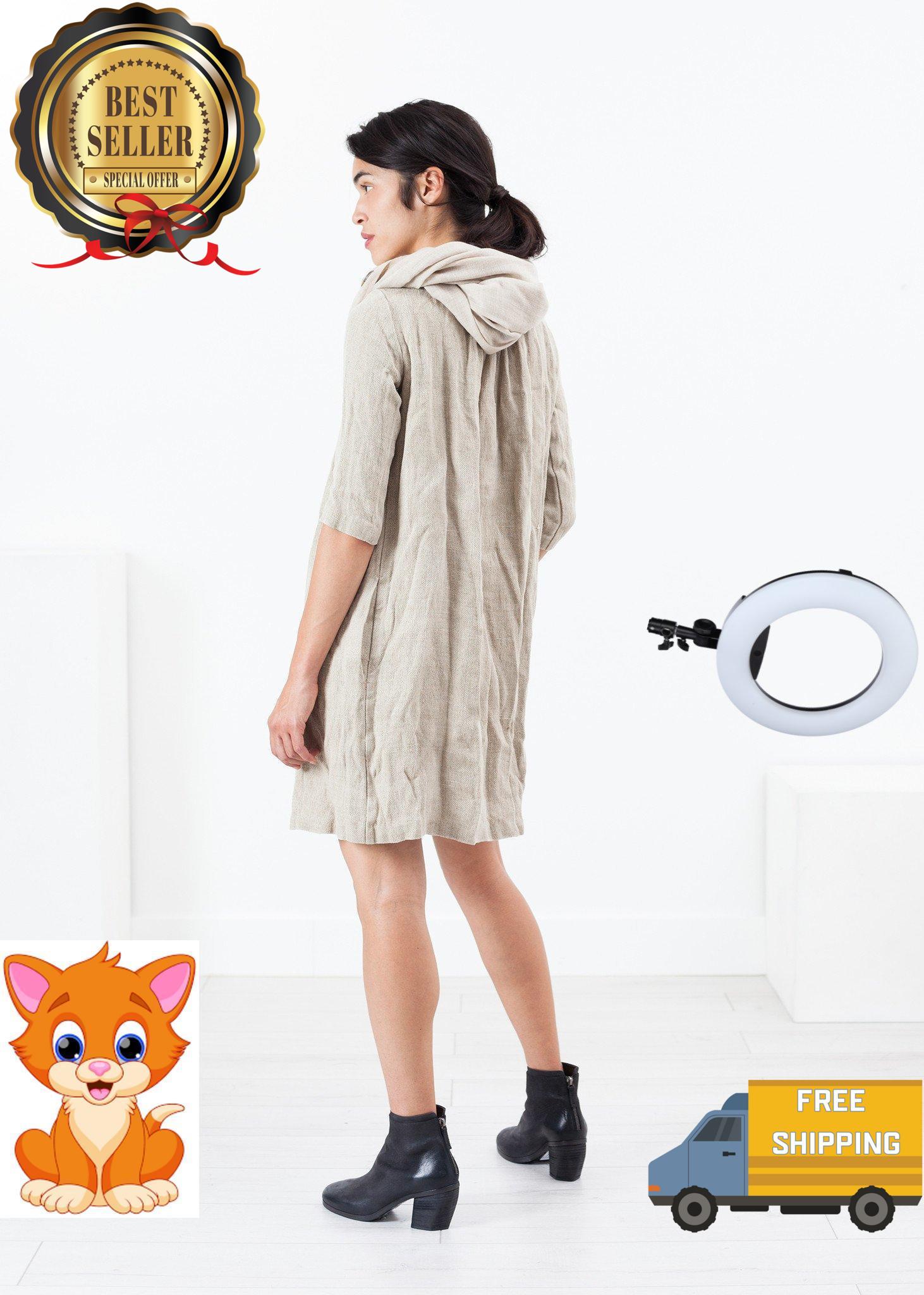 A provincial hemp sack dress gets a simple gathered neckline with red topstitching, three-quarter length sleeves and side pockets. Unlined. Color Natural. 100% Hemp. Ashley is wearing a size 1.