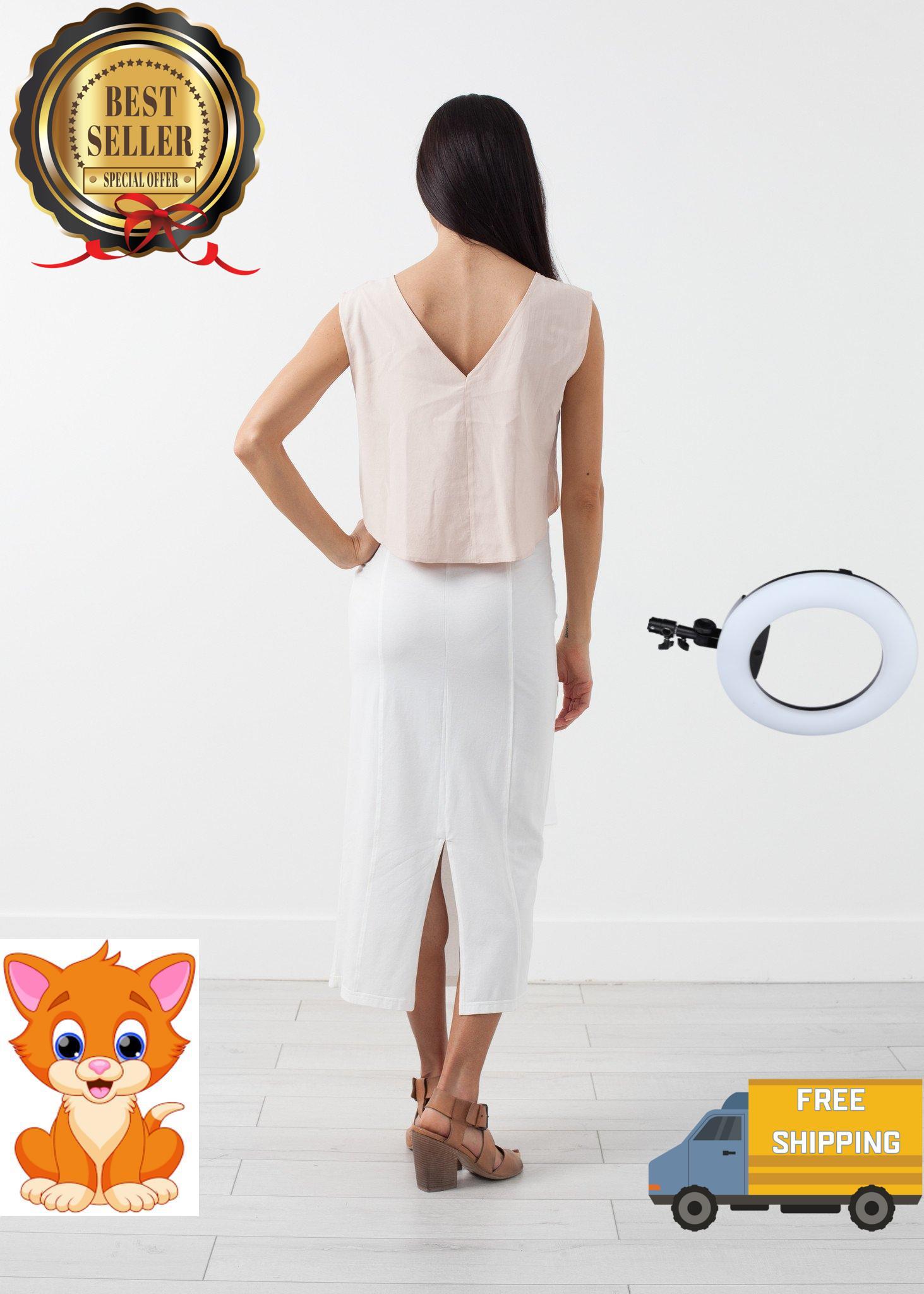 The High Skirt is a slim fit, yet comfortable for every occasion wear. Pencil-like silhouette equates a flattering look. We dare you to wear with anything. Elastic waistband for ease. Ivan Grundahl. Color Off White. 95% Cotton, 5% Elastane. Made in Portugal. Ashley is wearing a Small.