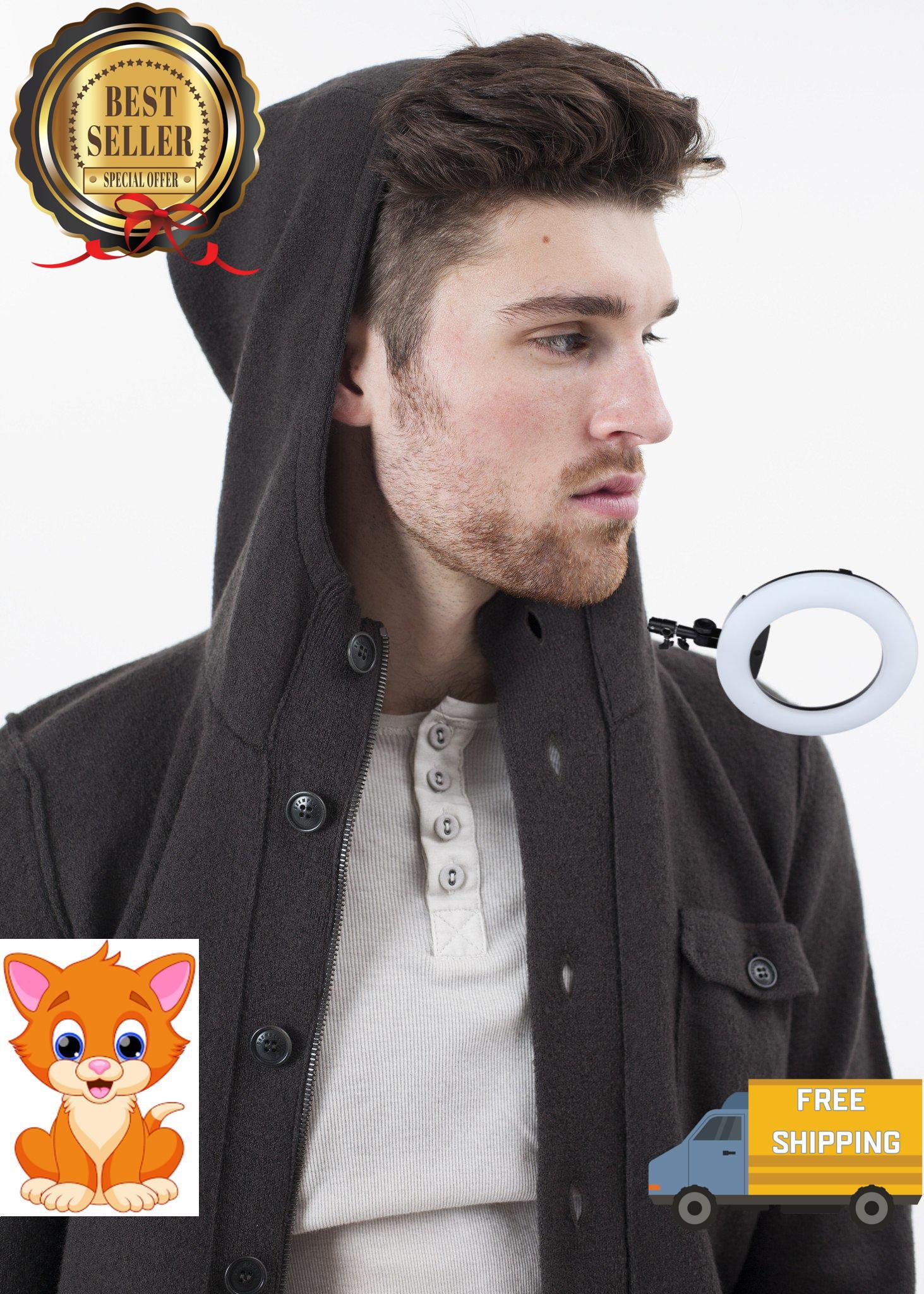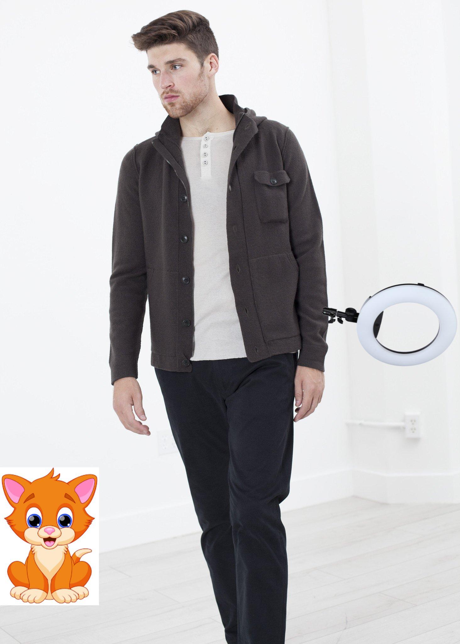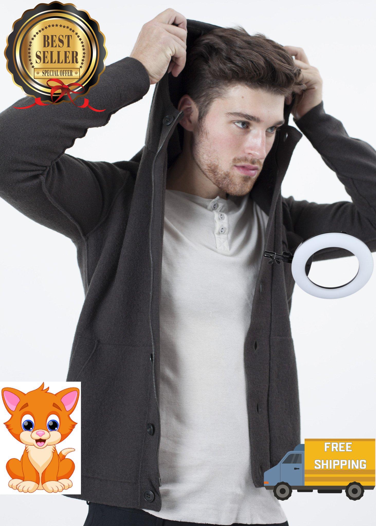 A warm hooded sweater jacket with zip and button closure. A front breast pocket and side angled pockets for your hands. Esemplare. Color Dark Green. 100% Wool. Spencer is wearing a size Large.