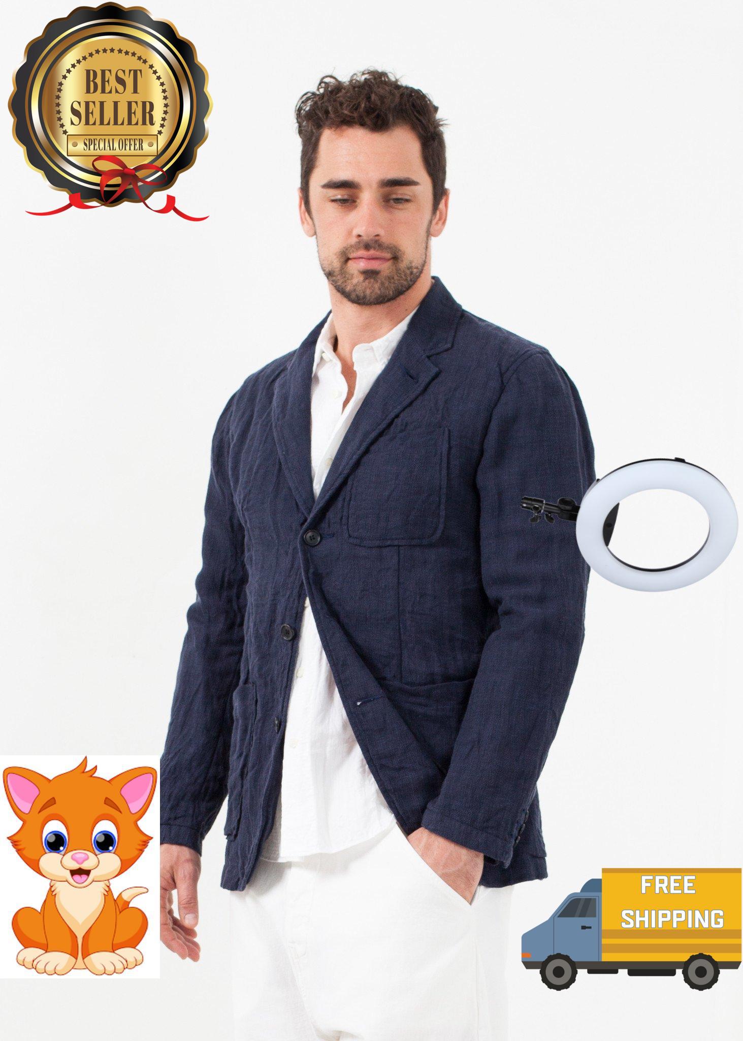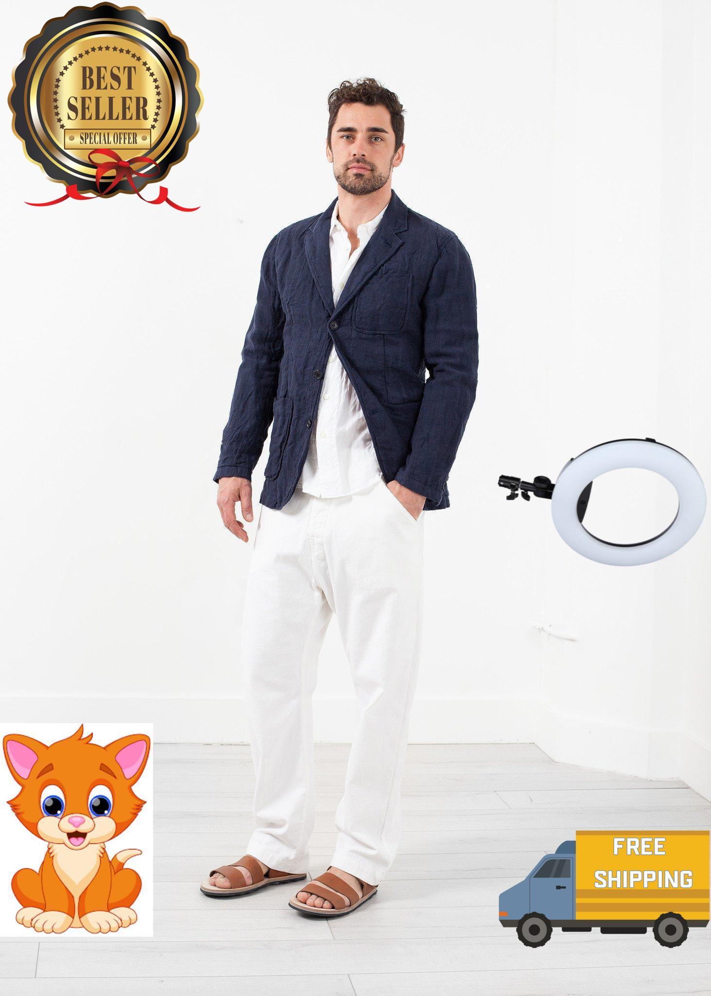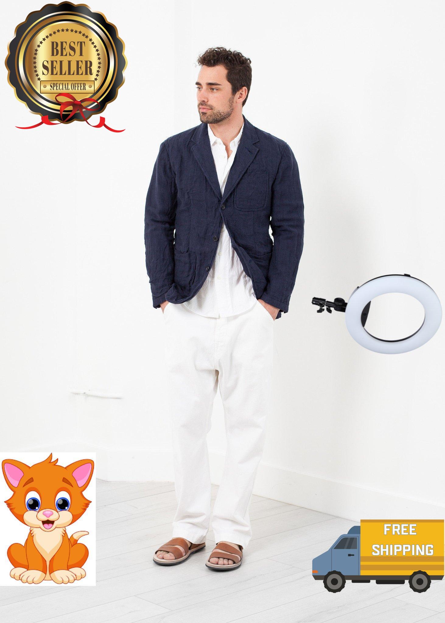 The Floral Lined is ideally versatile with its Hawaiian interior and linen body. Three button closure at front. Three exterior pockets. Fully lined. Sage de Cret. Color Indigo. 56% Linen, 44% Rayon, Lining 100% Cotton. Made in Japan. Jacob is wearing a Medium.