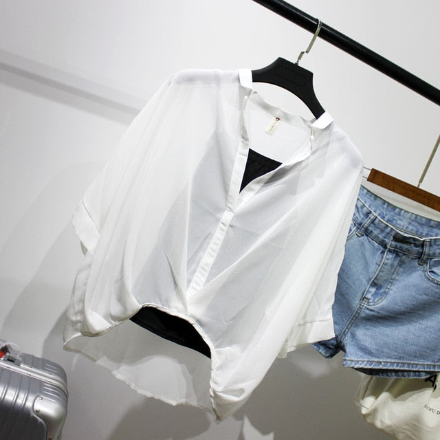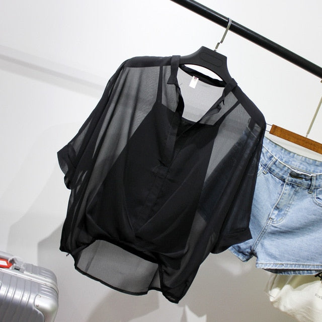 Ladies 2020 Two Piece Set Leopard Chiffon Shirts Summer Half Sleeve Loose V-Neck Women Casual Blouse Sexy Plus Size Striped Tops