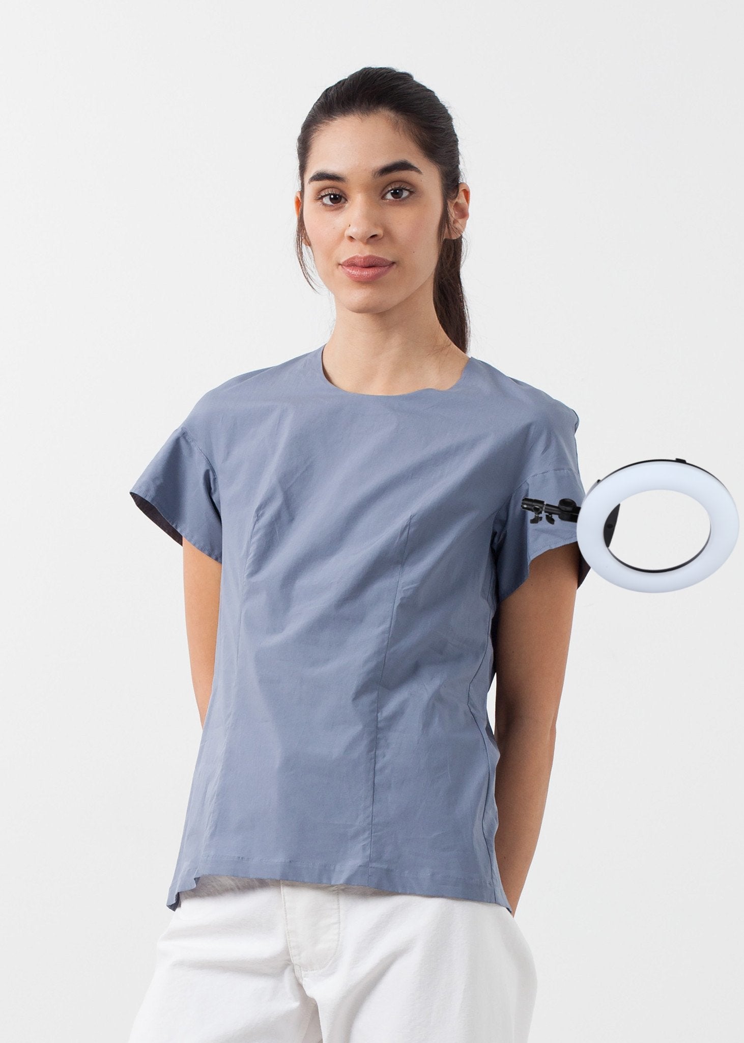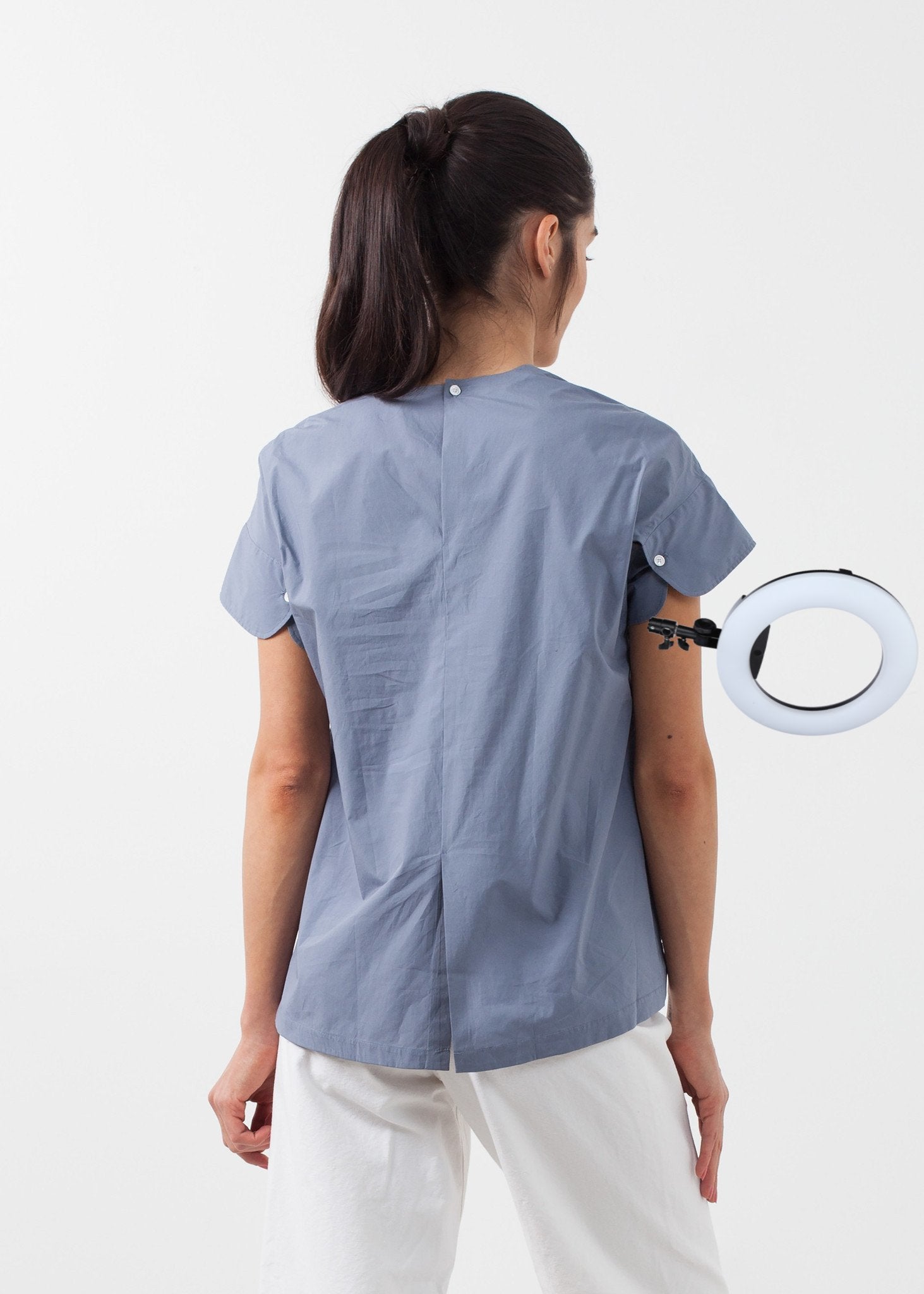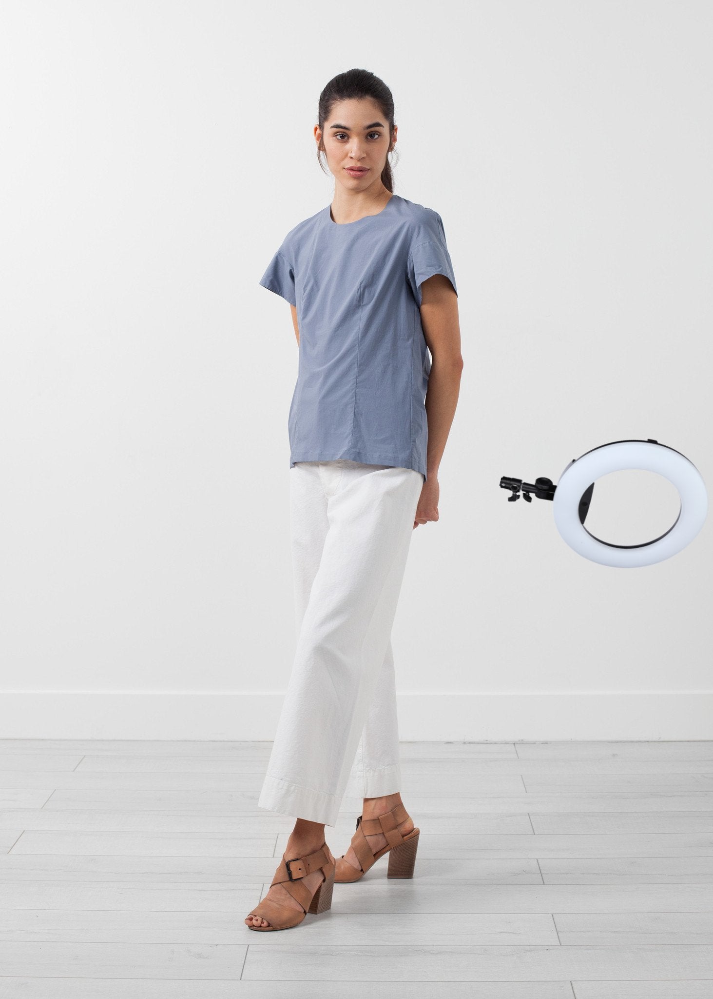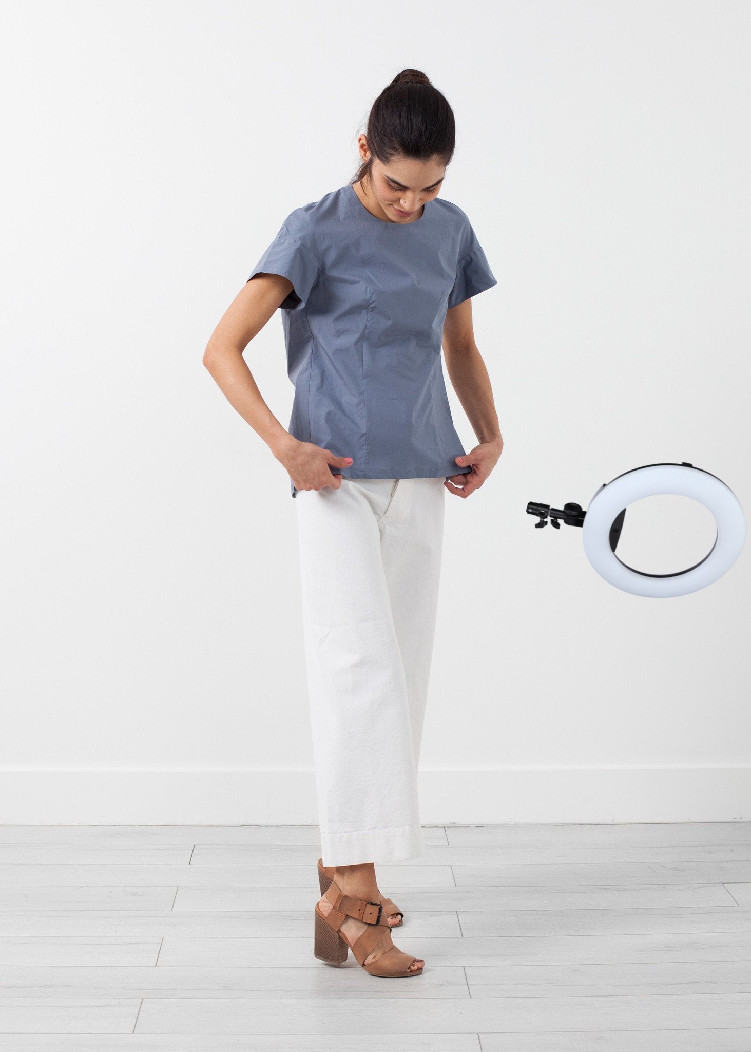 The perfect blouse is a coveted thing. The German brand has devoted itself to harnessing the mastery and construction of this timeless piece. The Laney is a delightful selection for both formal and casual needs. Flattering fit with princess seaming. Single button closure at center back neck. Single button closures at sleeve cuffs. Lareida. Color Marple. 100% Cotton. Made in Portugal. Ashley is wearing a Size 36.