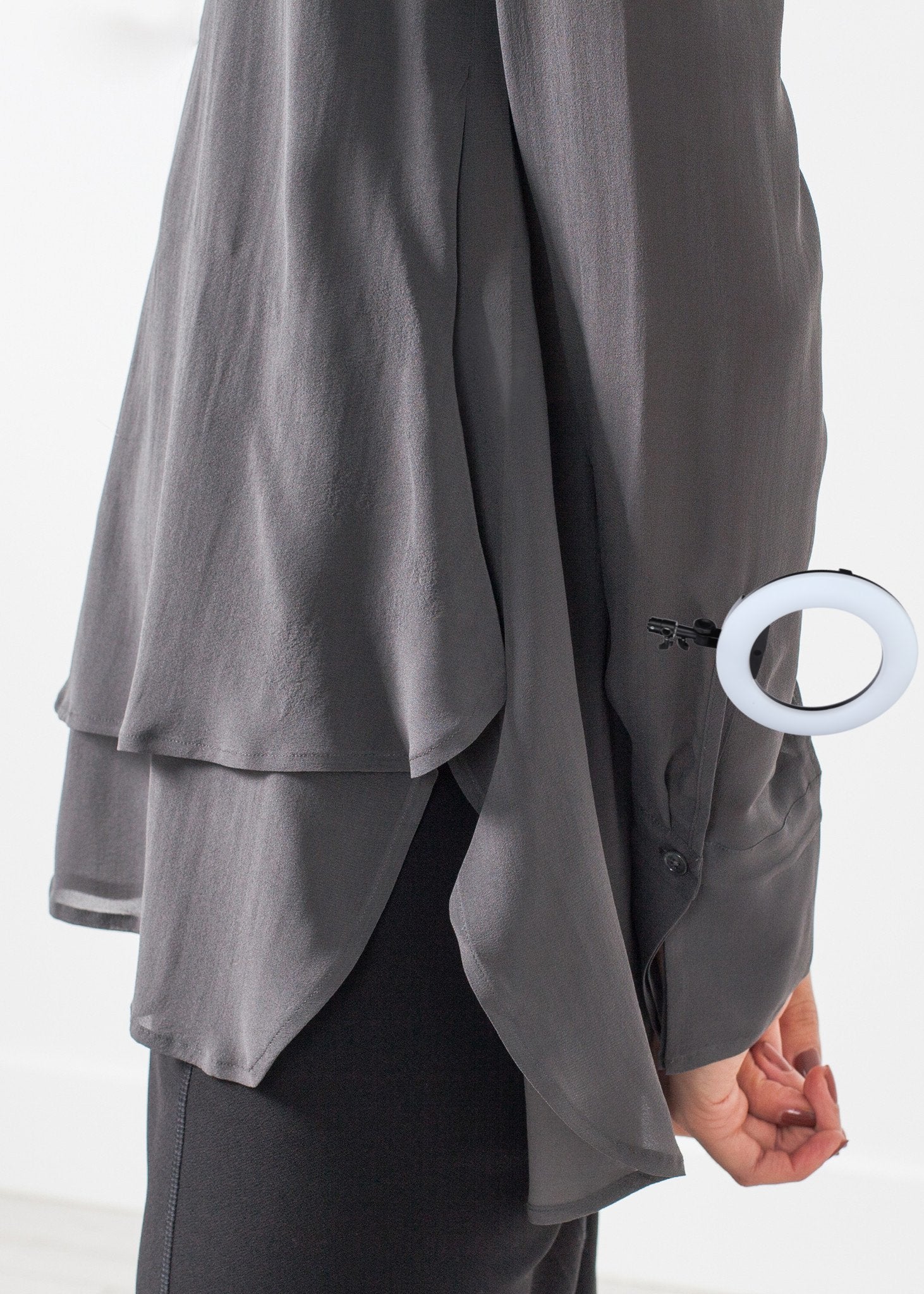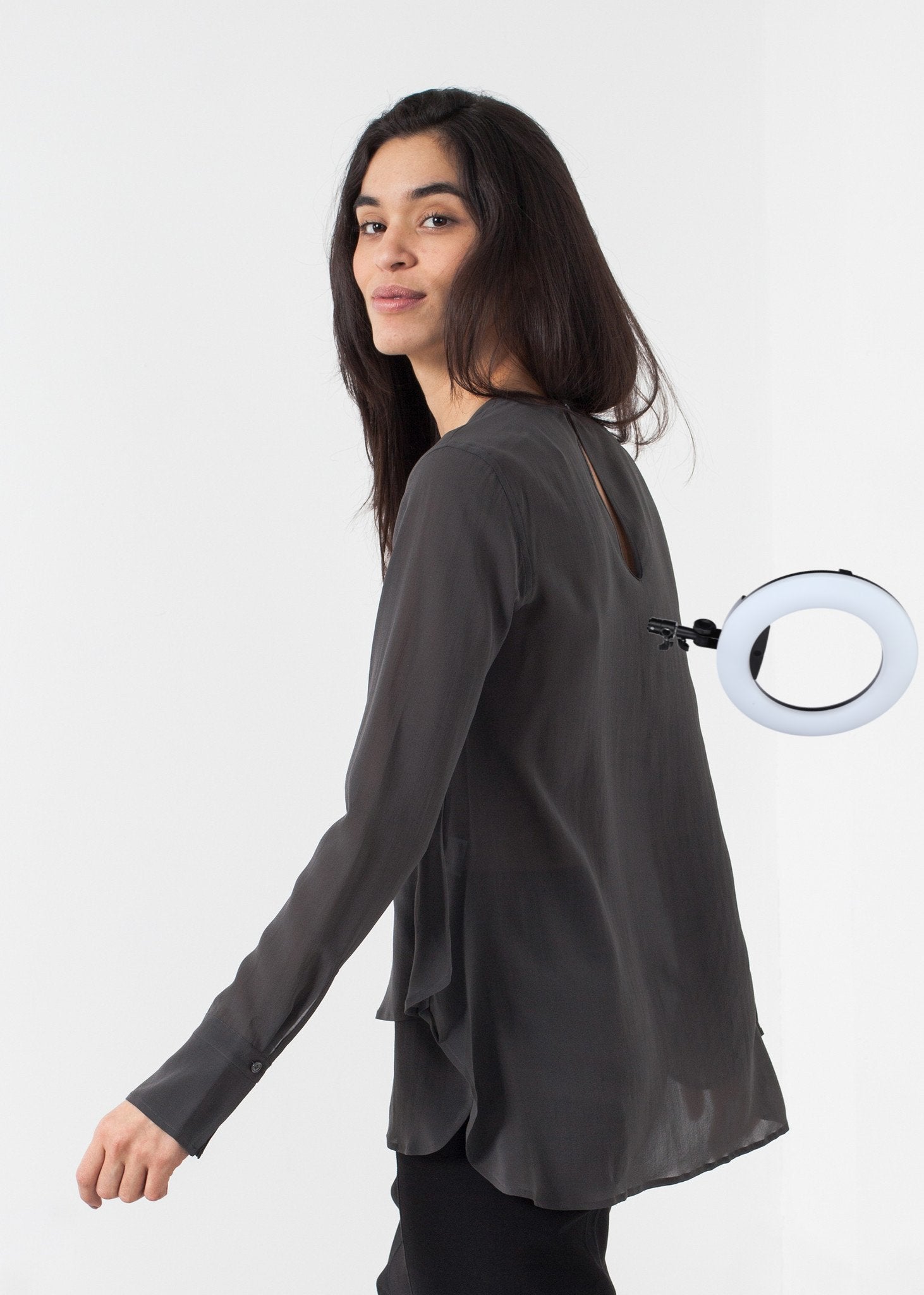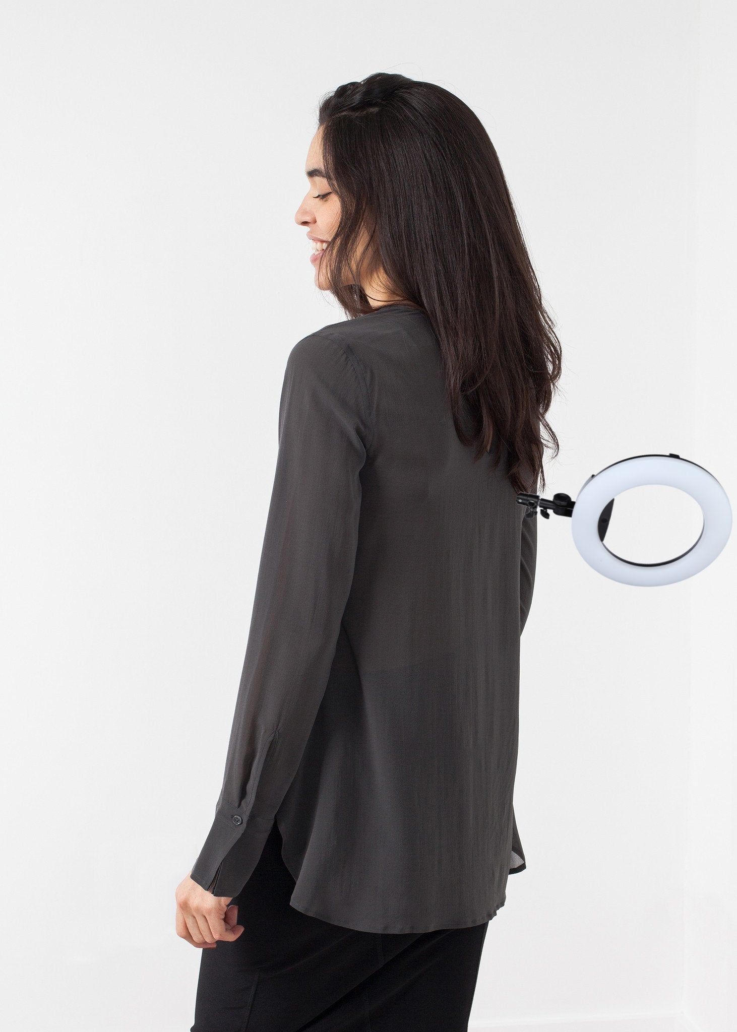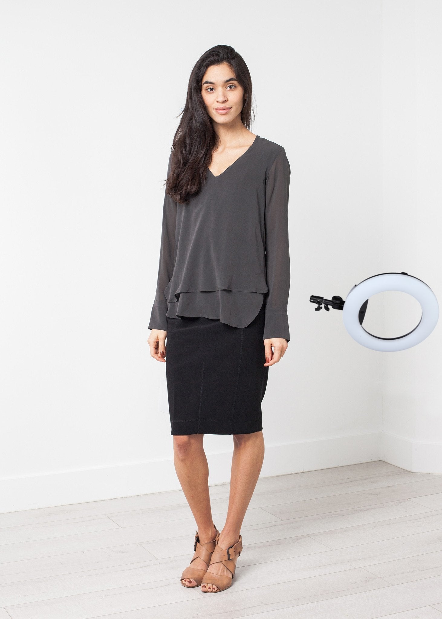 Become enchanted with the Liberty by Lareida. Graceful draping of form guides to its' hinted sensuality. Soft v-neckline, tailored sleeves, and flowing layered hem. Single button closure at center back. Color Asphalt. 92% Silk, 8% Lycra. Made in Portugal. Ashley is wearing a 36.