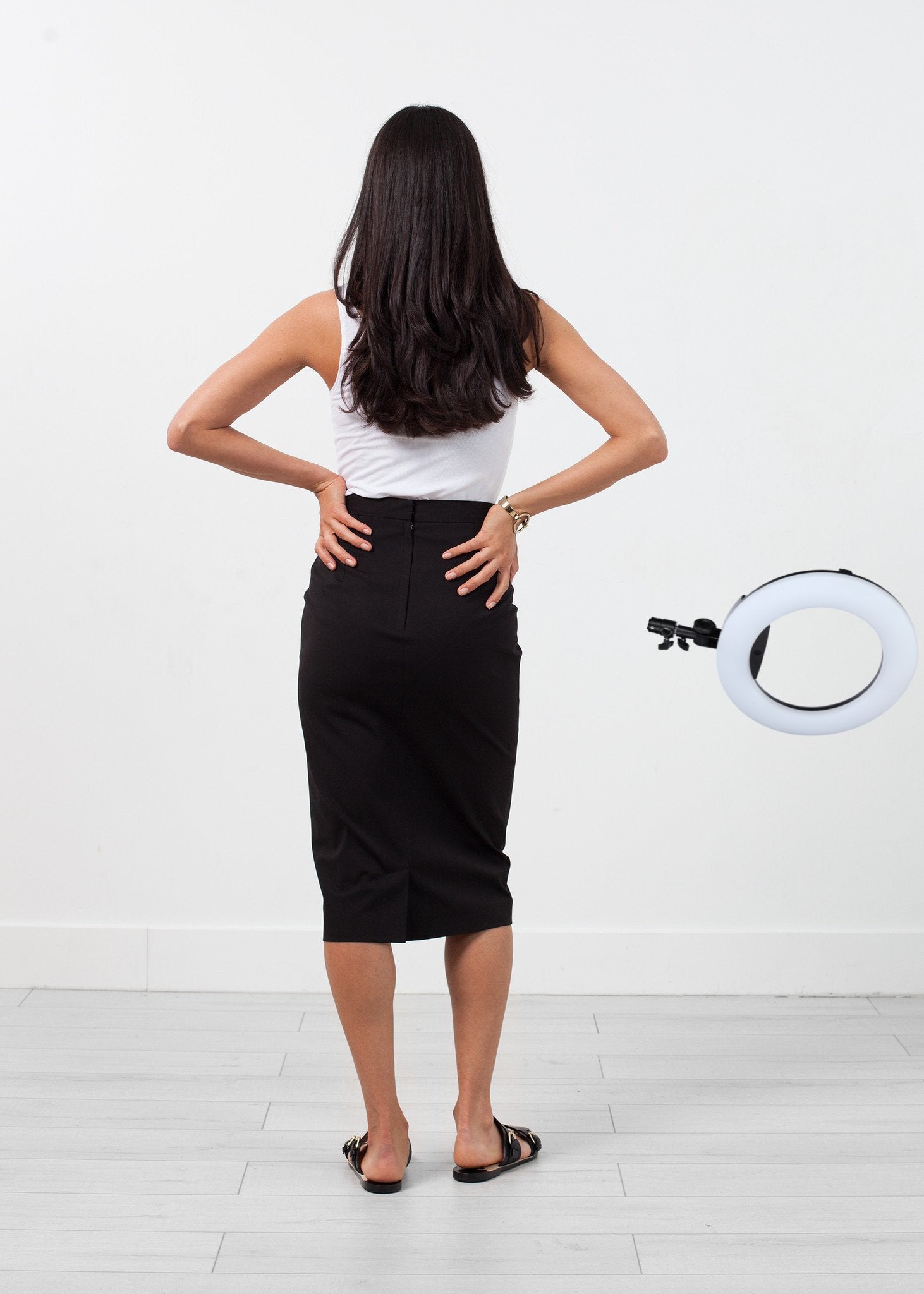 Classic pencil skirt is tea length with a slim silhouette. This diverse piece presents a work-worthy staple while potential for the cocktail party or the weekend outing. Back darts perfect trim fit. Skirt hook and eye closure with back zip. Ter et Bantine. Color Black. 98% Cotton, 2% Elastane. Made in Italy. Lana is wearing an Italian 40.