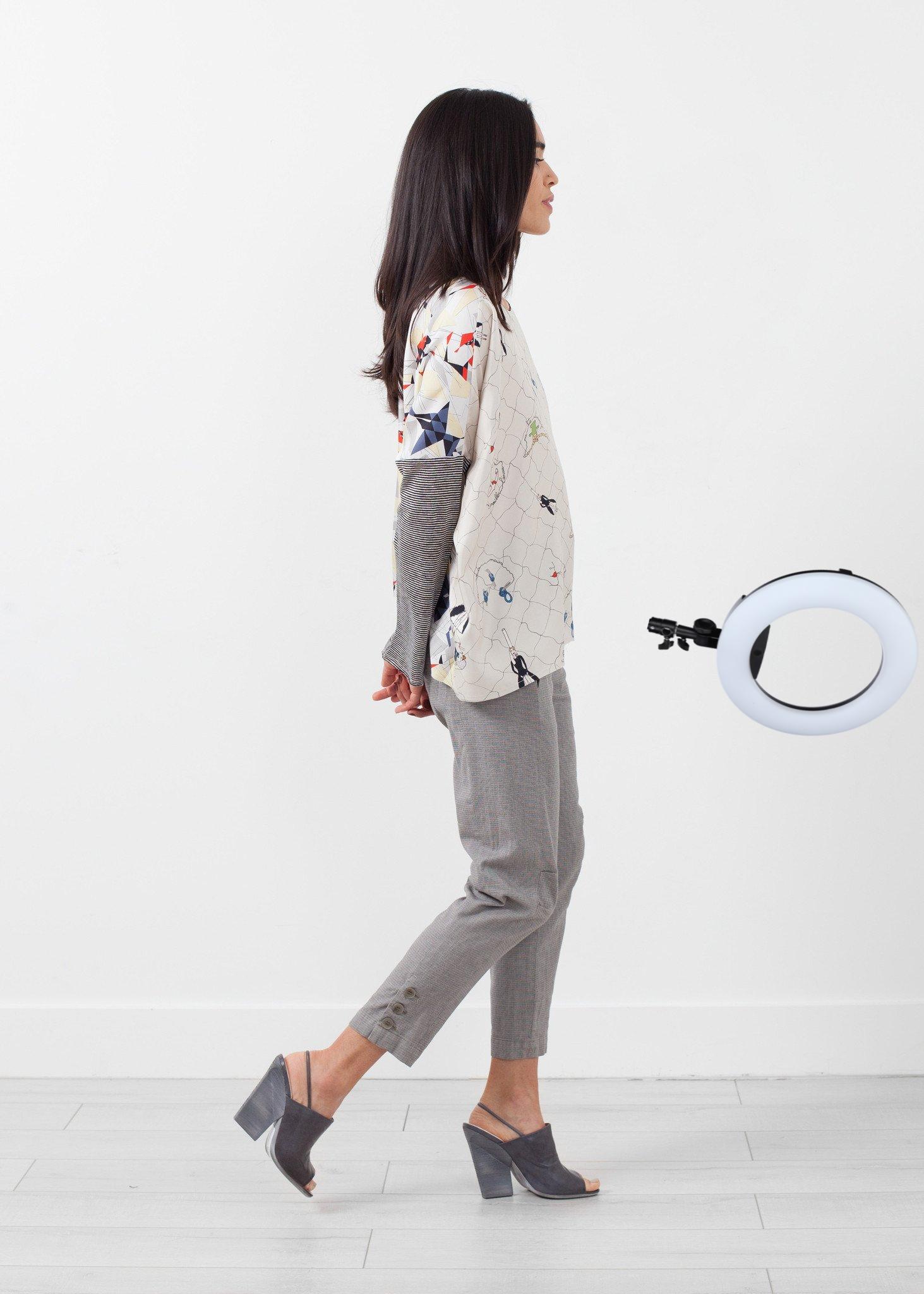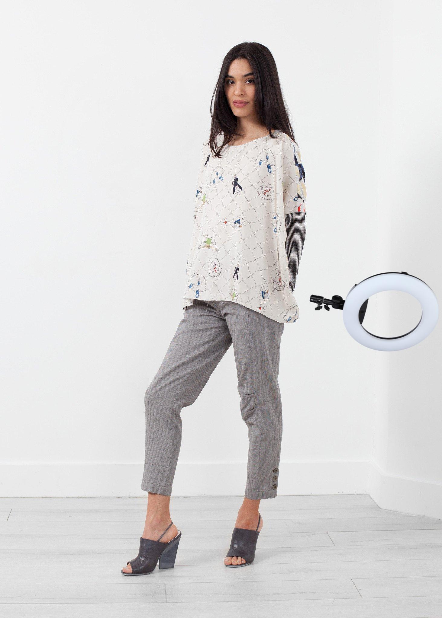 Intentional clashing patterns of nostalgic and new prints made in a sumptuous silk twill, La Prestic Ouiston currently debuts two collections a year, imposing ten unique prints in small runs each season. With a delectable selection of prints, the Box Blouse suggests gorgeous chaos. Boat neckline. Color Arlequins. 100% Silk. Made in Poland. Ashley is wearing Size 1.