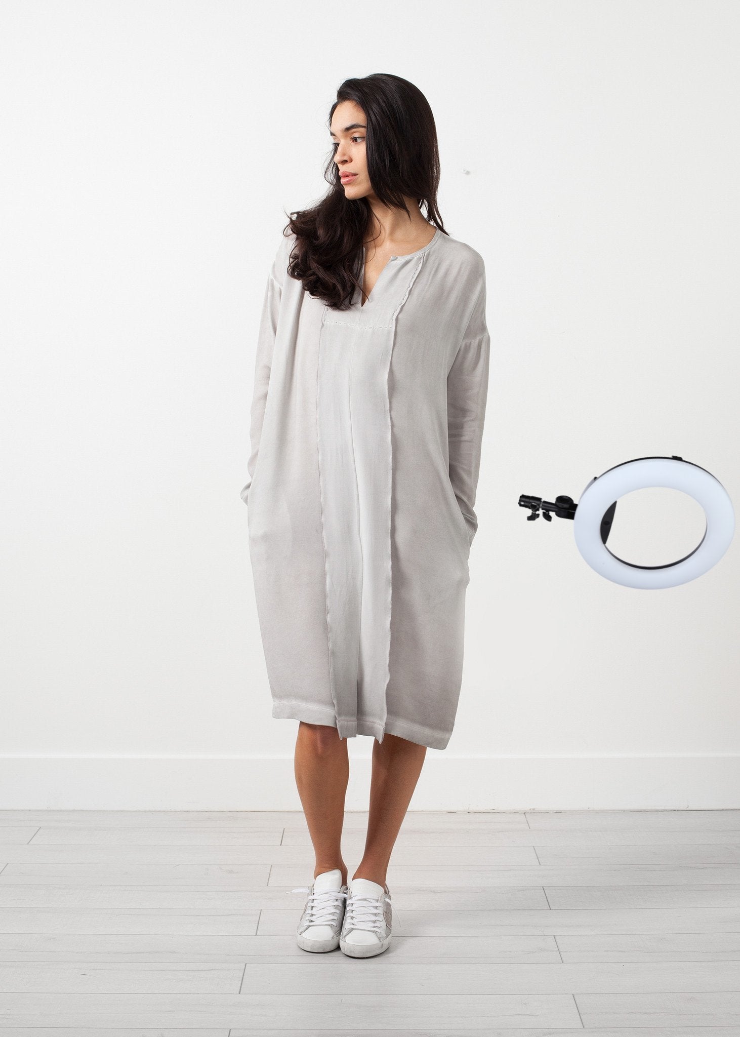 The Long Sleeve Silk Dress presents us with our tunic fit. With a loose silhouette paired with long sleeves and embroidered details, we drift into a daydreaming. Kristensen du Nord. Color Dust. 100% Silk. Made in Italy. Ashley is wearing a Size 0.