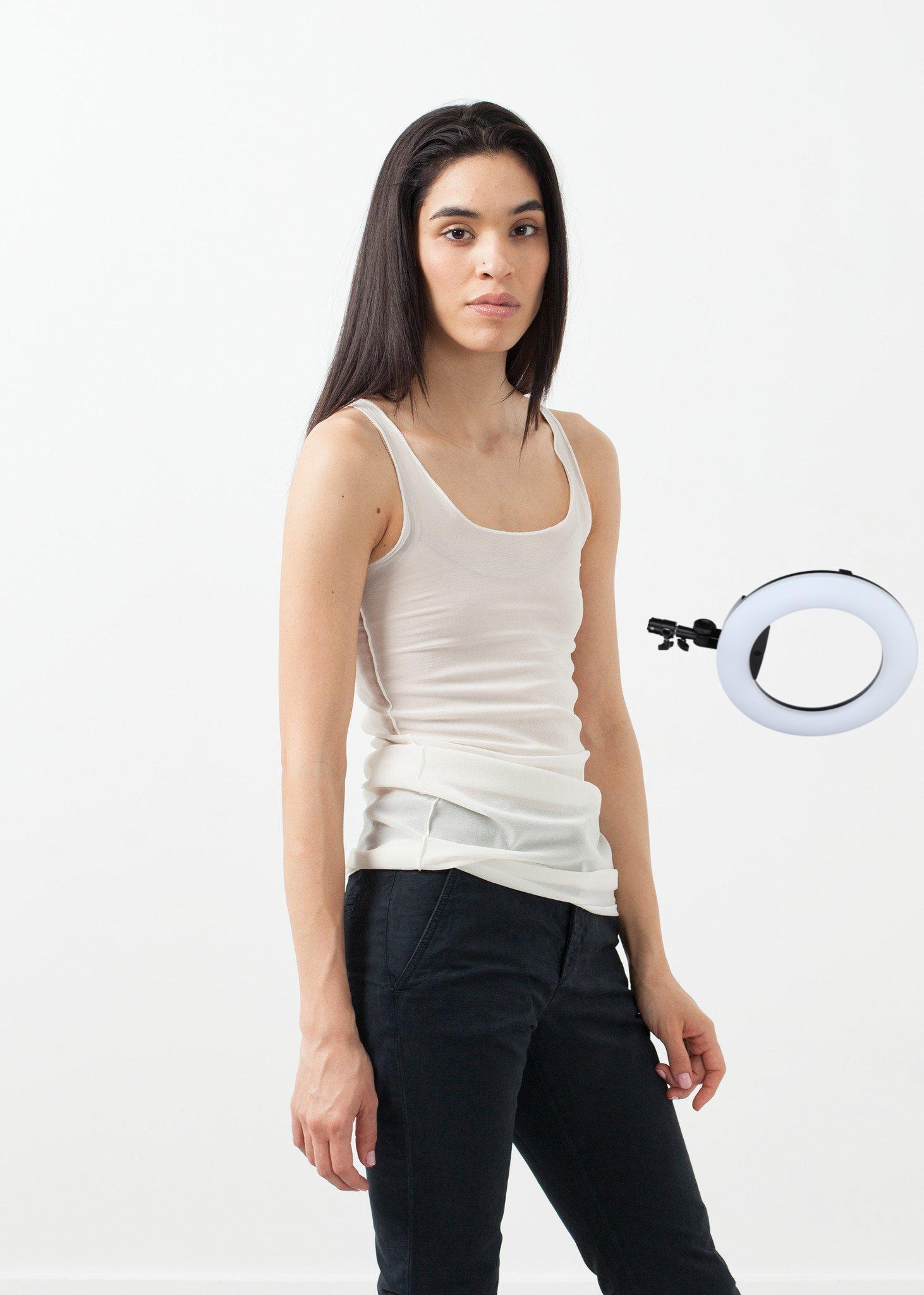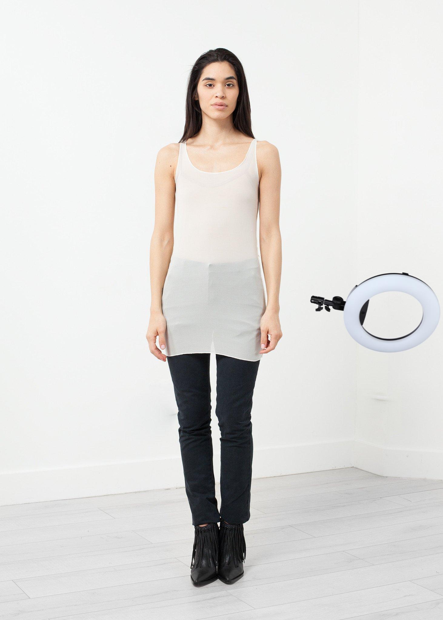 The Long Tank adds dimension with only the slightness of sheer. Textural beauty with exposed seams. Album di Famiglia. Color Cream. 93% Silk, 7% Elastane. Made in Italy. Ashley is wearing an X Small.