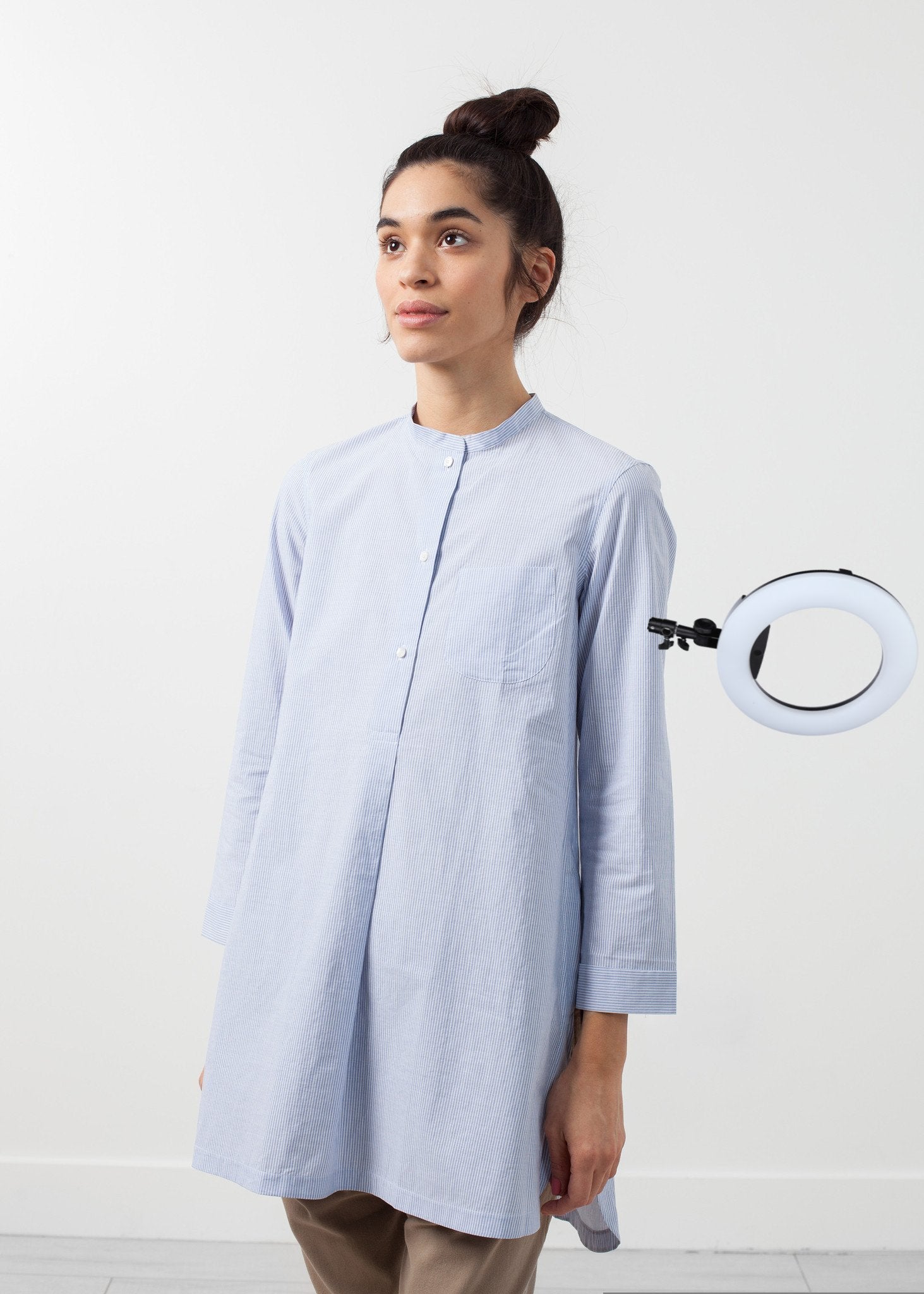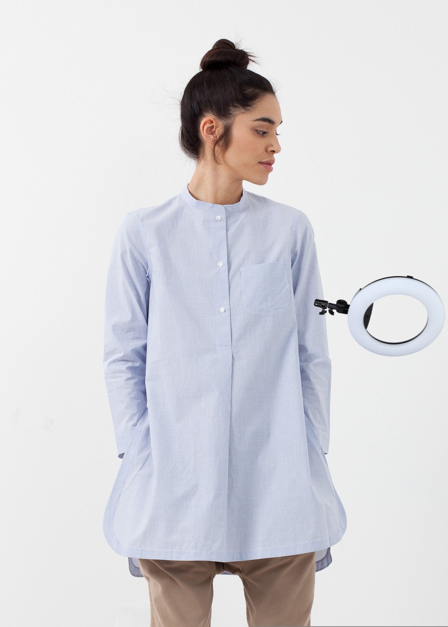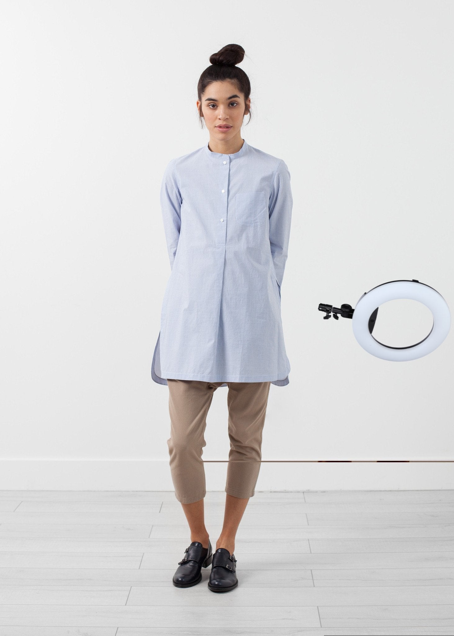 The Lynn conveys the charm of a tunic shirt. Longer in length than a standard top, this piece flatters many forms. Half button placket at front. Mandarin collar. Lareida. Color Blue. 100% Cotton. Made in Portugal. Ashley is wearing a Size 34.