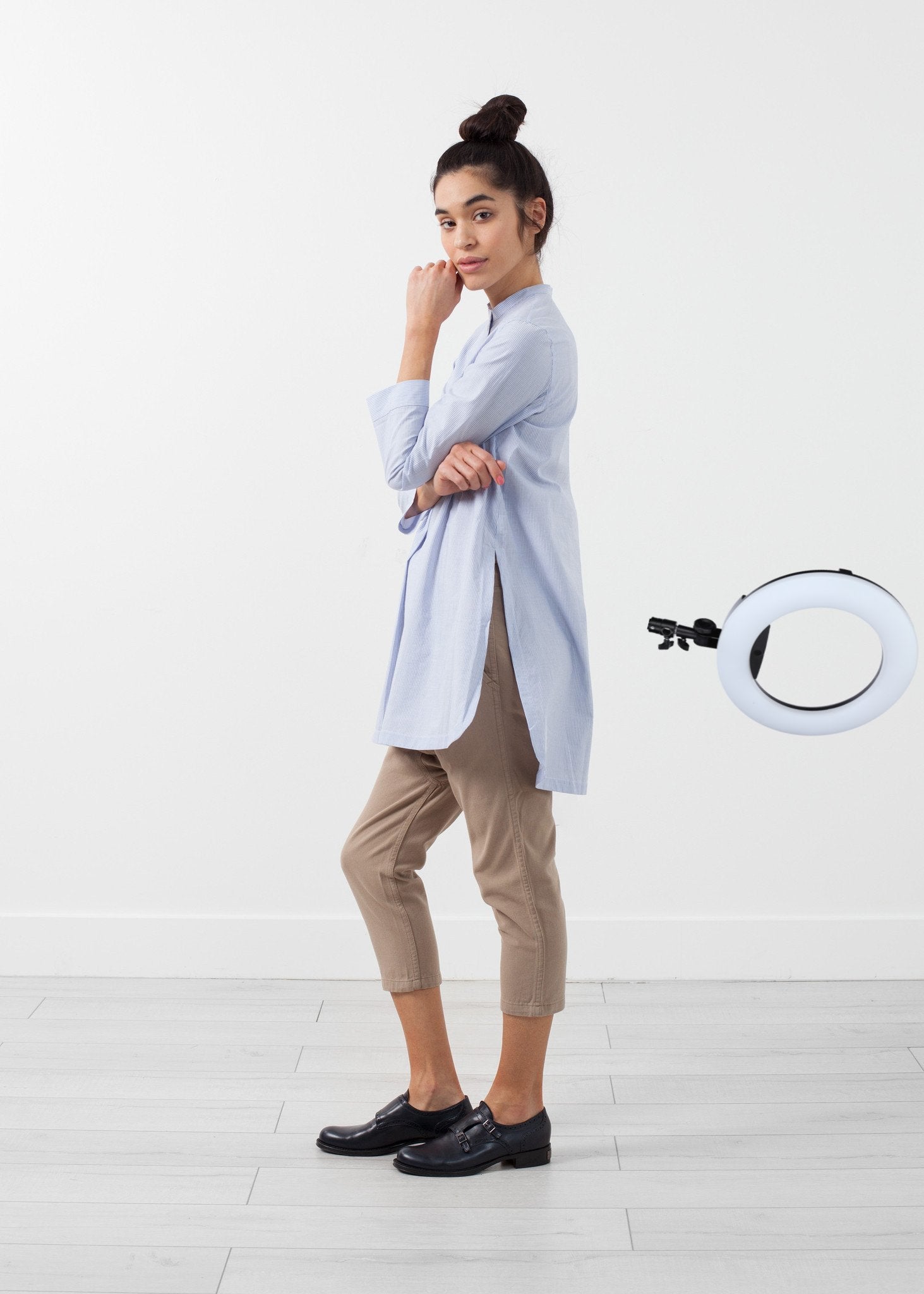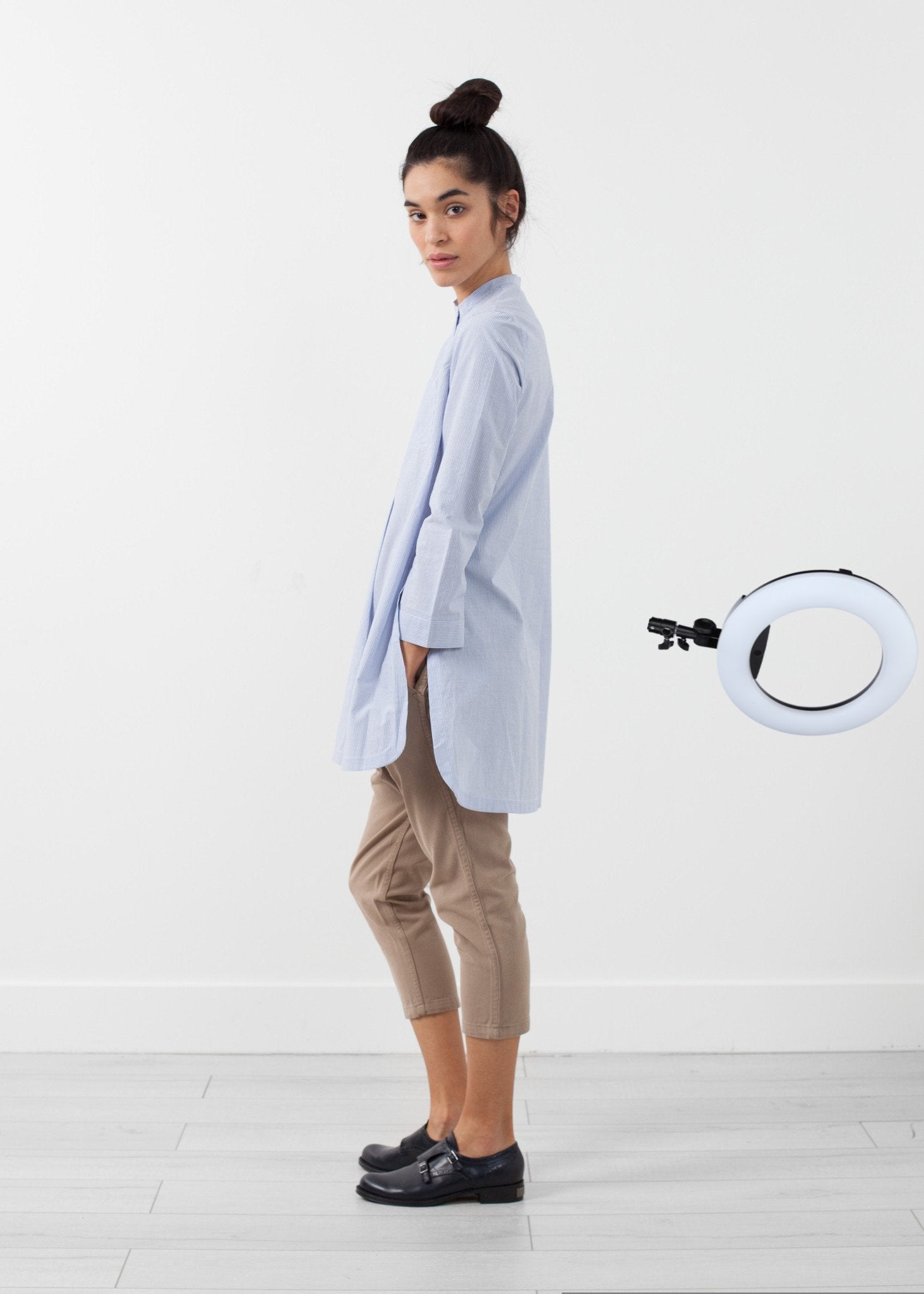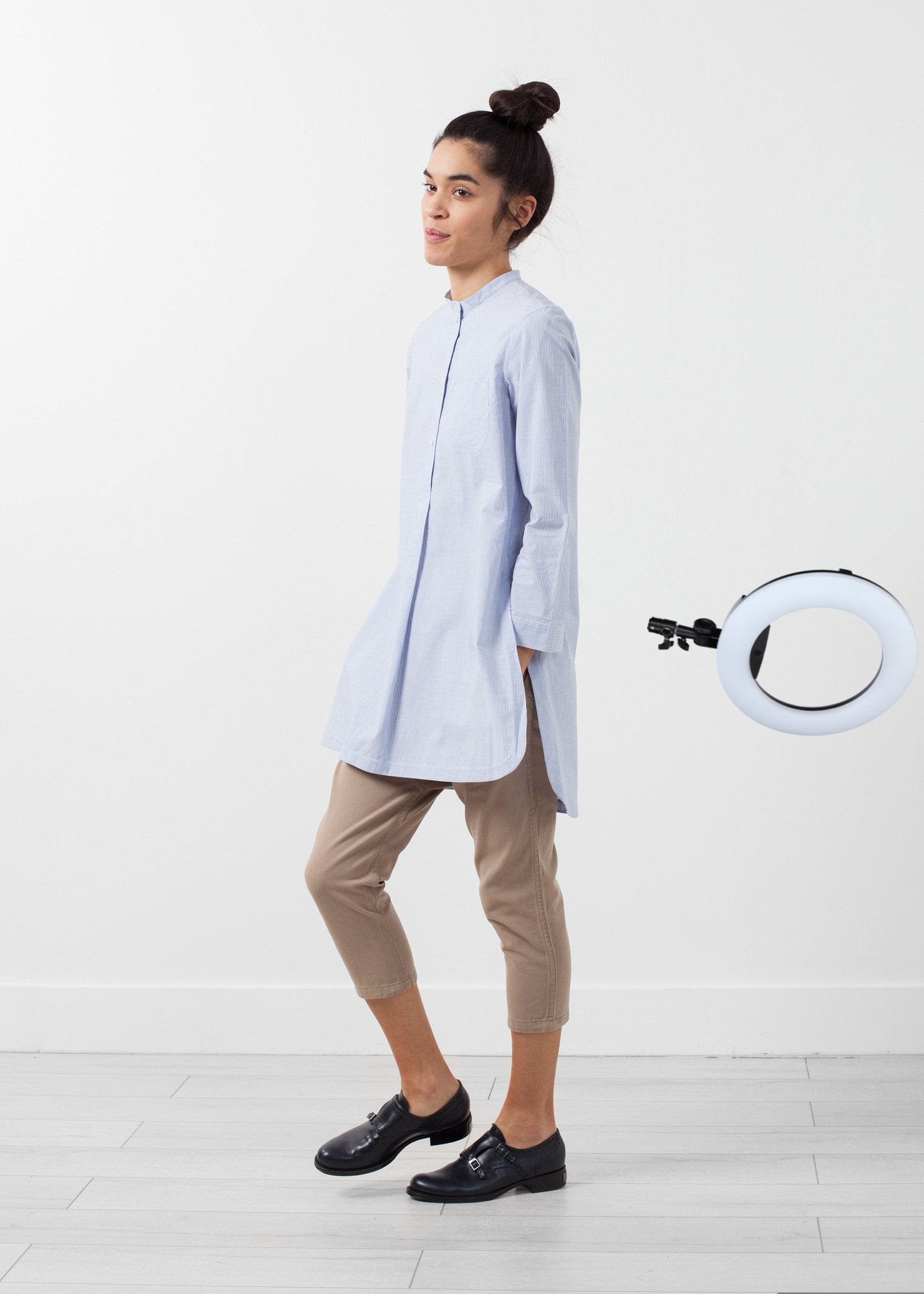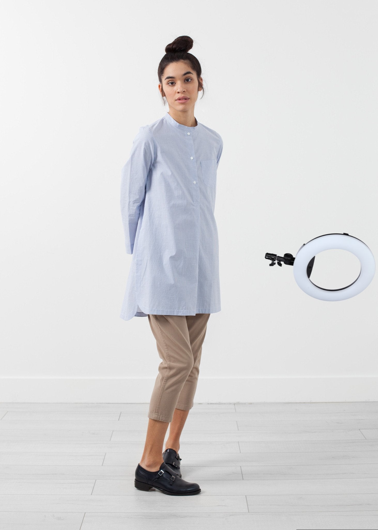 The Lynn conveys the charm of a tunic shirt. Longer in length than a standard top, this piece flatters many forms. Half button placket at front. Mandarin collar. Lareida. Color Blue. 100% Cotton. Made in Portugal. Ashley is wearing a Size 34.