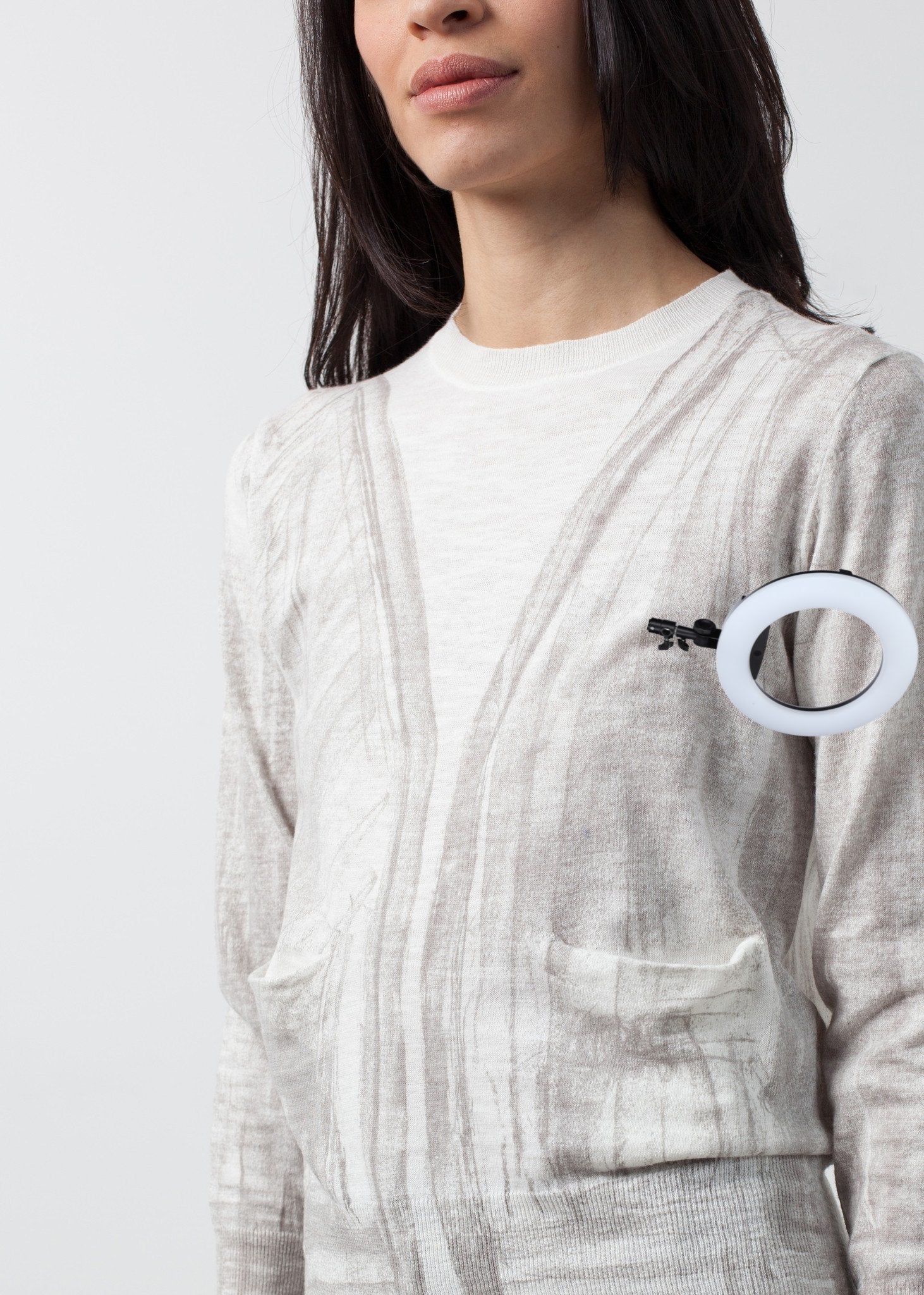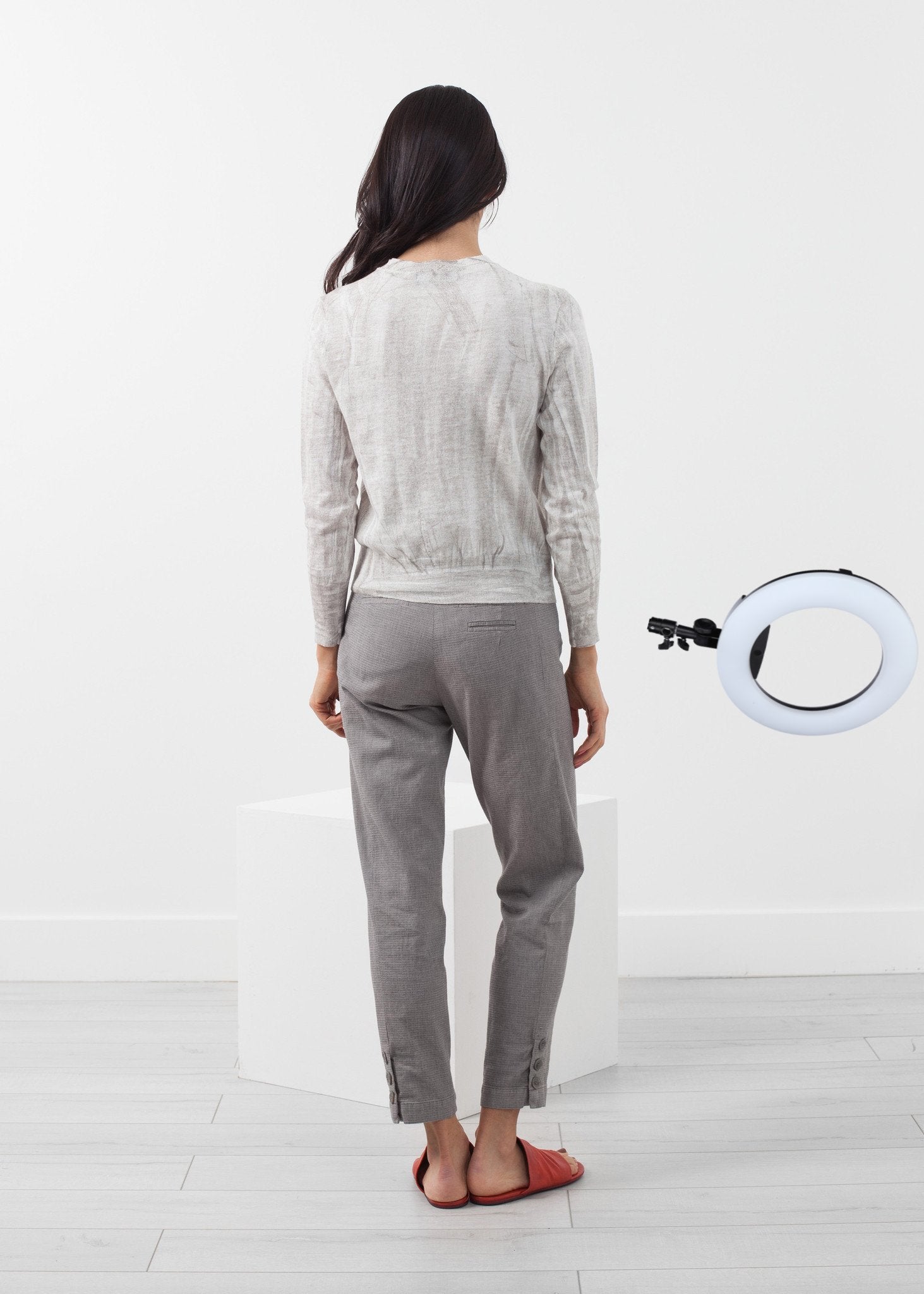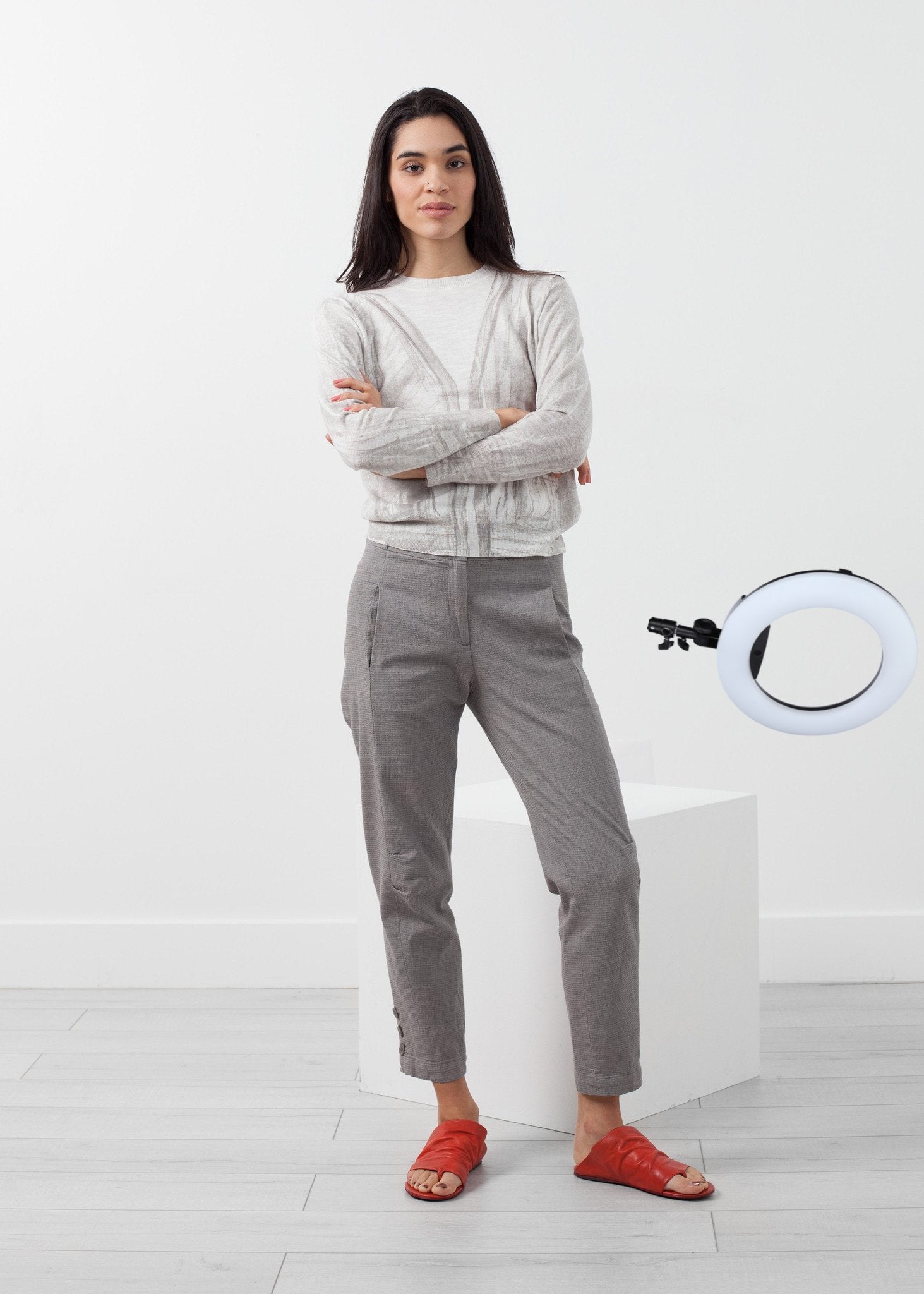 The Maggie presents printed designs with for a spring, neutral palette. Classic crew neckline with two, exterior, hidden pockets. Yoshi Kondo. Color White. 73% Cotton, 27% Linen. Made in Romania. Ashley is wearing a Small.