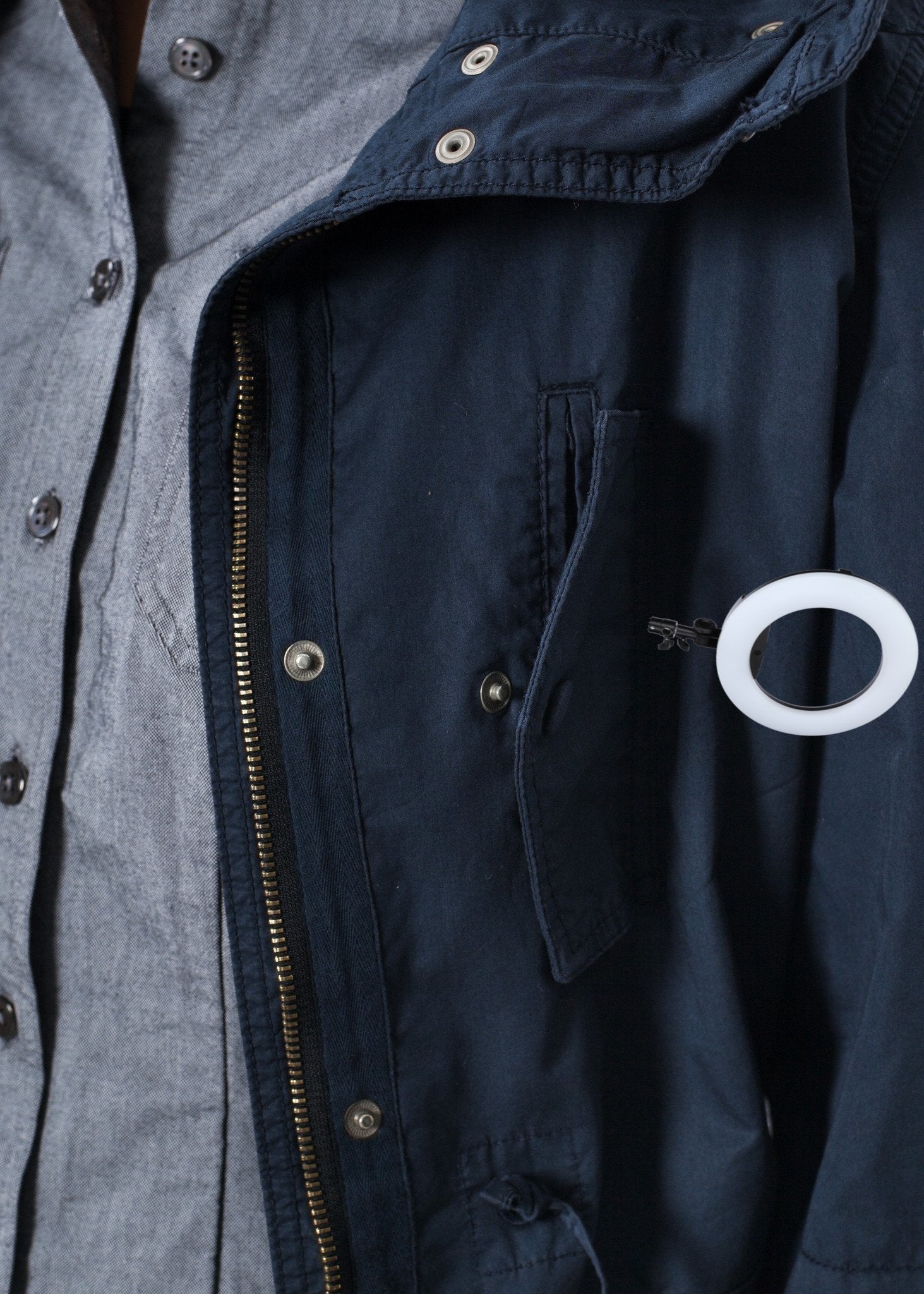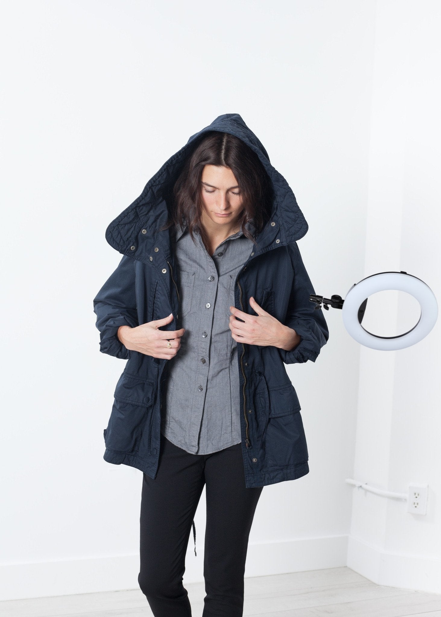The Marquee Coat is the ideal sidekick. Intricately detailed hood and collar. Exterior chest and waist pockets. Elbow pads and detailed seaming. Waist and hip interior drawstring. Front button closure with full zip. Hannes Roether. Color Steel. 100% Cotton. Made in Czech Republic. Lana is wearing the Medium.