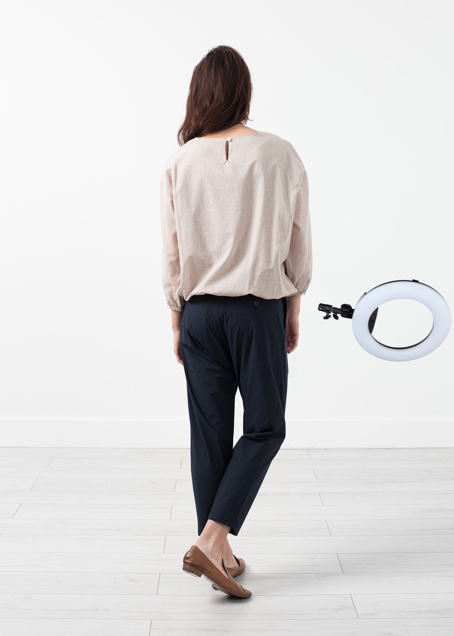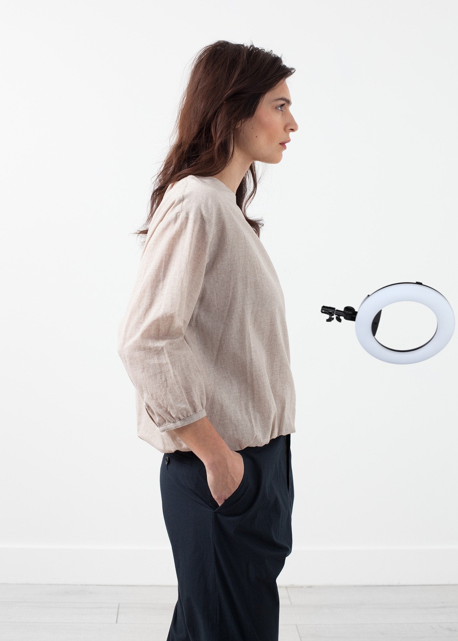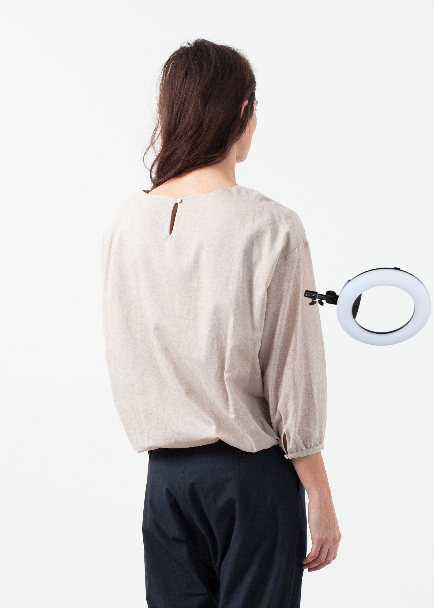 The Marshmallow is a sweet piece for 2015. Wide scoop neckline. Elastic band at waist. Single button closure at center back neck. Lined. Nicholson & Nicholson. Color Beige. 100% Cotton. Made in Japan. Lana is wearing a French 38.