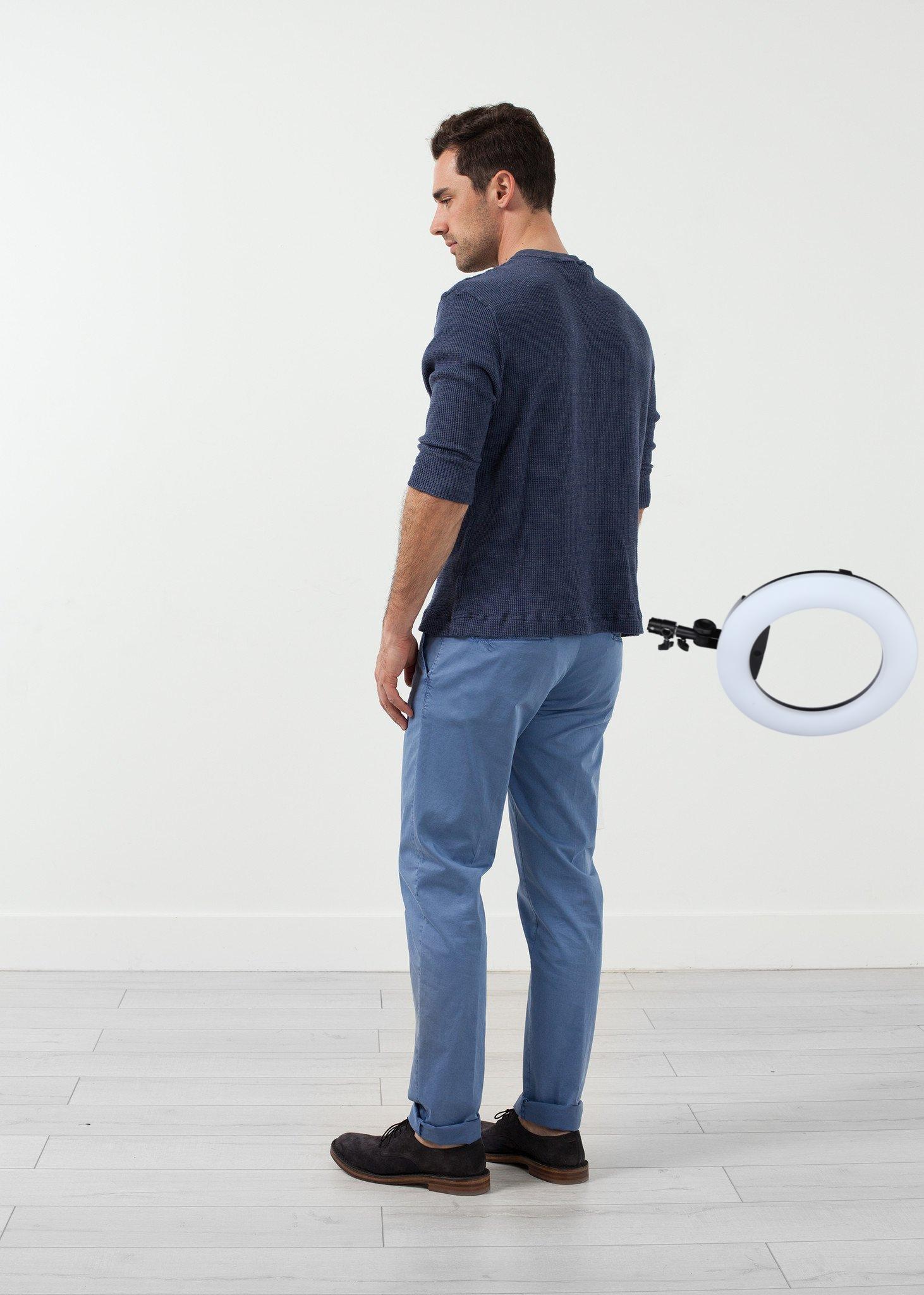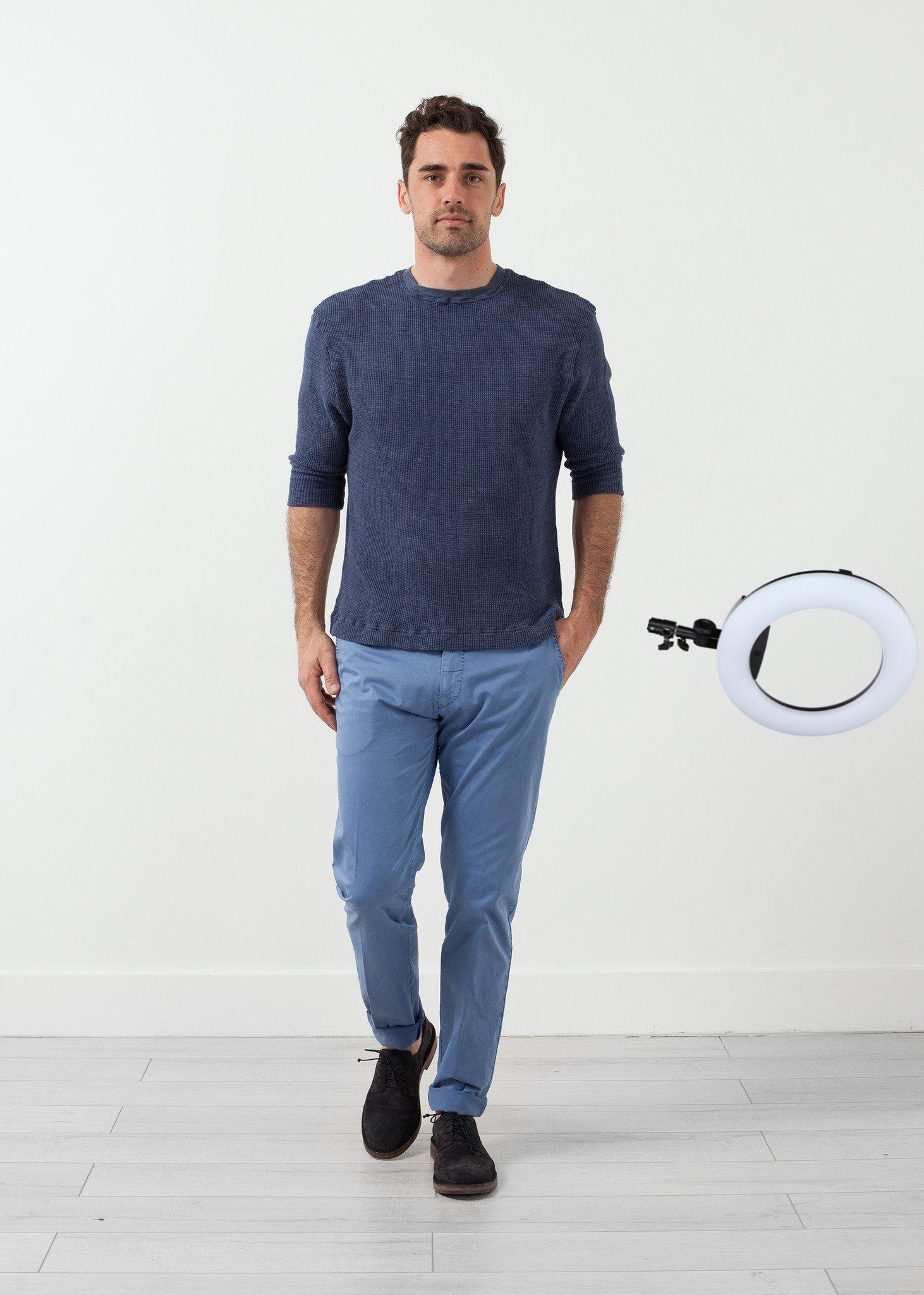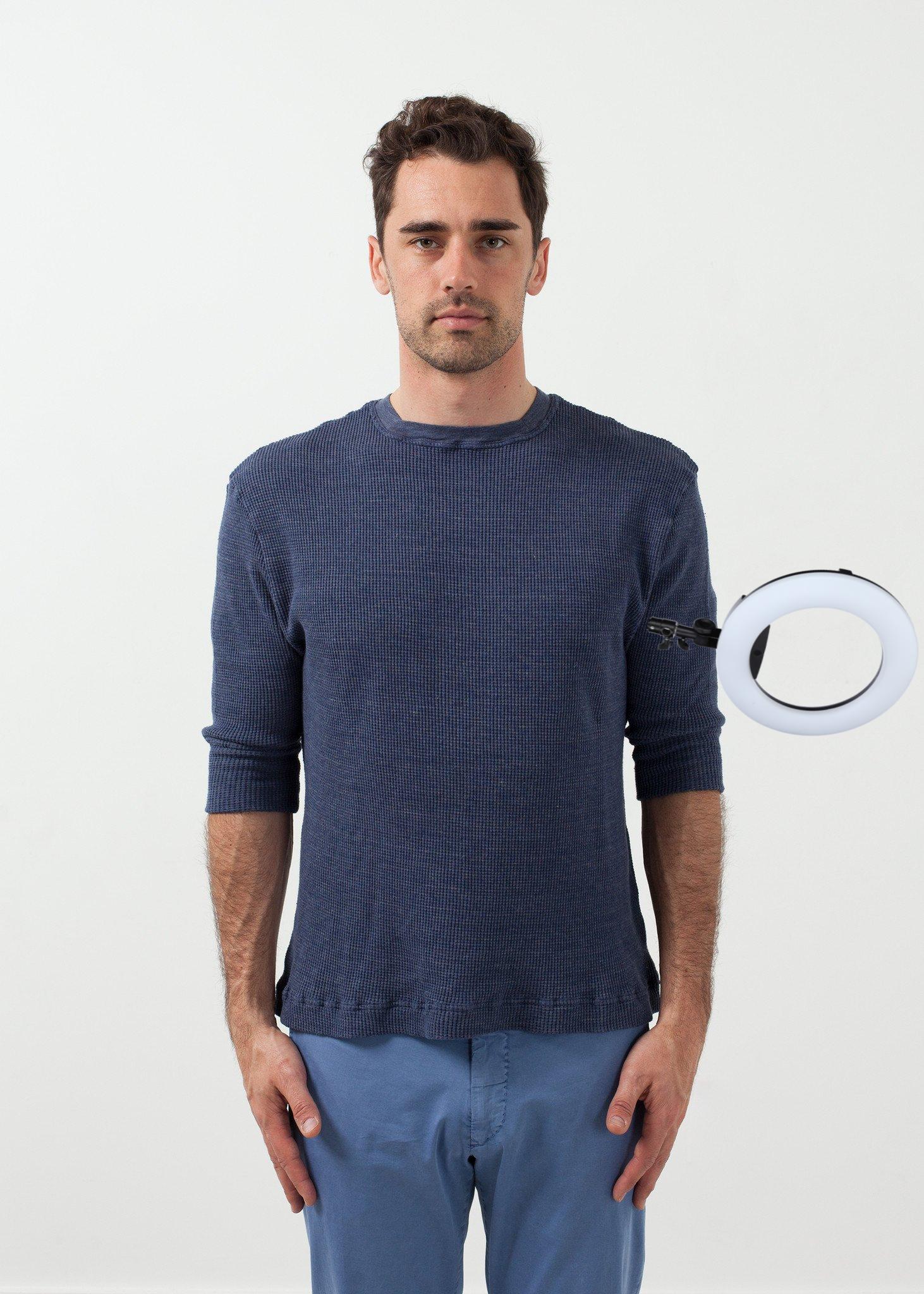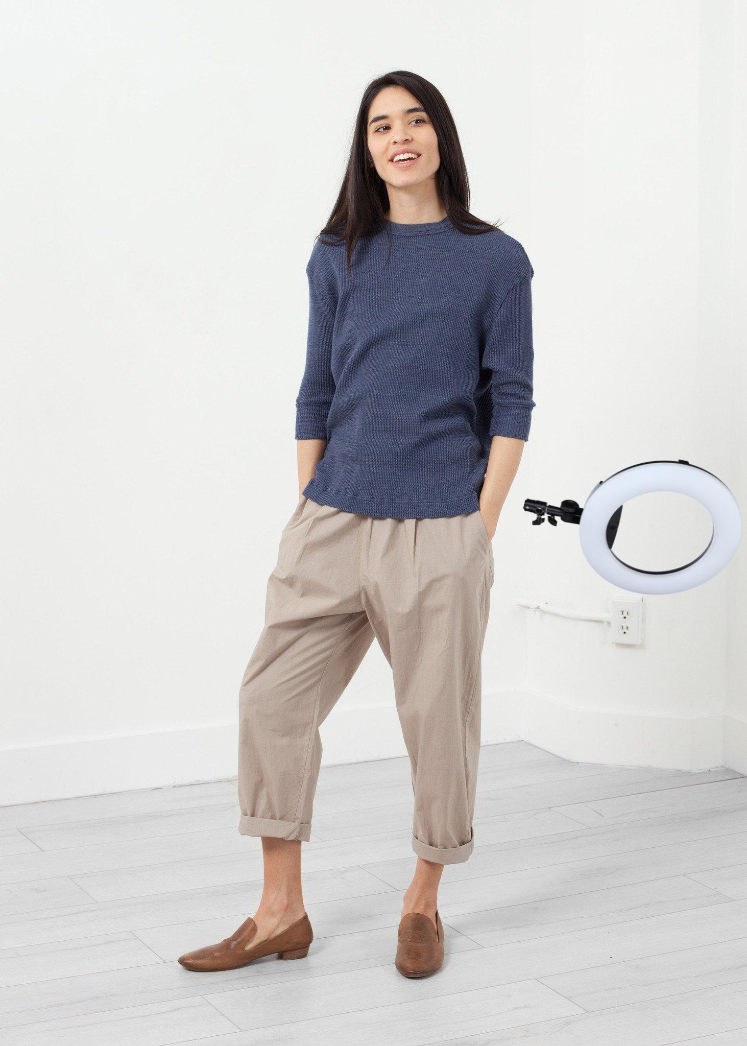 The Melange Top adds needed layers for that needed spring getaway. Crew neckline. 3/4 inch sleeves. V:Room. Color Denim. 80% Cotton, 20% Nylon. Made in Japan. Ashley is wearing an X-Small. Jacob is wearing a Large.