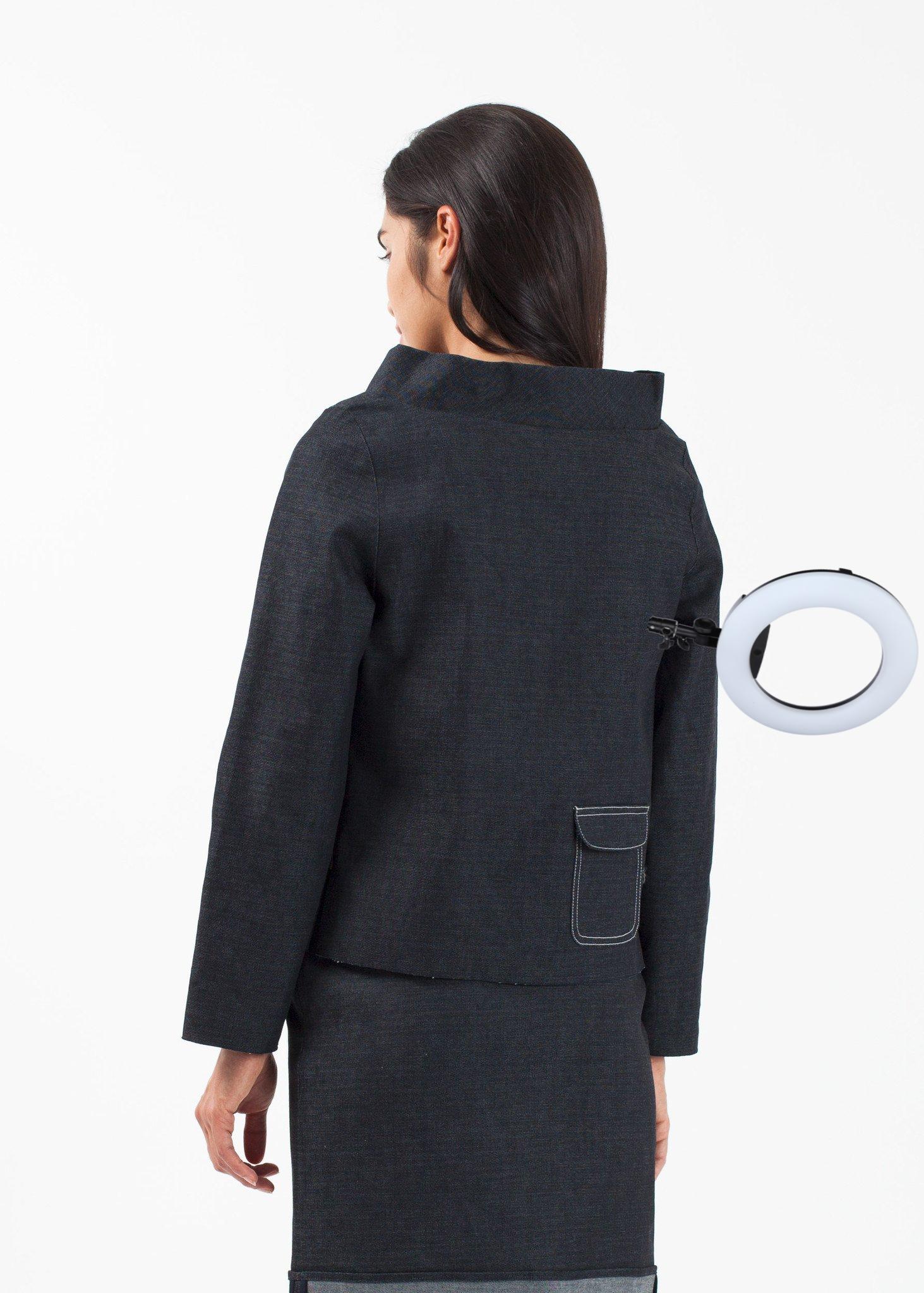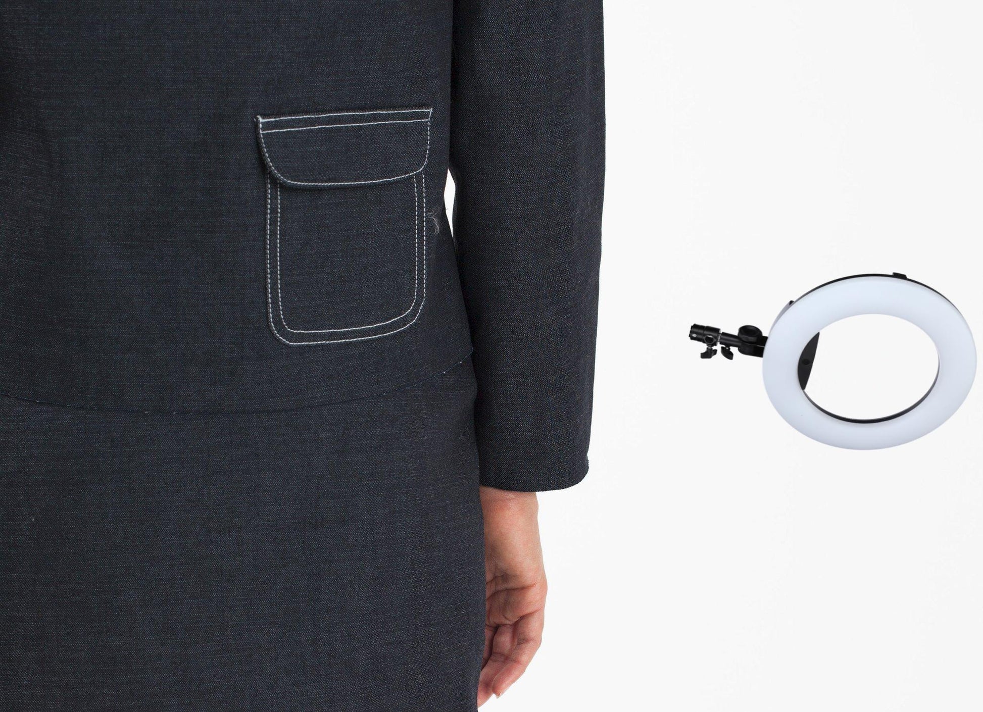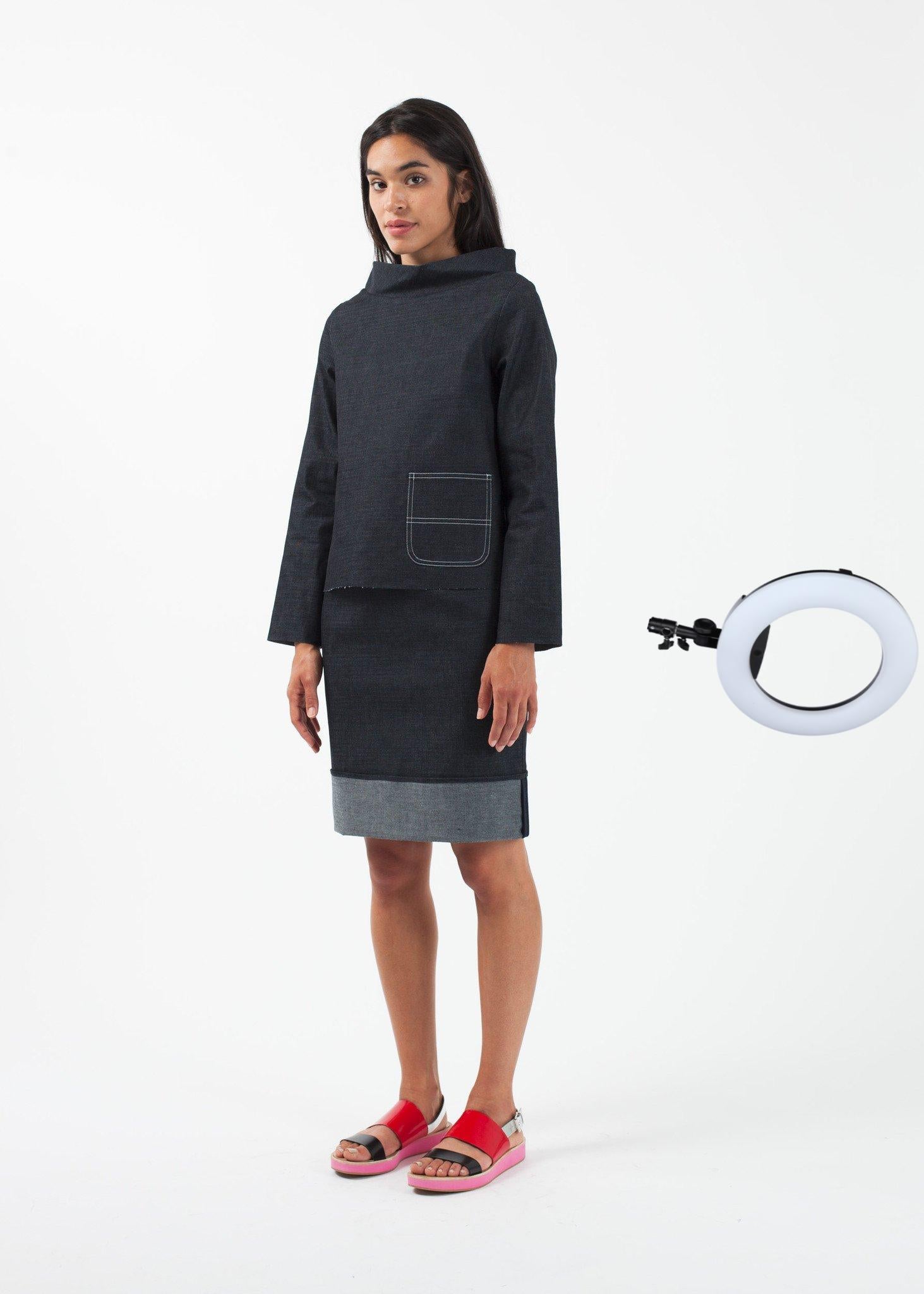 The Mod Top from Harvey Fairclothes offers the structure of raw denim in wearable cotton. Boat neckline. Raw hemming. Two exterior pockets. Invisible zip closure at side. Fully lined. 100% Cotton, Lining 100% Cotton. Made in U.S.A. Ashley is wearing a US 2.