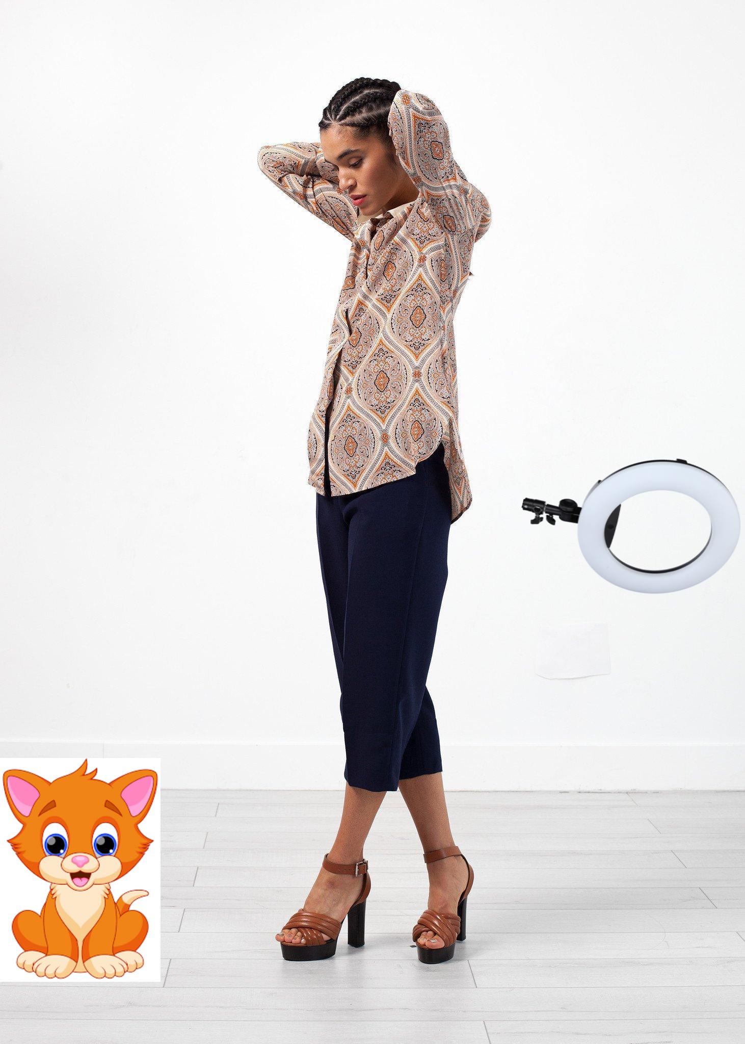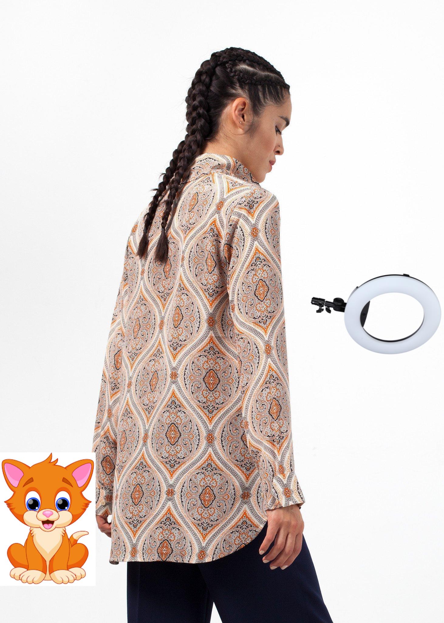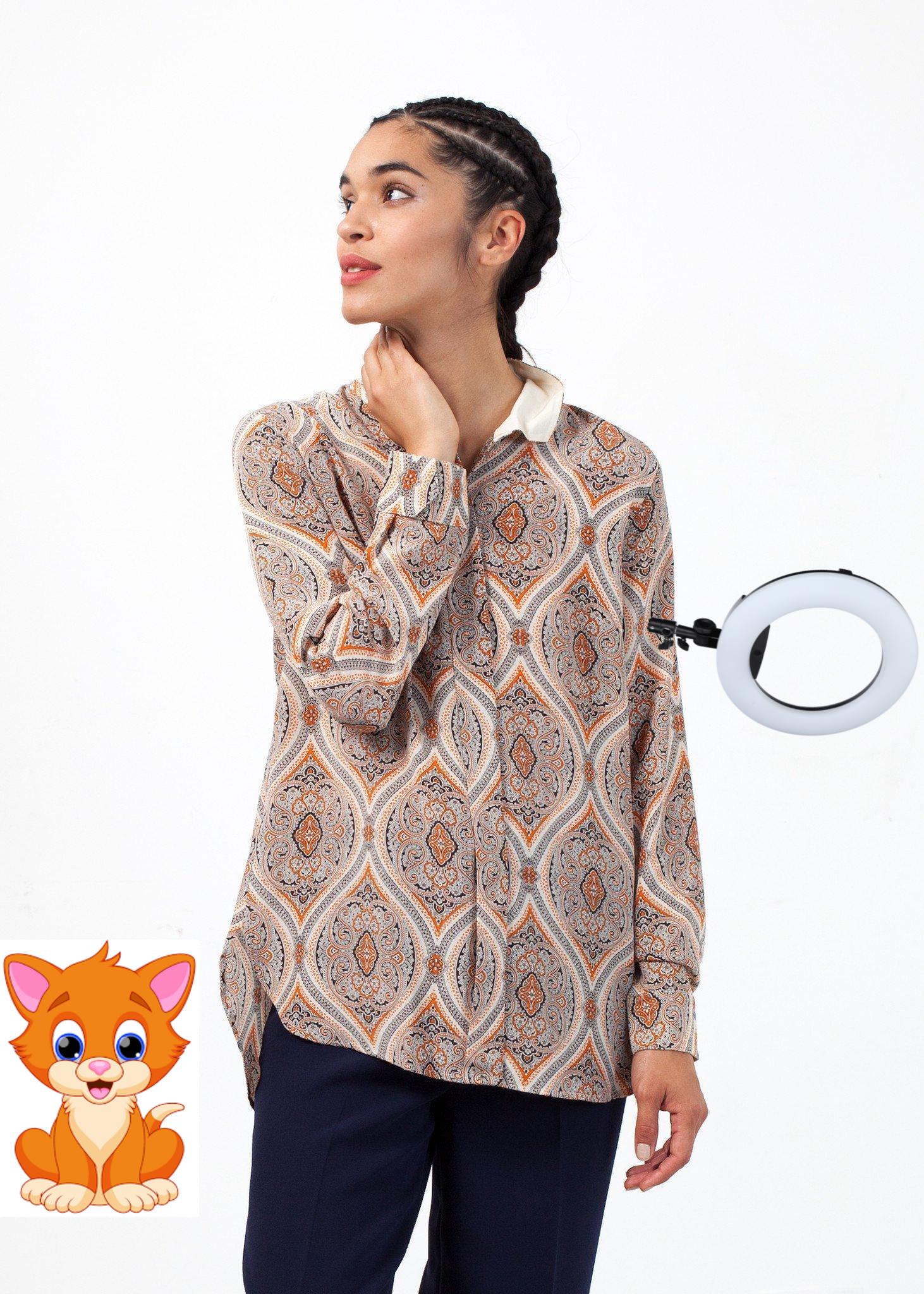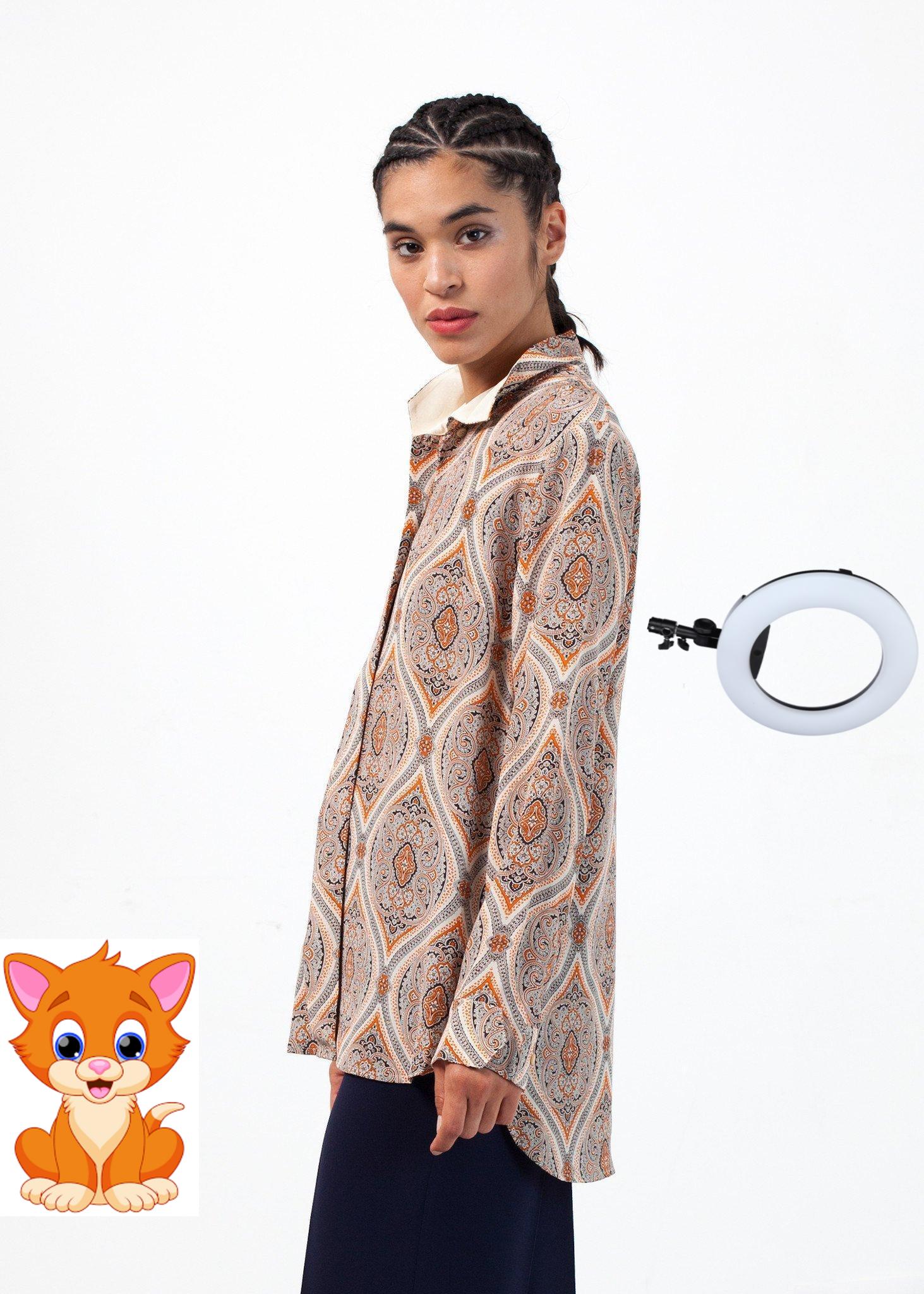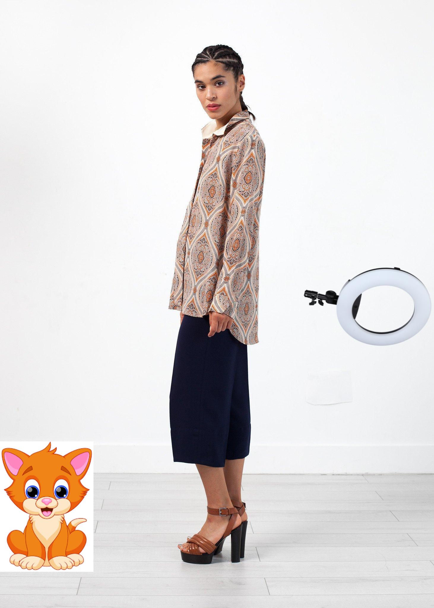 The Onvia Top offers a shapeless silhouette while engaging the eye. Hidden button placket at front. Mandarin collar. By Malene Birger. Color Orange Mosaic. 100% Silk, 100% Silk trim. Made in China. Ashley is wearing a European 36.