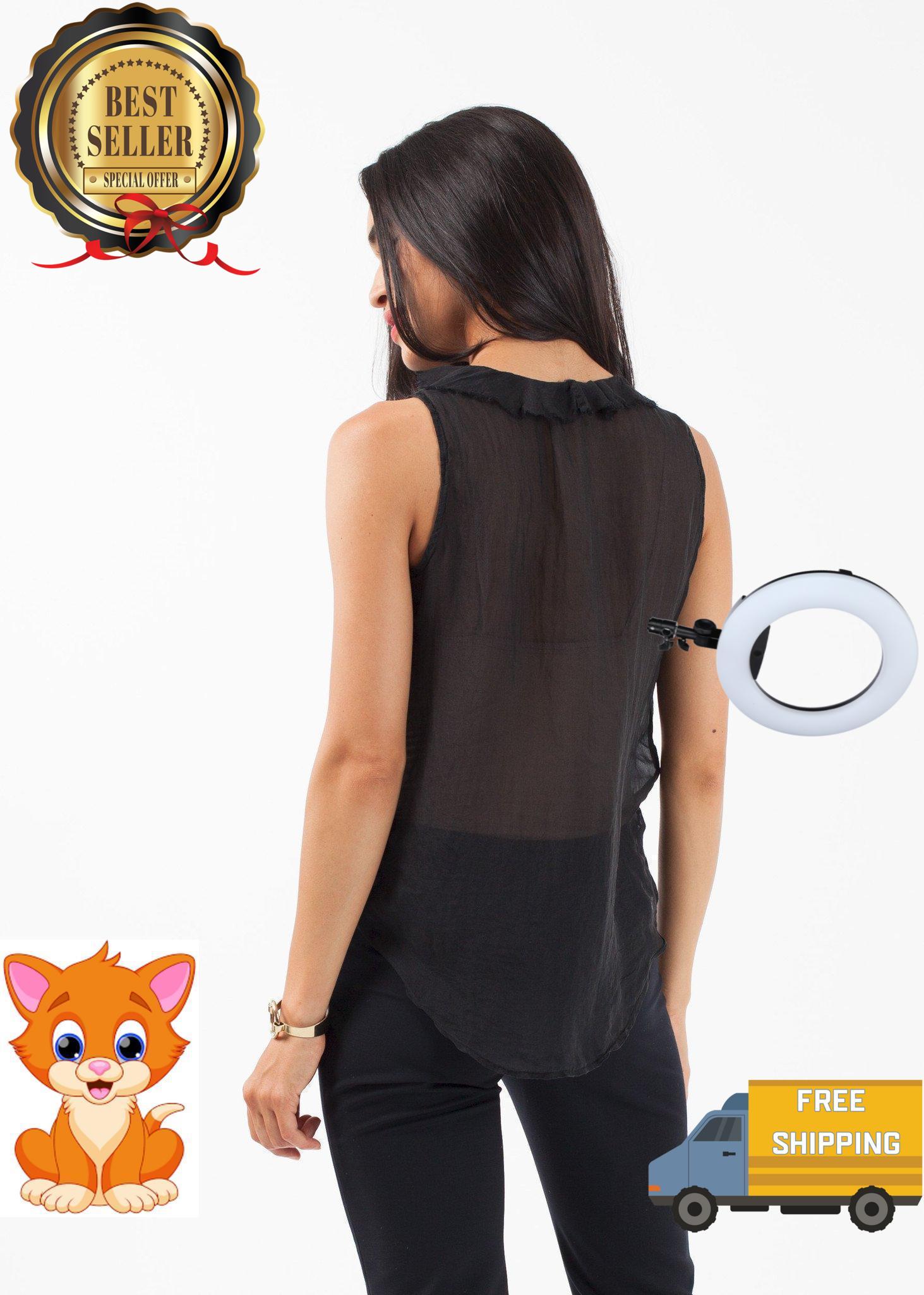 Soft ruffling frames the neck in the Fair Top. Delicate and poised. Pip-Squeak Chapeau. V-neckline. Color Black. 100% Organza. Made in U.S.A. Ashley is wearing a Small.