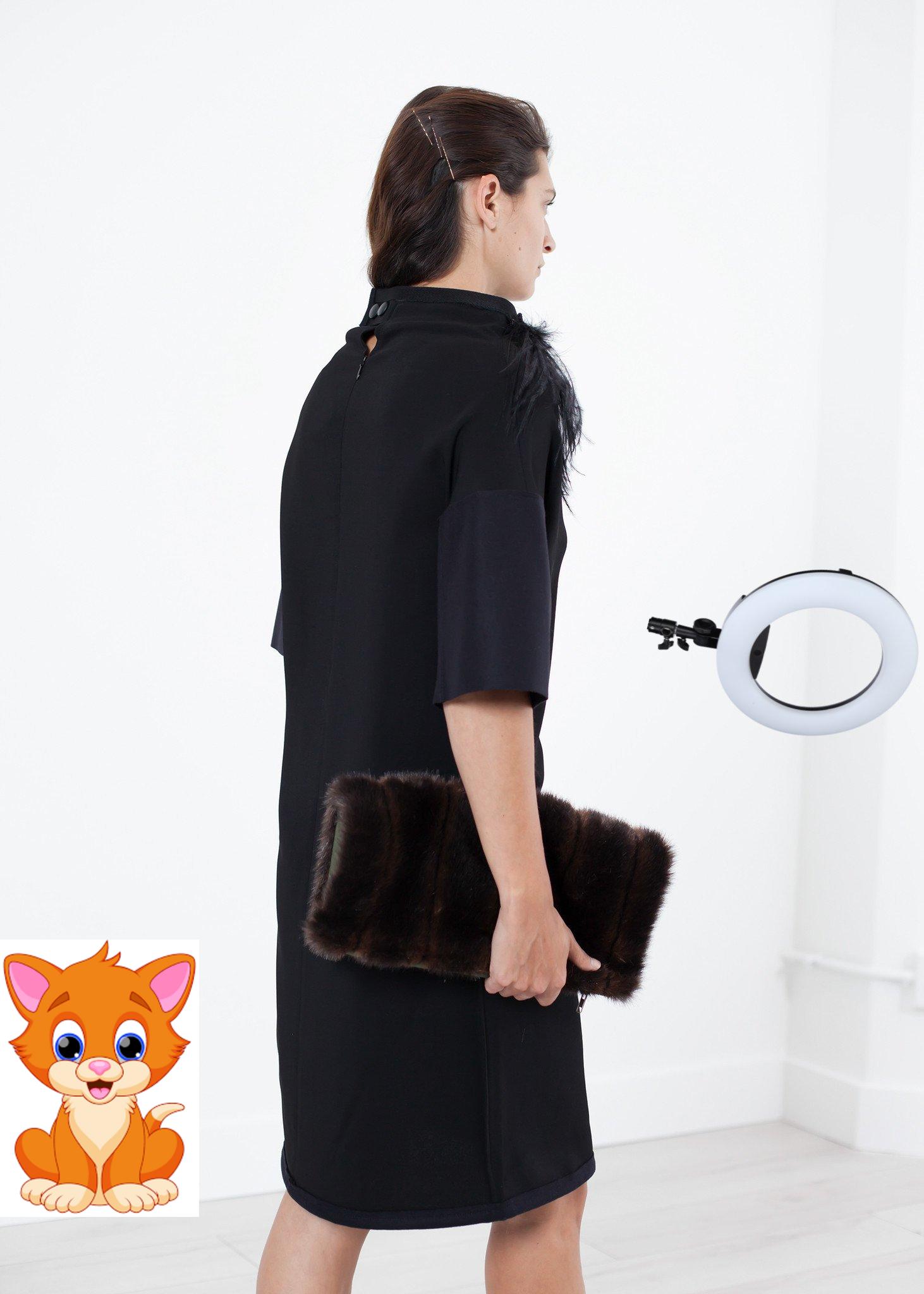 This tunic style dress is mischievously intended to blur the lines between what is practical in fashion and what is glorious. Adorned with an ostrich plumed collar that can be removed for versatility. Contrasting wool sleeves and a two snap closure above an invisible zip finish this simple shift. Ter et Bantine. Color Black. 50% Ostrich Plume, 90% Wool, 90% Viscose. Lana is wearing an Italian 42.