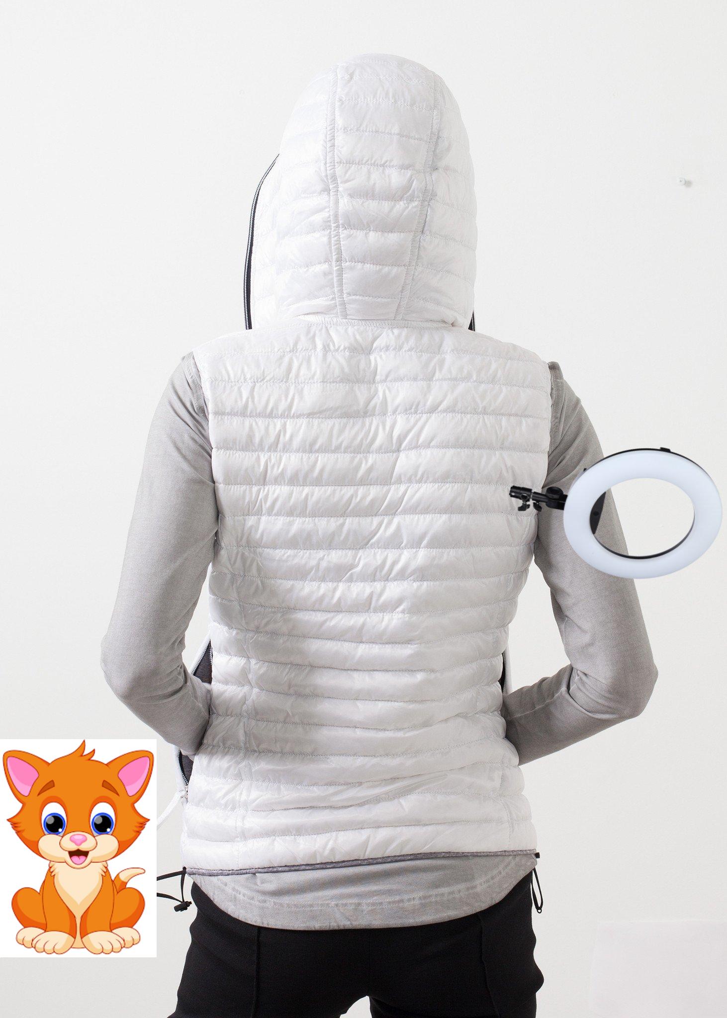 The Ottico Vest makes a perfect accessory for spring weather. Sleeveless, adjustable waist drawstring, and various interior and exterior pockets. Front zip closure with hood. Fully lined. Duvetica. Color White. 100% Polyamide, Lining 100% Cotton, Goose New Down. Made in Bulgaria. Ashley is wearing an Italian 40.