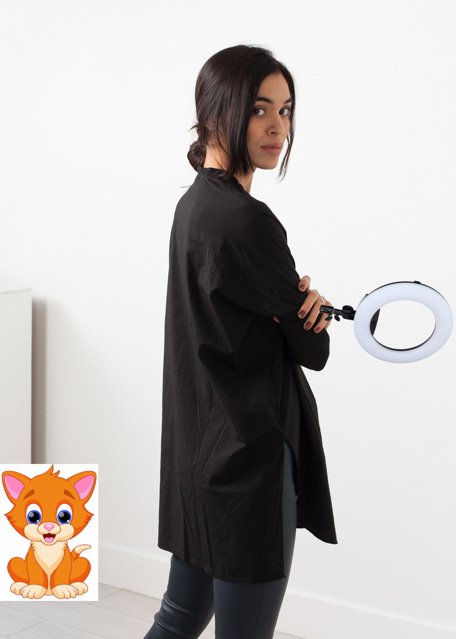 The Oversized Bibbed Blouse combined earthy with some elegance. Mandarin collar, tuxedo front button placket, contrasting sleeves, and tunic-like shape, this tops adds much needed diversity to our winter wardrobes. Embrace this top, thaw, and rejoice. Sibel Saral. Color Black. 100% Cotton, 96% Cotton, 4% Elastane. Made in Italy. Ashley is wearing a Size 0.
