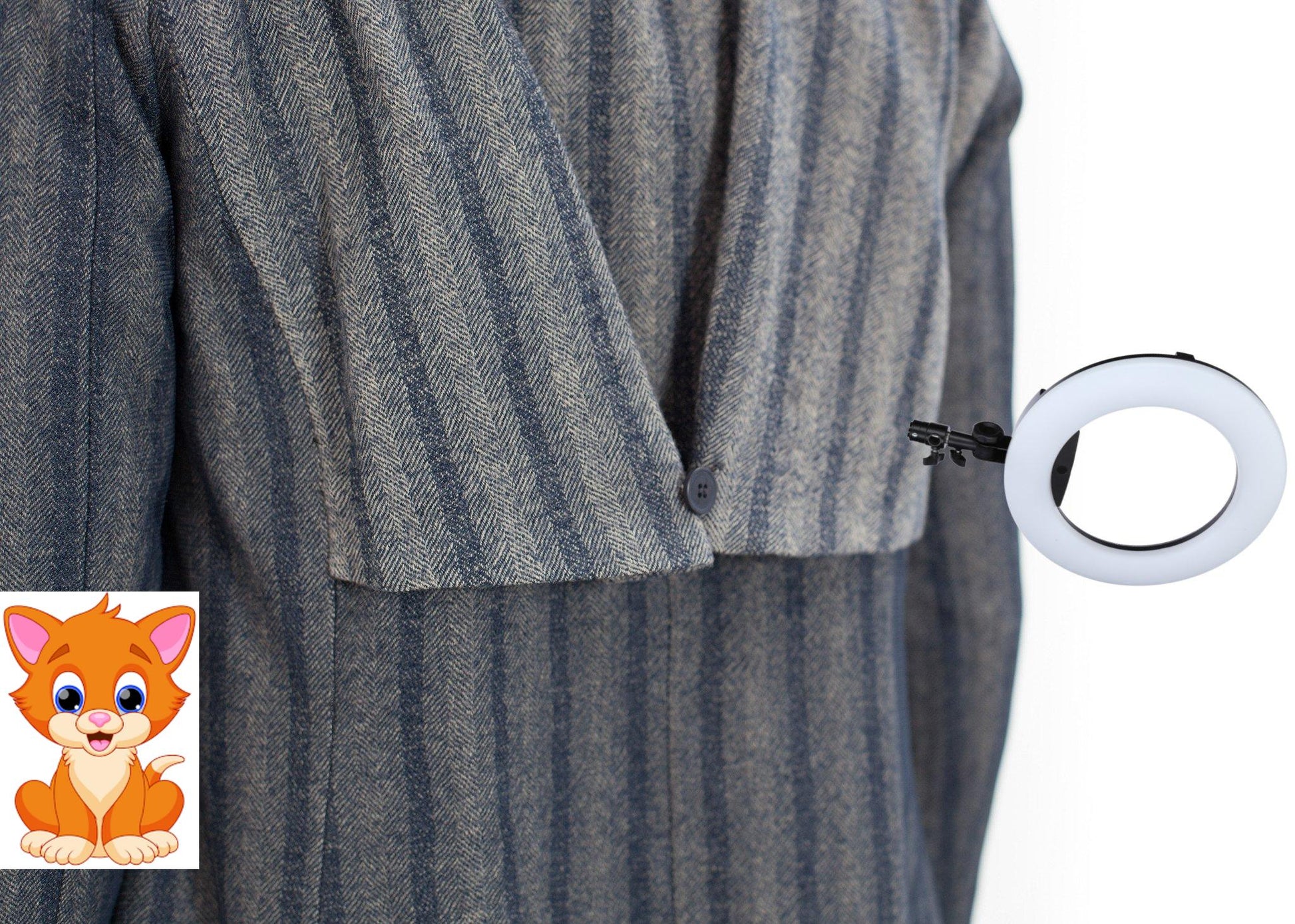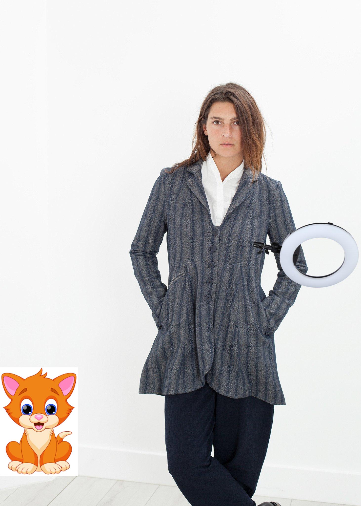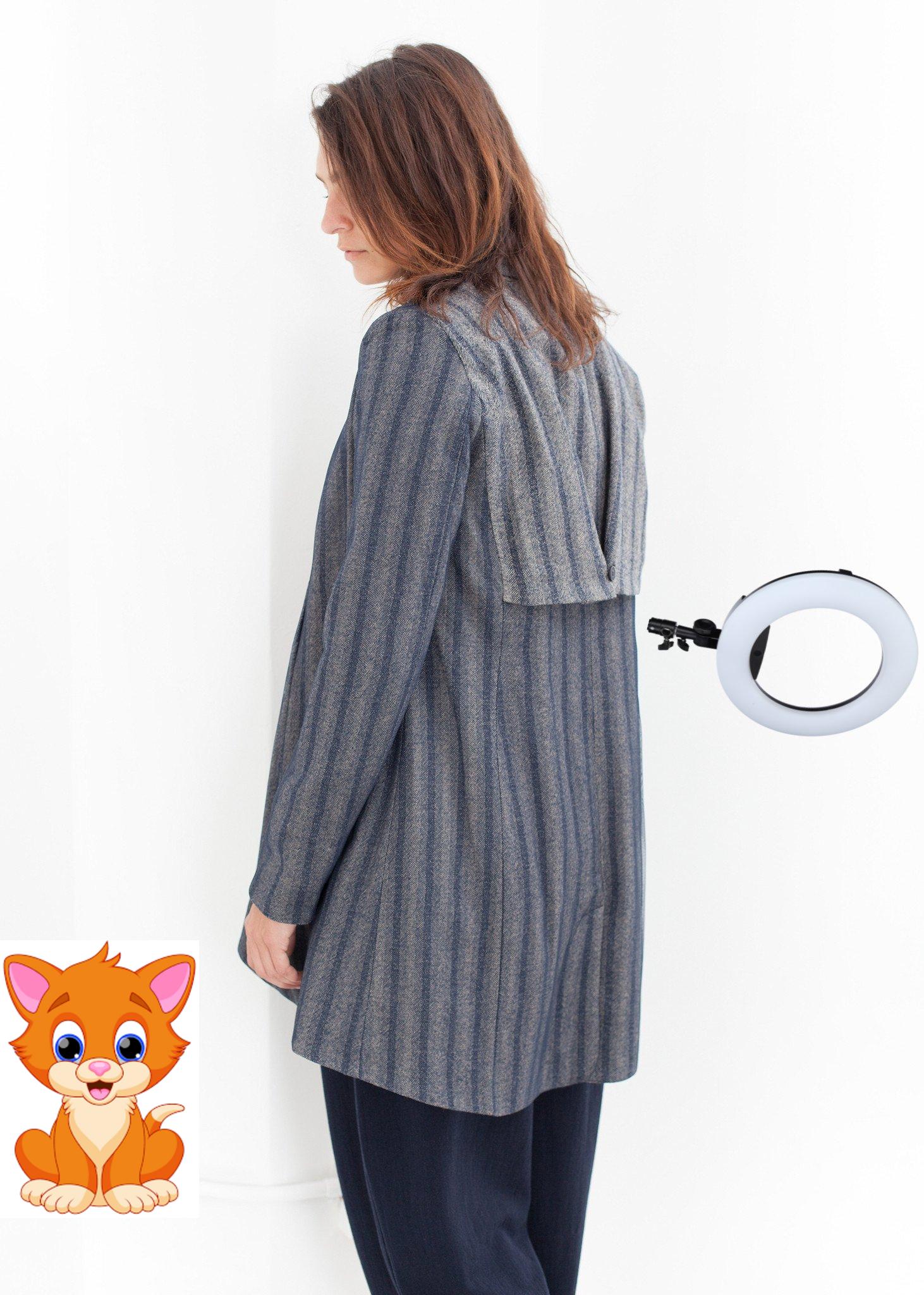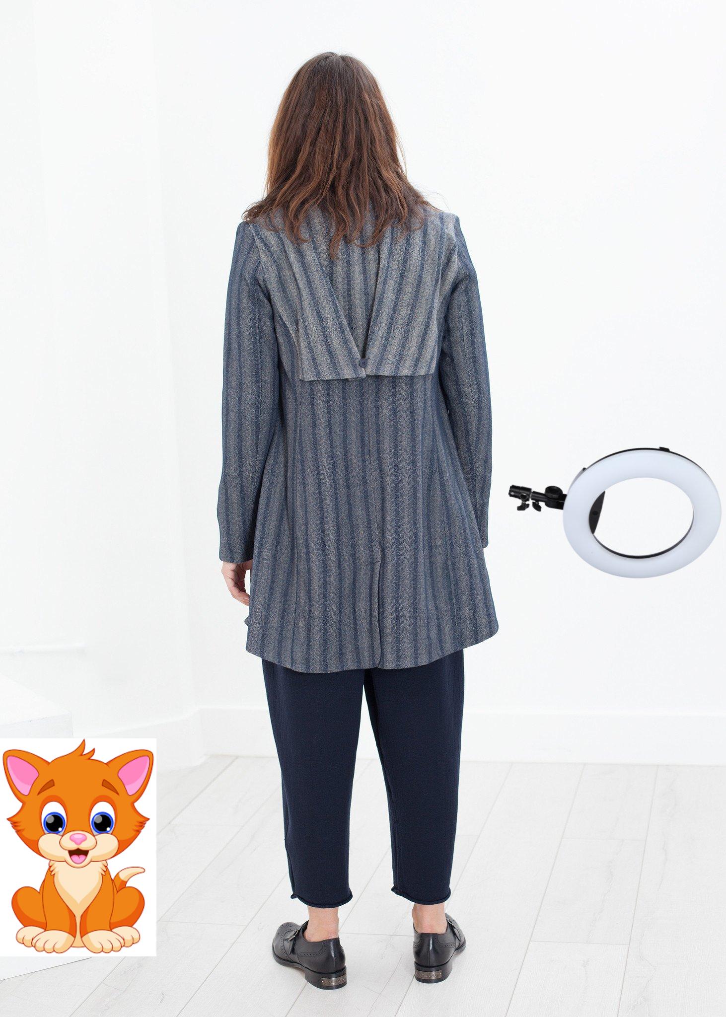 A stormy blue and gray striped coat has a rounded notched lapel, a five button closure and a slightly flared waist. One double welt pocket and a side seam pocket at the front. A single button storm flap and a back vent at hem. Lilith. Color Ink. 100% Virgin Wool, 100% Polyester. Flounce 75% Rayon & 25% Wool. Lining 67% Cotton. Lana is wearing an Extra-Small.