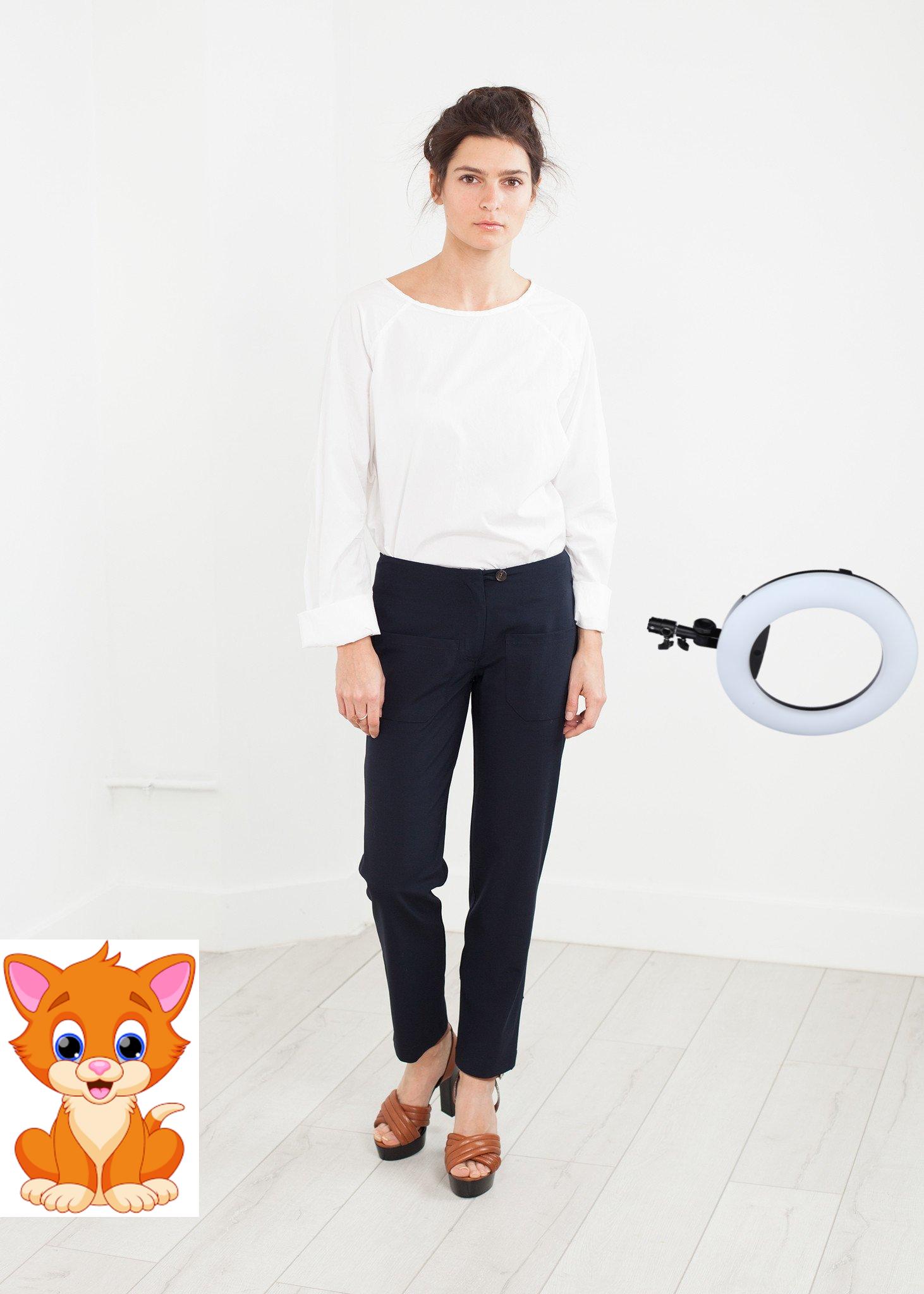This slim fitting pant hits comfortably just above the ankle. Back darts lead to flattering fit. Straight-on front pockets. Single button fly air closure at front. Back pockets. Harvey Faircloth. Color Navy. 100% Wool. Pocket Lining, 100% Polyester. Made in U.S.A. Lana is wearing a size 2.