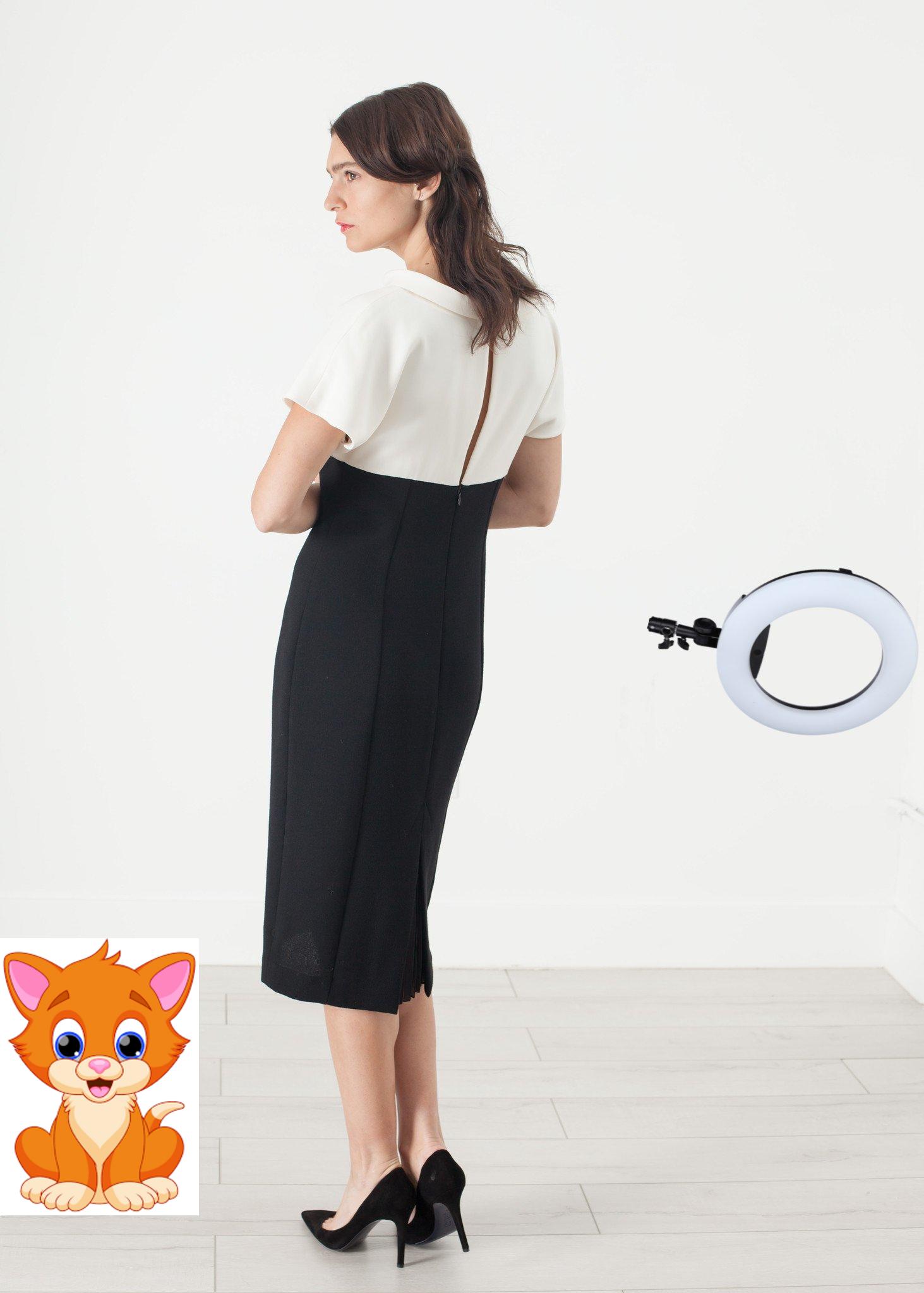 The Pearl Fastened Dress is organically graceful. Slim fitting throught the knee, this piece envokes an exquisite silhouette. Beautiful seaming, dolman sleeves, and slight opening with pearl button closure at back neck. Graceful self-fabric collar. Amelia Toro. Color Cream/Black. 100% Wool, 80% Wool, 20% Polyester. Made in Columbia. Lana is wearing a Size 4.
