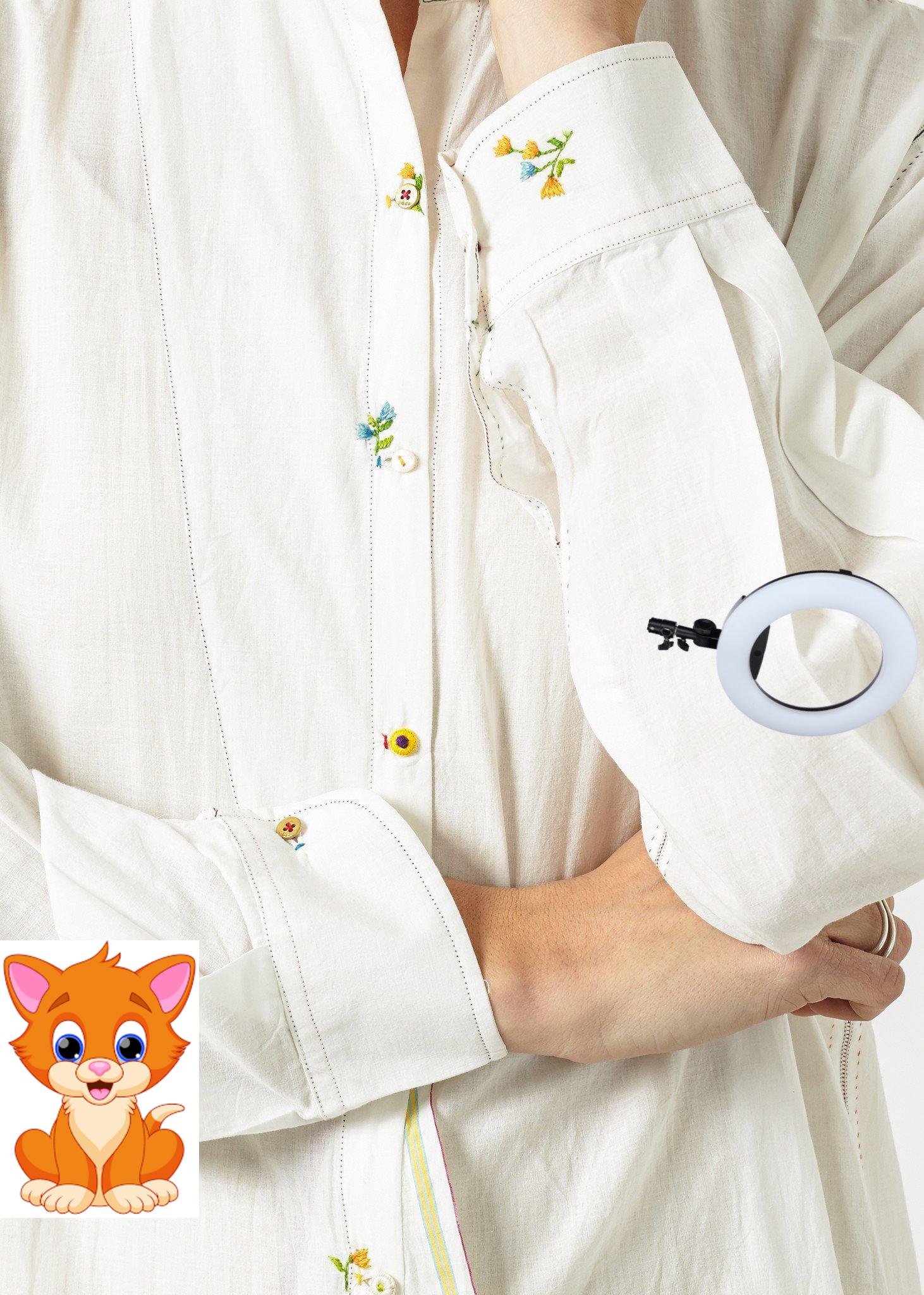 This tunic top provides just enough color to hint warmer temperatures while remaining universally seasonless. Intricate paneling and asymmetrical layers throughout adds to the piece's eclecticism. Completely handmade, stitched, and embroidered. Long sleeves with tailored cuffs, side slits, loose silhouette. Single button placket opening. Tailored collar. Pero. Color White. 100% Cotton. Made in India. Lana is wearing a 38.