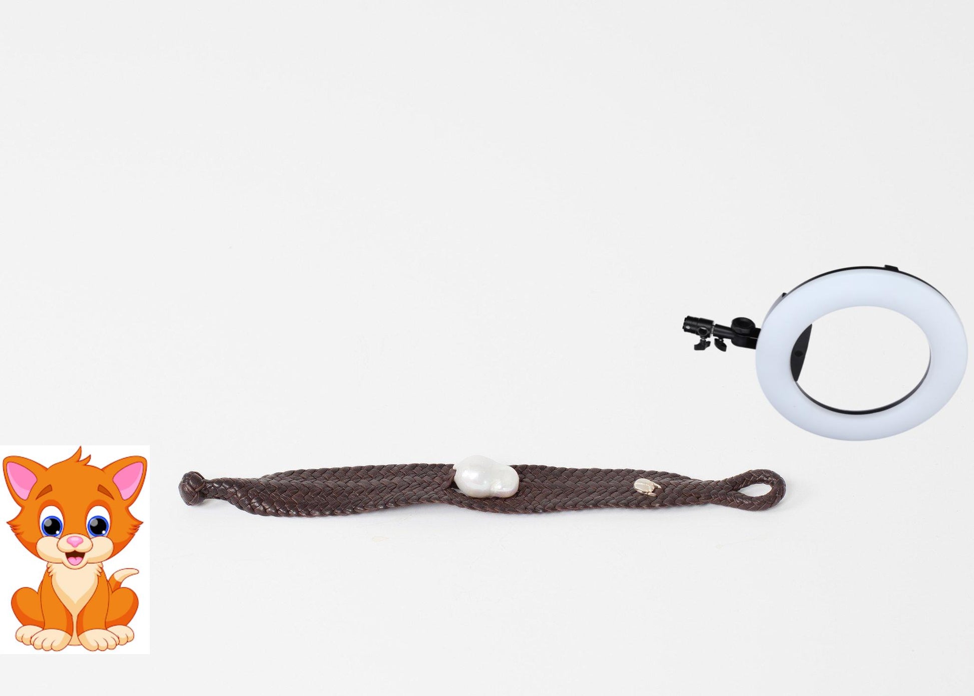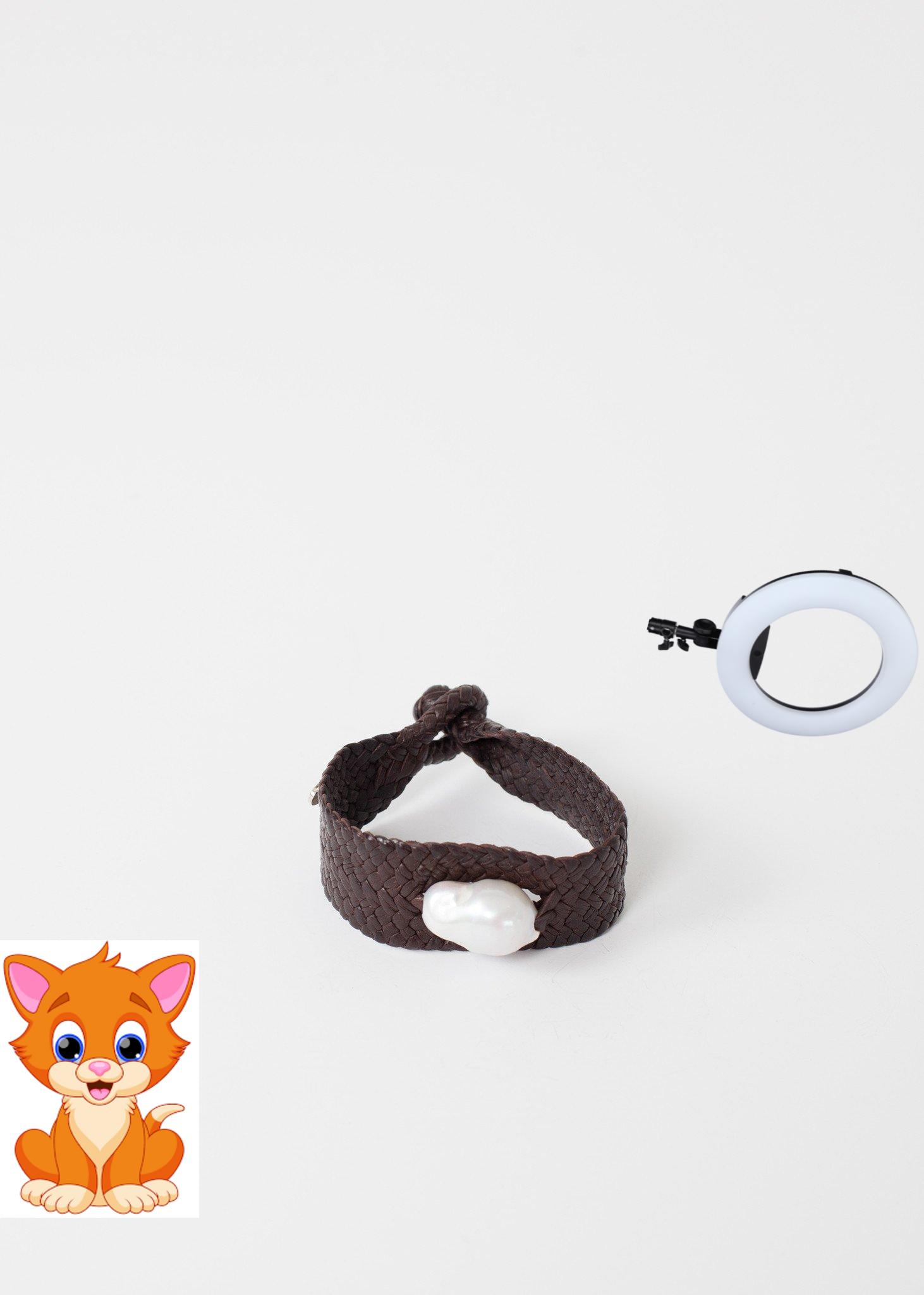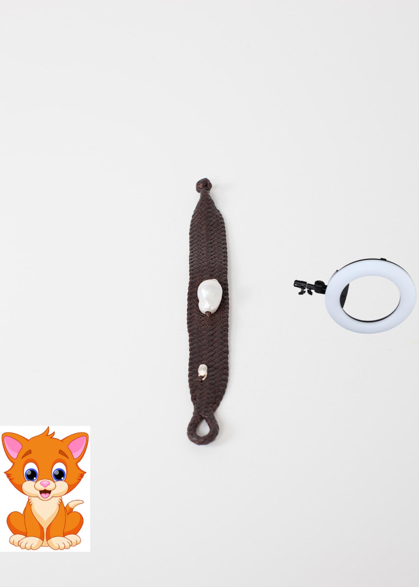 Kalosoma Jewelry demonstrates the rigorous beauty in the handmade. Braided leather acts as the canvas for an asymmetrical pearl. Scarab detail. Knotted closure. Color Brown. 100% Leather. Made in Mexico. Length 7 1/2 inches.