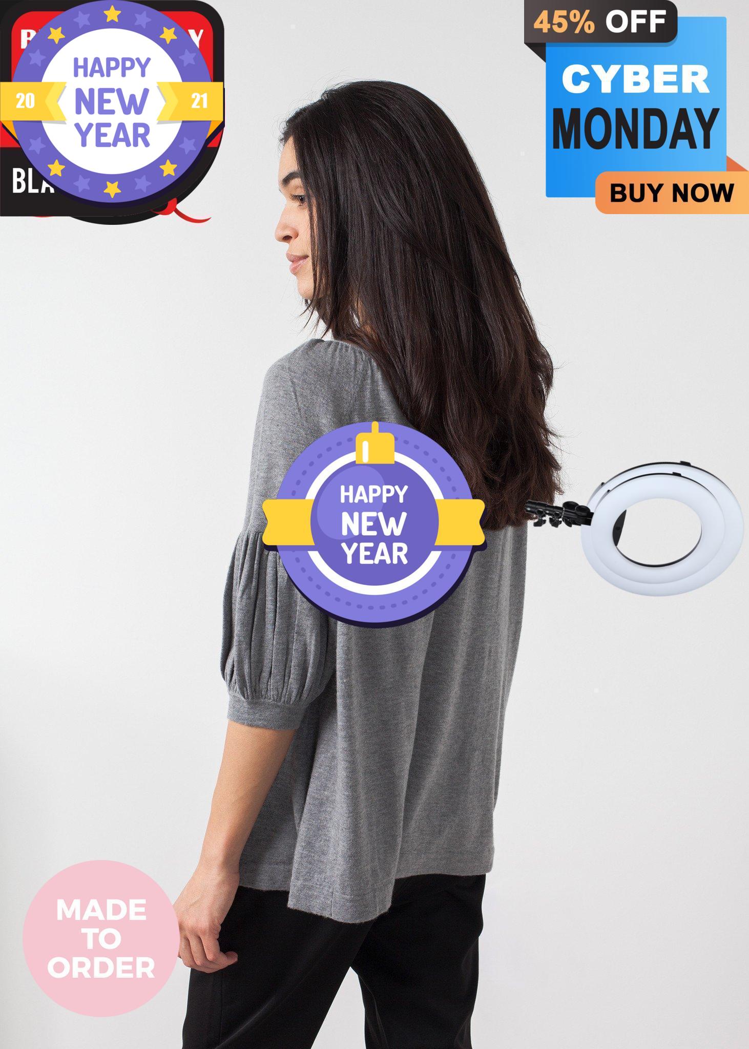 Channel your inner bohemian with the spirited elegance of this piece from Co. Gathered at the neck, this top offers an oversized silhouette. Raglan sleeves with puffs. Single button closure at center back. Color Grey. 100% Cashmere.