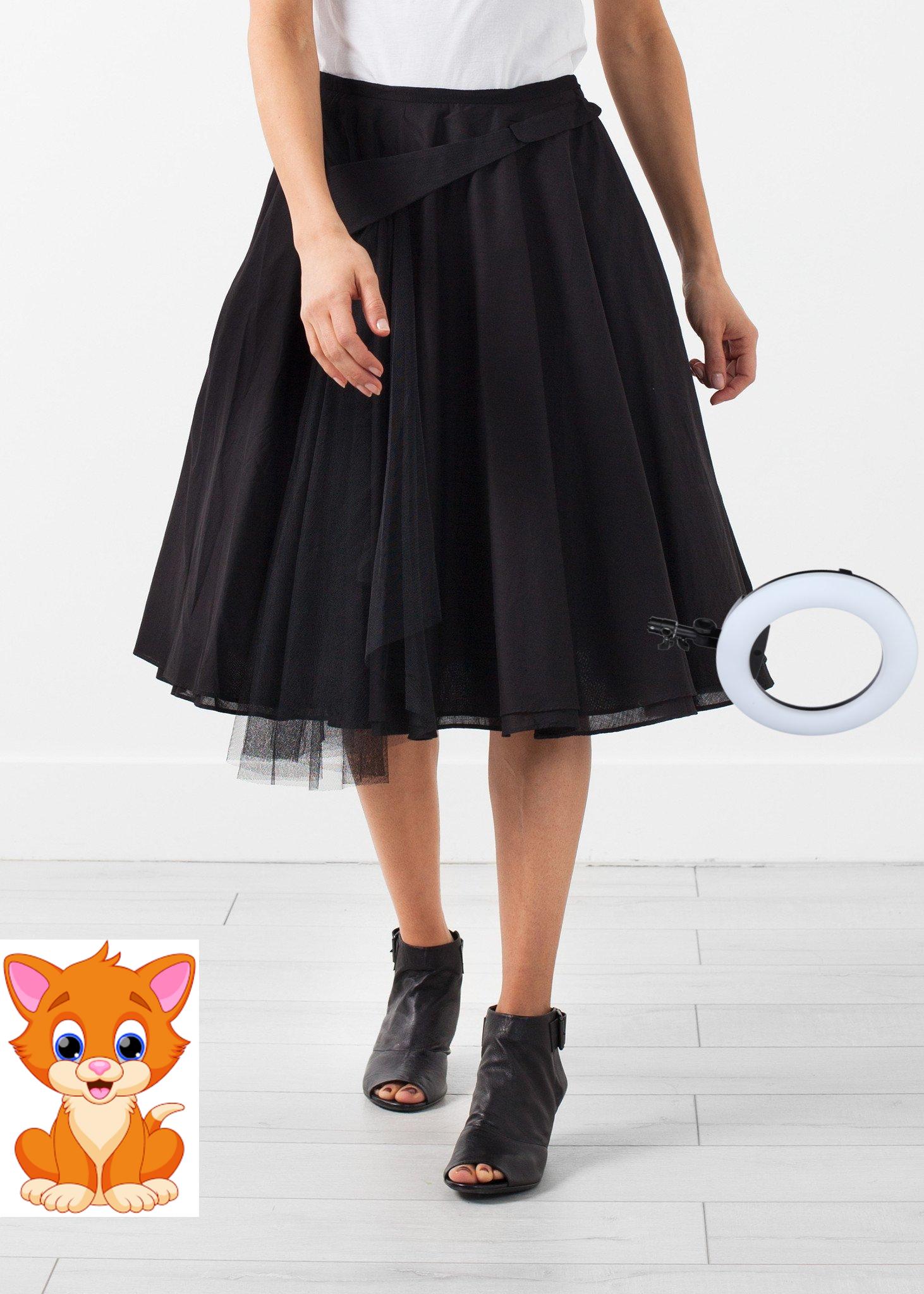 The Releve Skirt is knee length with a full swirl skirt. From dancing to daywear, this piece is a stunner. Gathered tulle detail at front right. Lined. Lilith. Color Black. 100% Polyester. Ashley is wearing an X-Small.