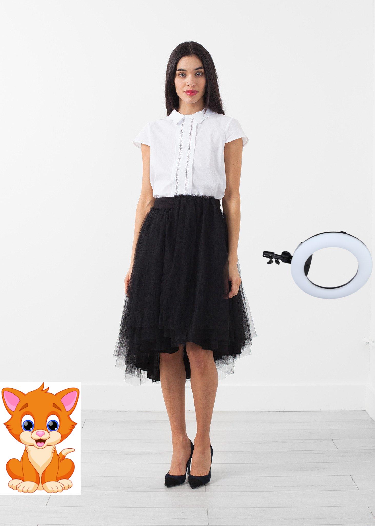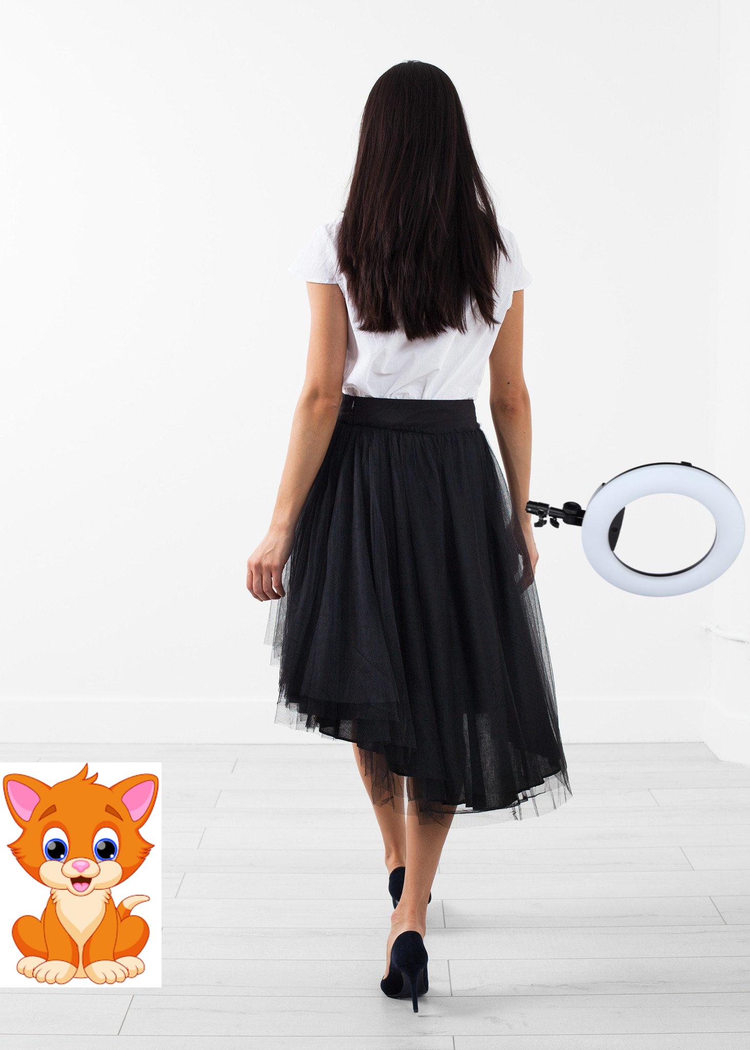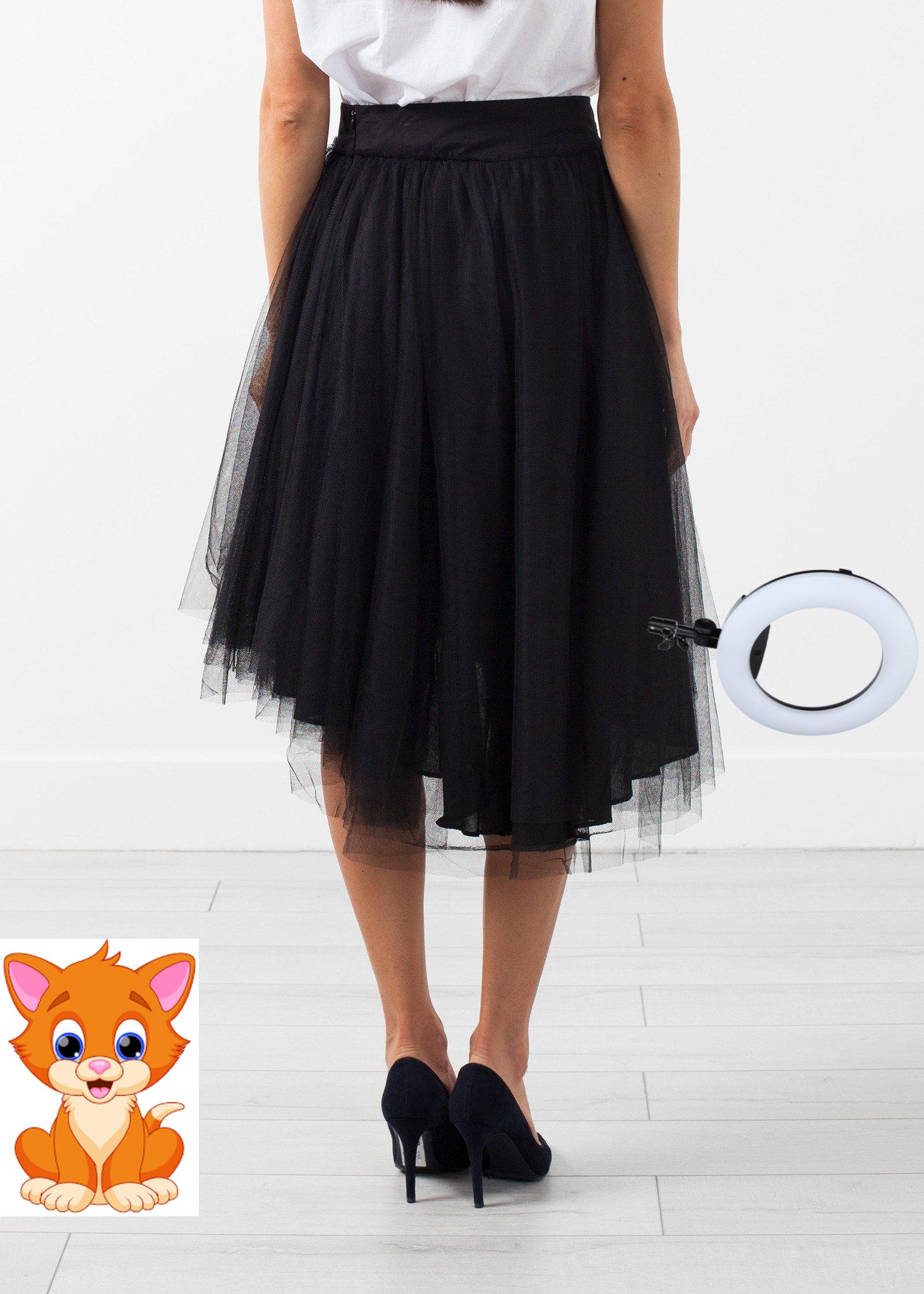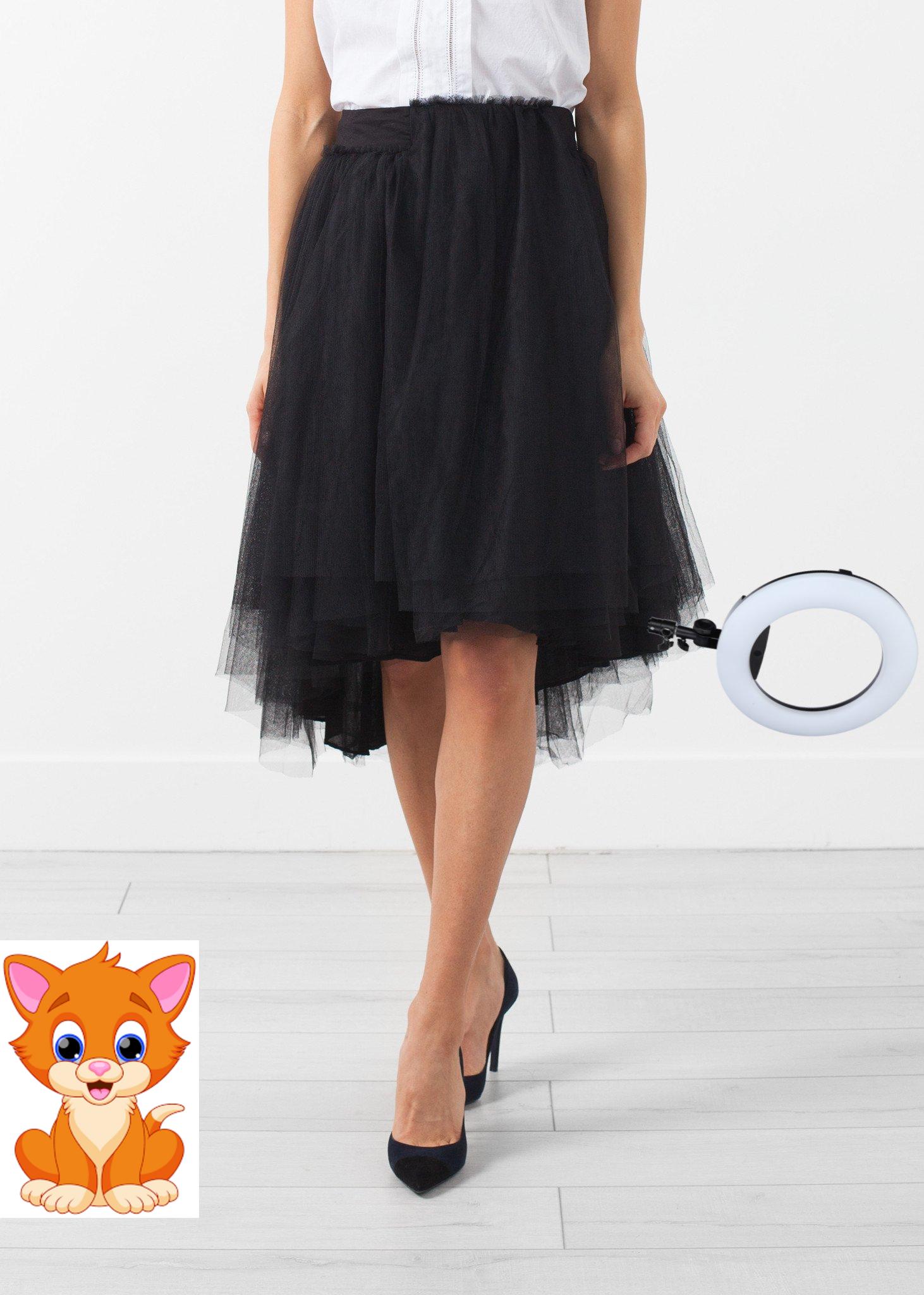 Tulle overlay with layers upon layers of dancing dreams. Invisible zip closure at left side. Lilith. Color Black. 100% Cotton, Tulle 100% Polyester. Ashley is wearing an X-Small.