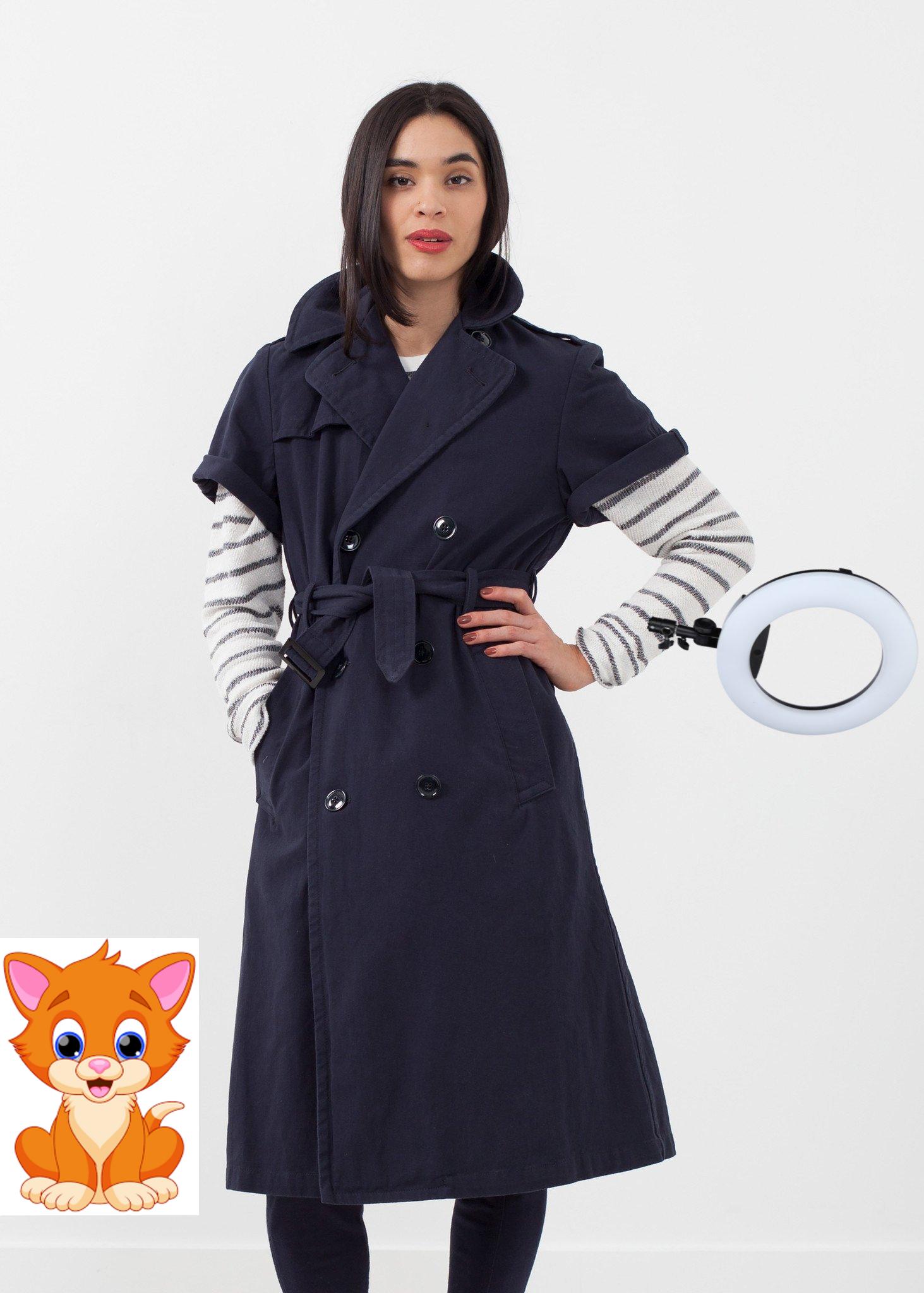 The Trenchcoat presents a feminine army casual as a overcoat or statement dress. Double button closure at front. Adjustable belt at waistband. Side angled pockets at front. NLST. Color Navy. 100% Cotton. Ashley is wearing an X-Small.