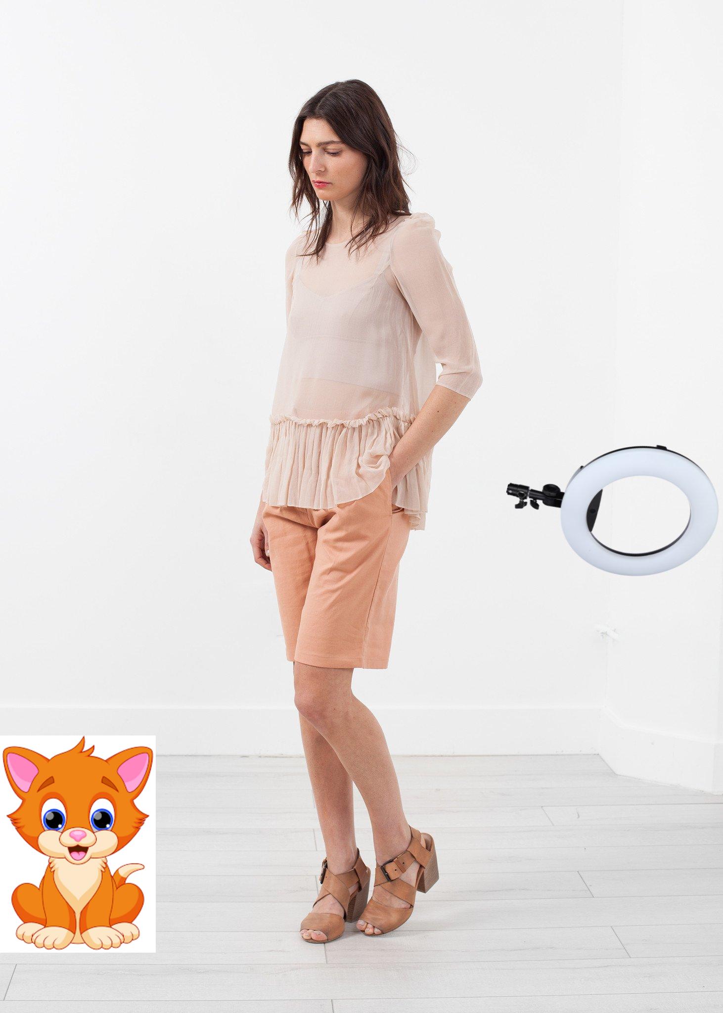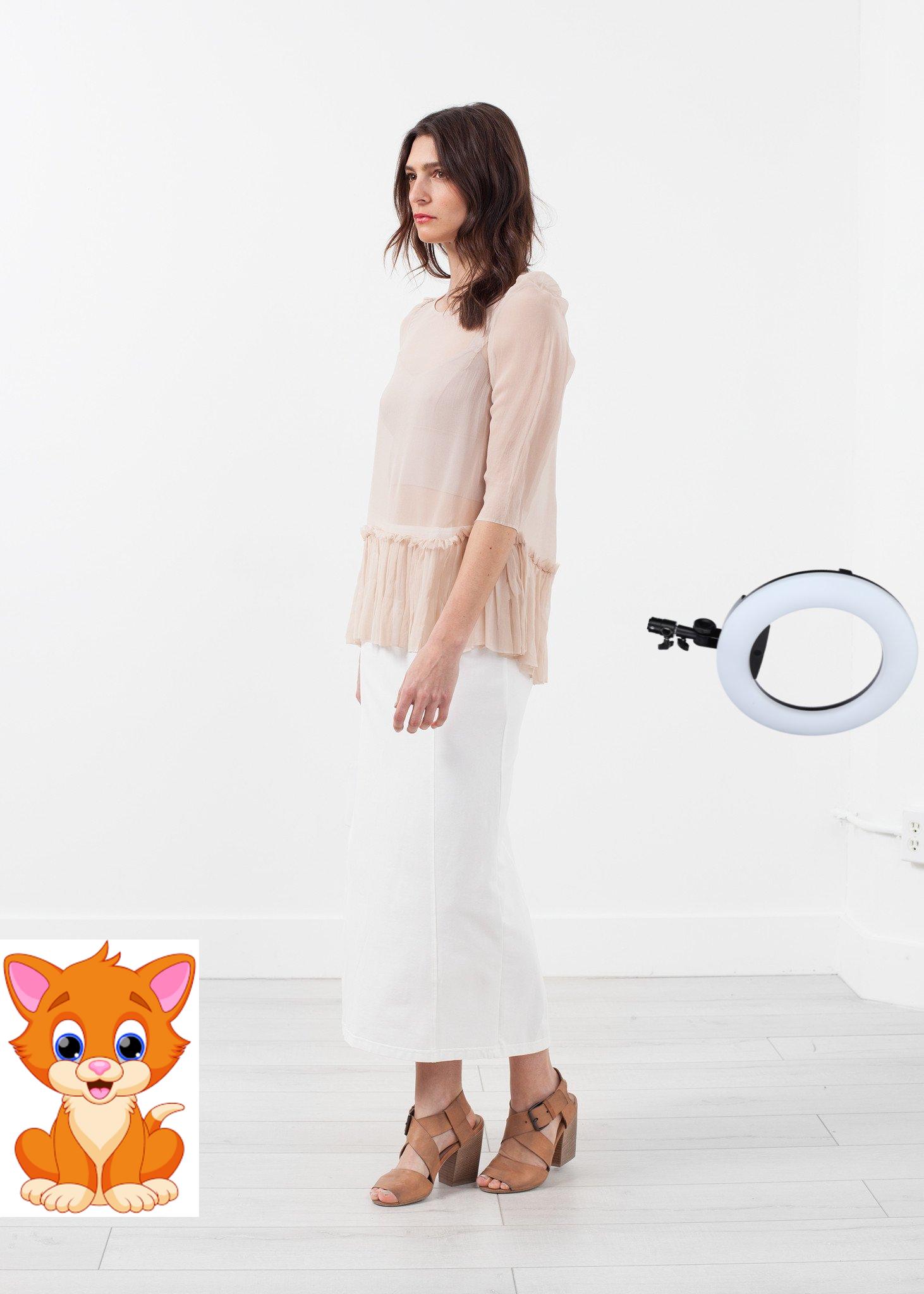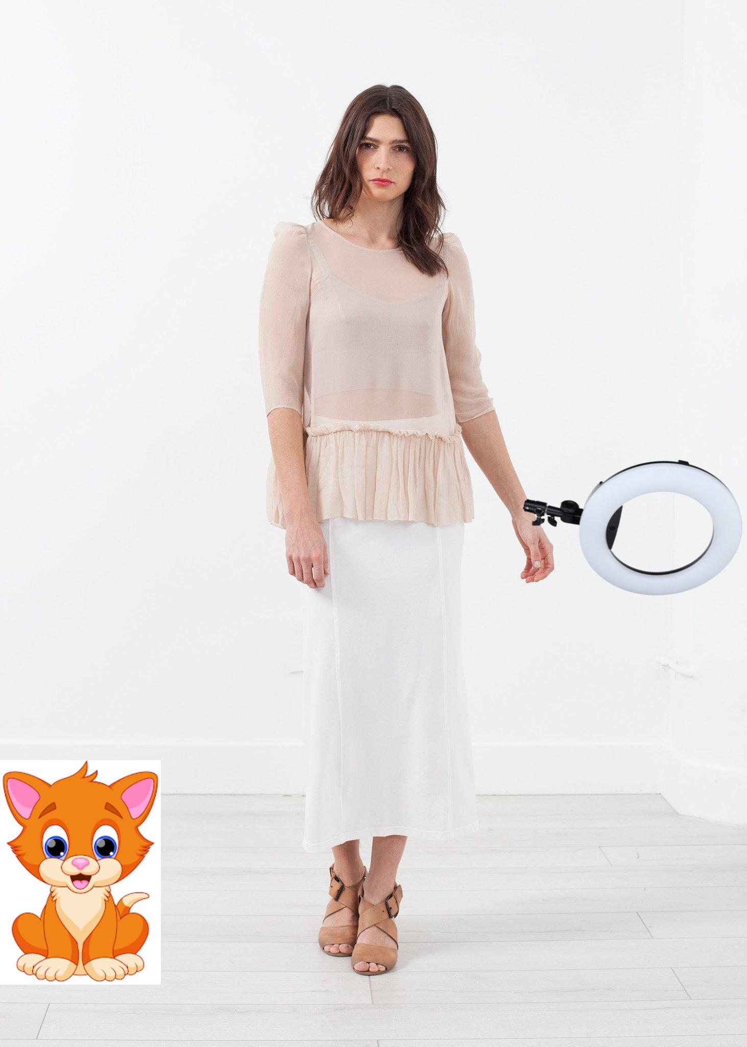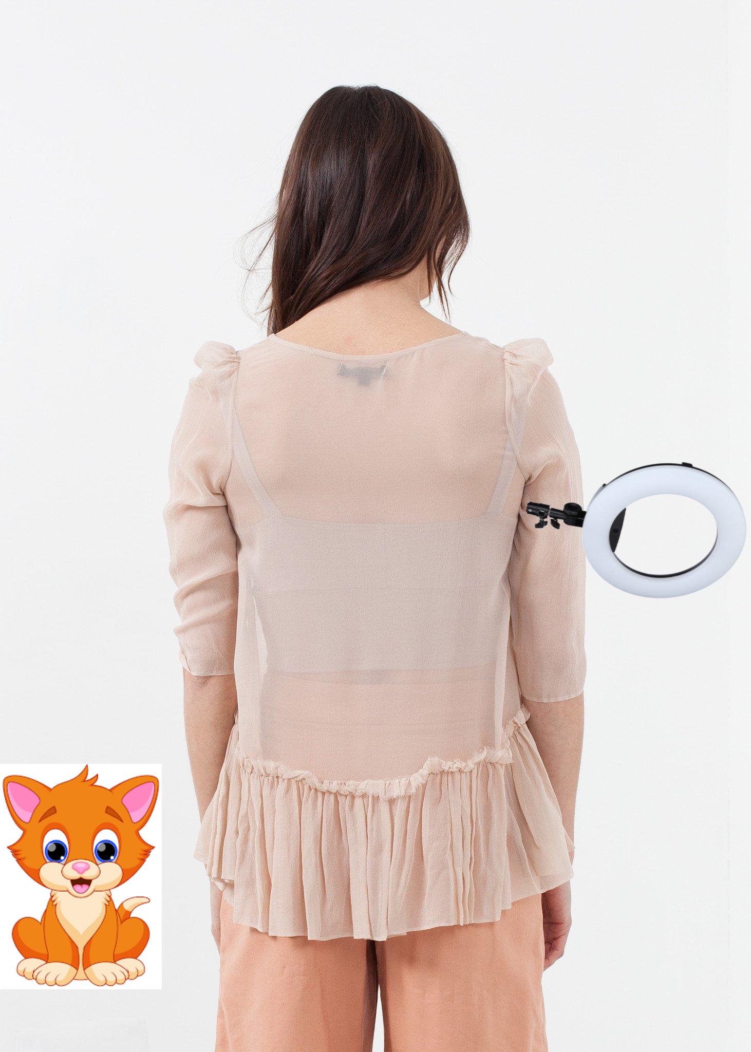 Louiza Babouryan offers a sweet cacophony of artistic vision for her Spring/Summer 2015 line. Dreamy pieces paired with flowing silhouettes invites to indulge on that delicious side. The Ruffle Top is a sheer beauty with a whimsical ruffle along the hem. 3/4 inch sleeves. Color Sand. 100% Silk. Made in U.S.A. Lana is wearing a Small.