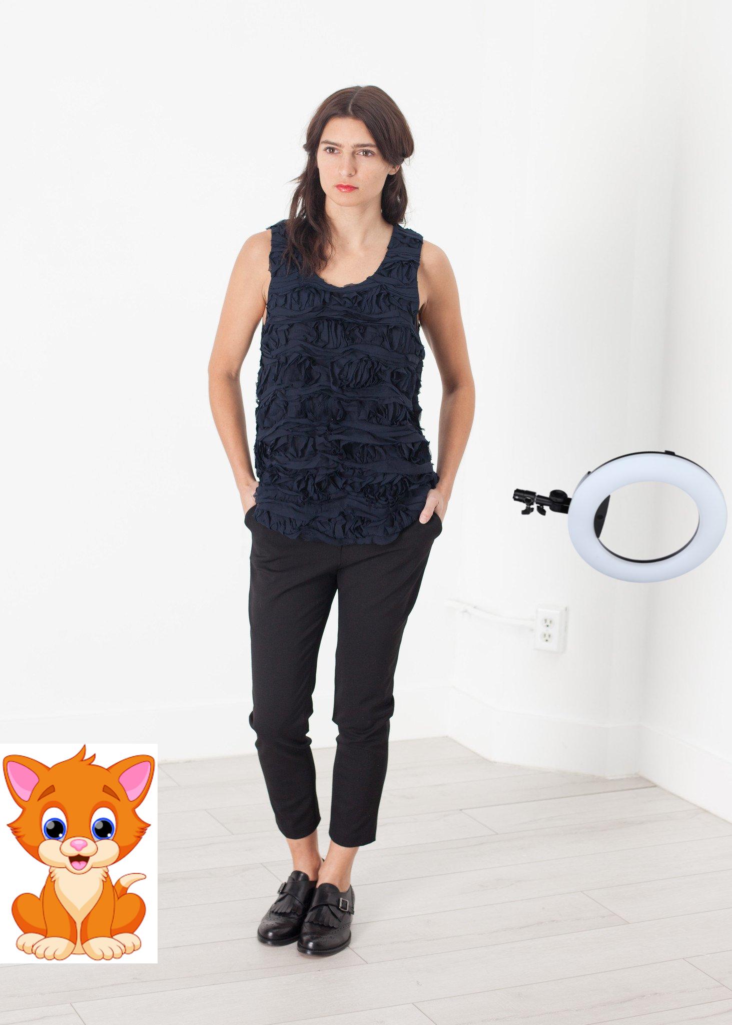 Lovely ruffled layers compose this otherwise basic staple. Made for diverse weather, this tank is the ideal carryover piece. Skirt-tailed back hem. Invisible side zip opening for easy in and out access. Harvey Faircloth. Color Navy. 100% Polyester, 100% Silk, 100% Polyester. Made in U.S.A. Lana is wearing a Size 2.