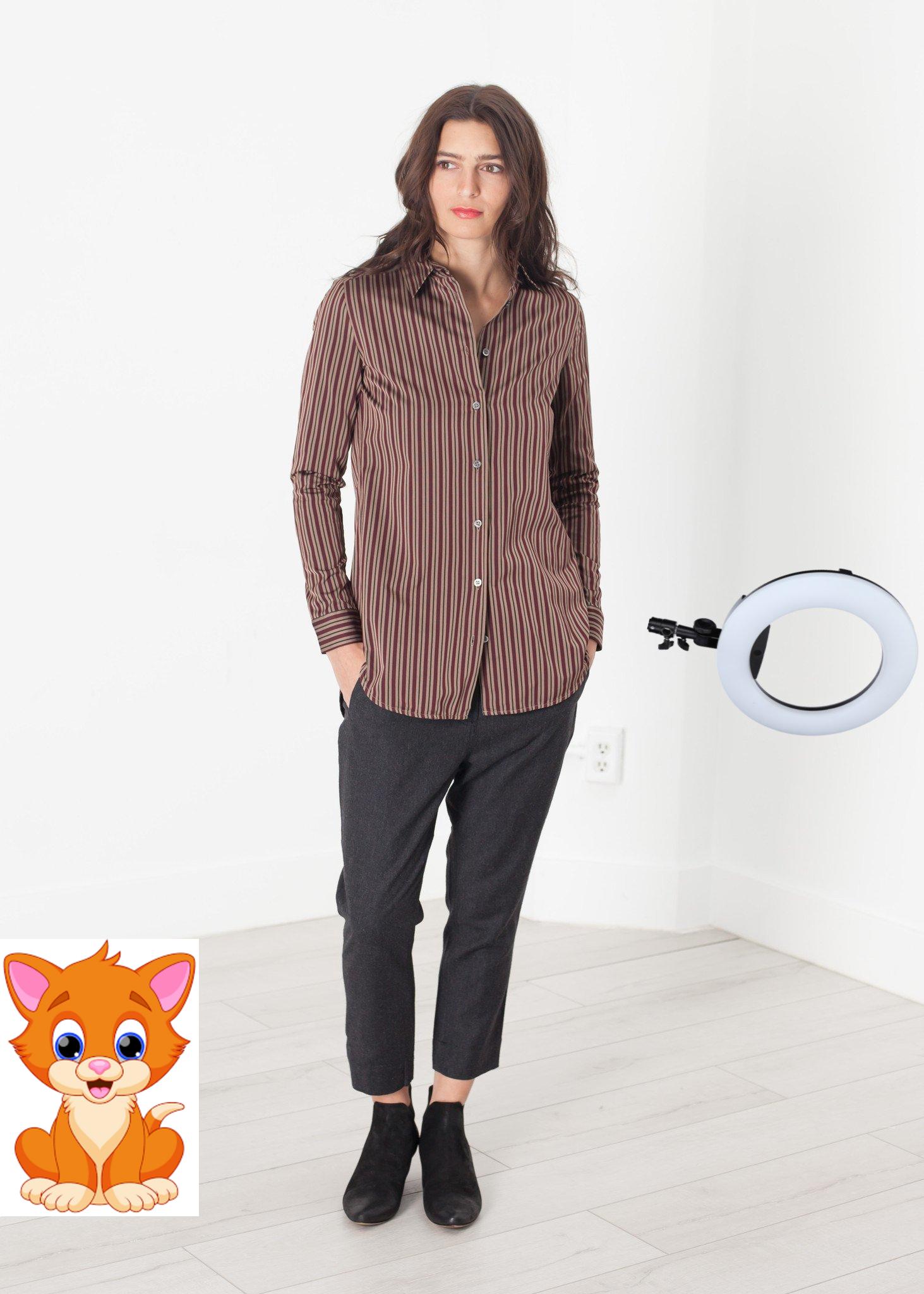 Classically tailored to modern perfection. The Sheen Button-Up by Hache maintains the borrowed shirt look with feminine details. Slightly there slits at cuffs. Silk-like hand. Single front button placket opening. Back yoke. Hache. Color Red/Tan. 100% Polyester. Made in Italy. Lana is wearing a Size 38.