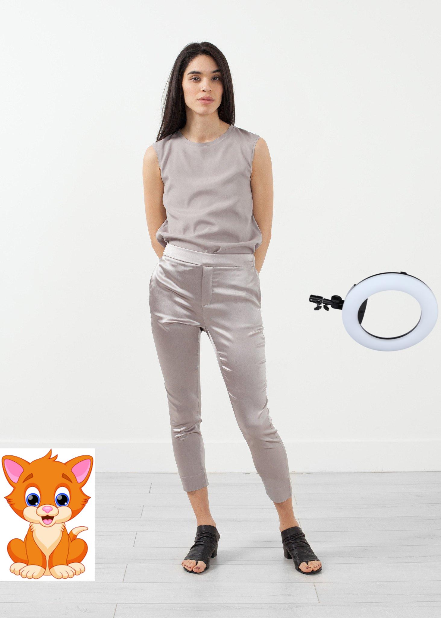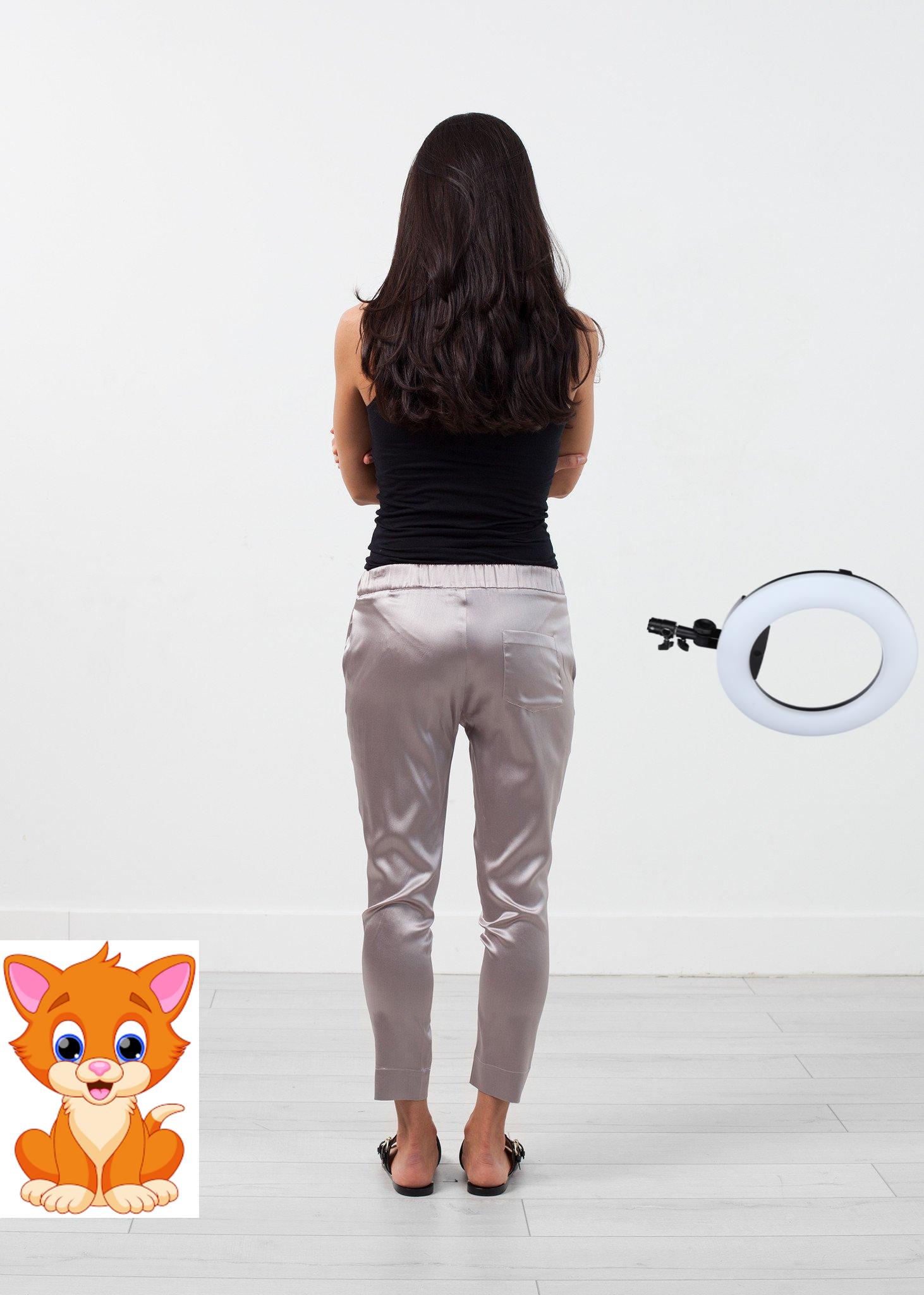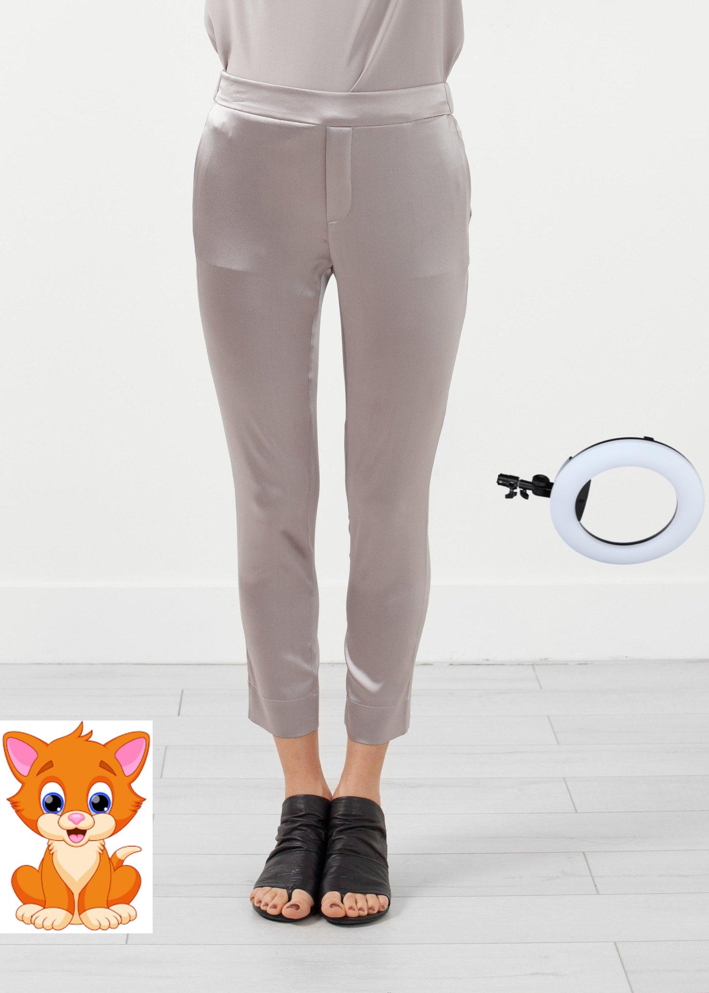 The Silk Pant is a slim pant with slight drop. Elastic waistband for ease. Side angled pockets with coin pocket at front, one exterior pocket at back. Sibel Saral. Color Silver. 94% Silk, 6% Elastane. Made in Turkey. Ashley is wearing an X-Small.