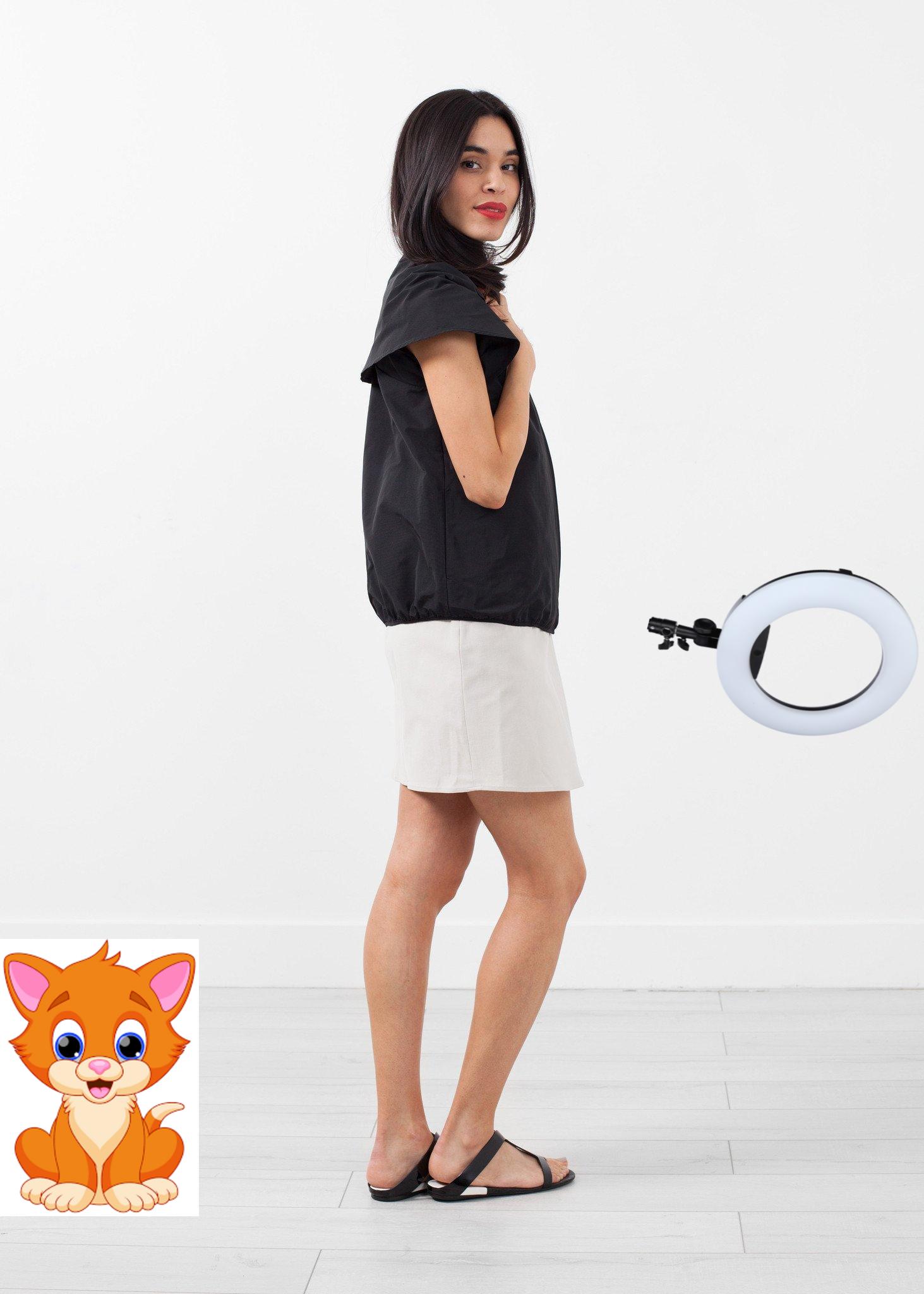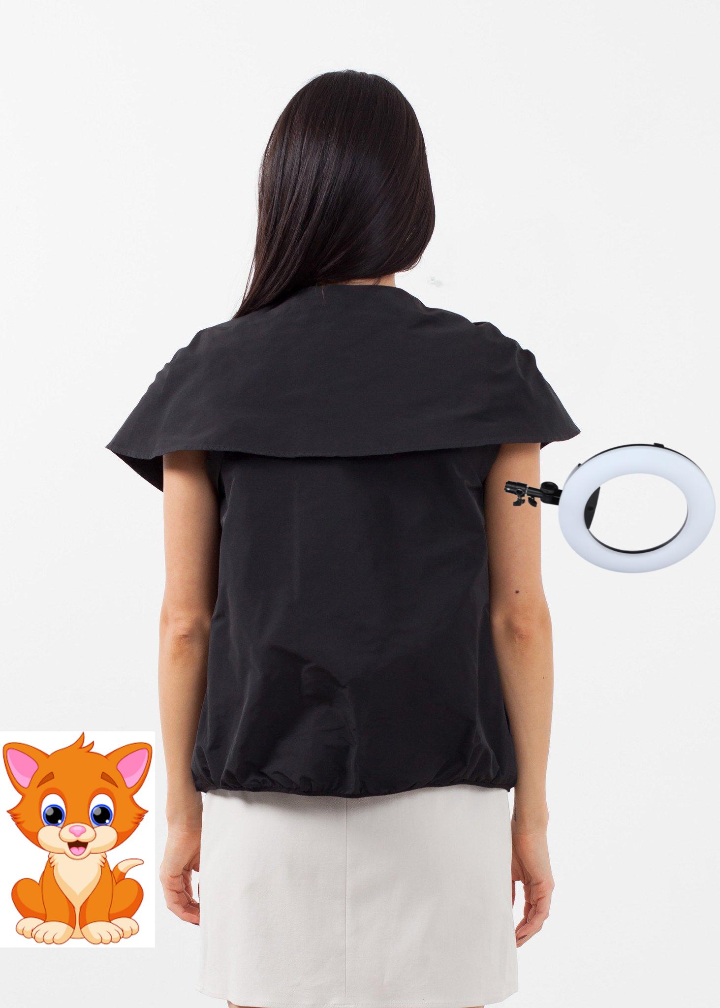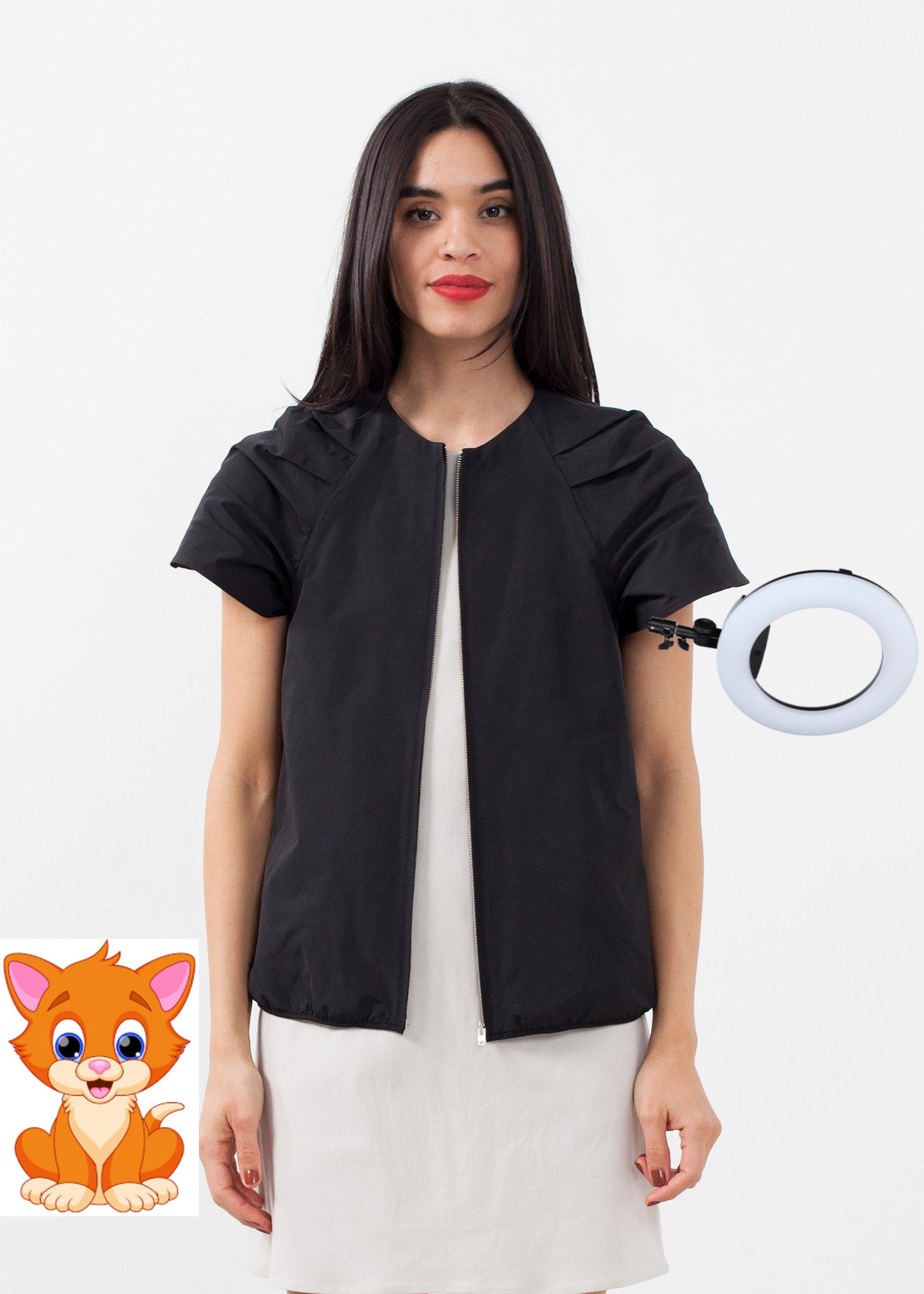 The Front Zip Blouse is a fun statement piece with beautiful pleated sleeves and convertible soft cape collar. Crew neckline. Invisible zip closure at front. Side angled pockets at front. Hache. Color Black. 100% Polyester, Lining 100% Cotton. Made in Italy. Ashley is wearing a Size 40.